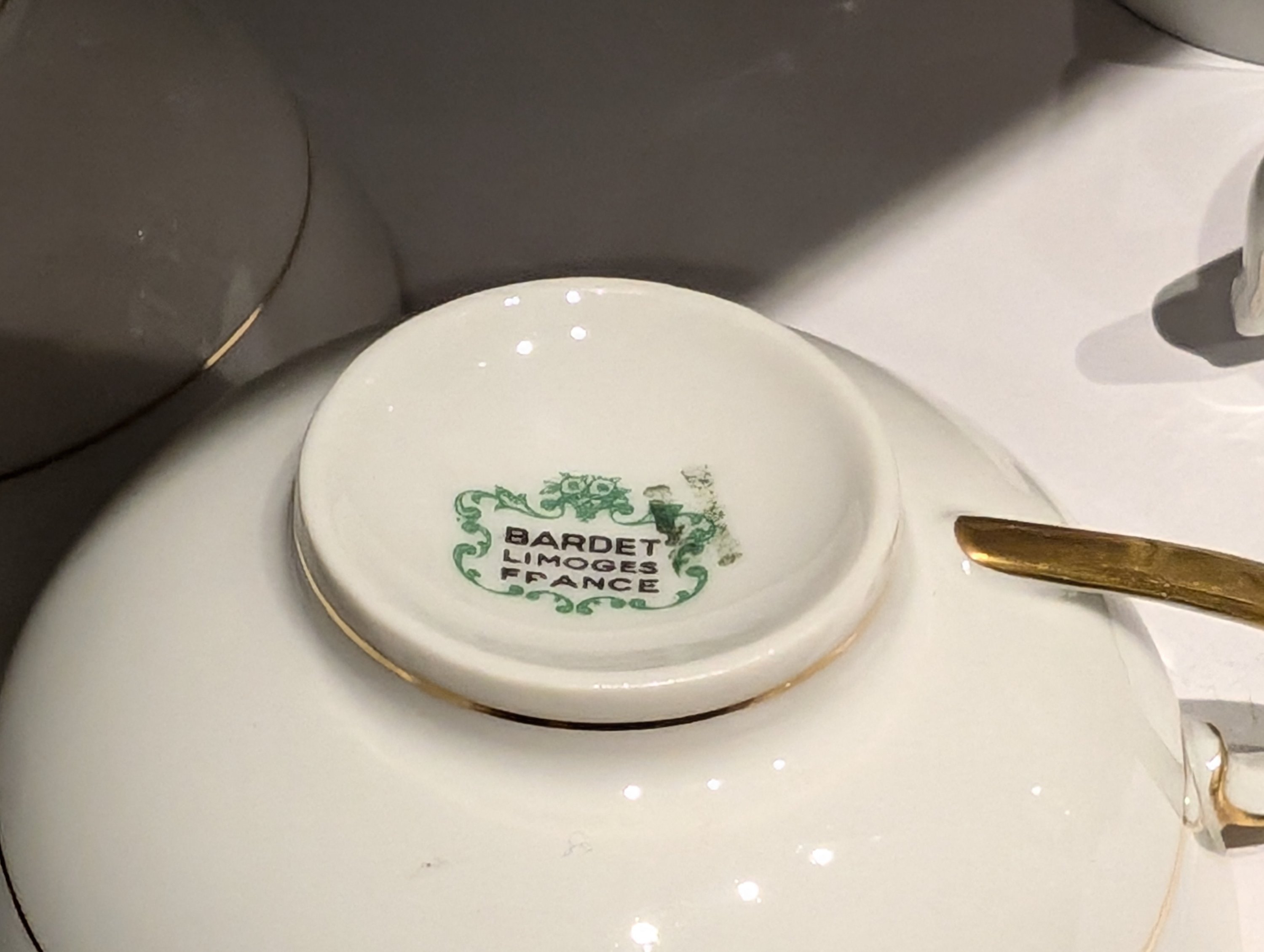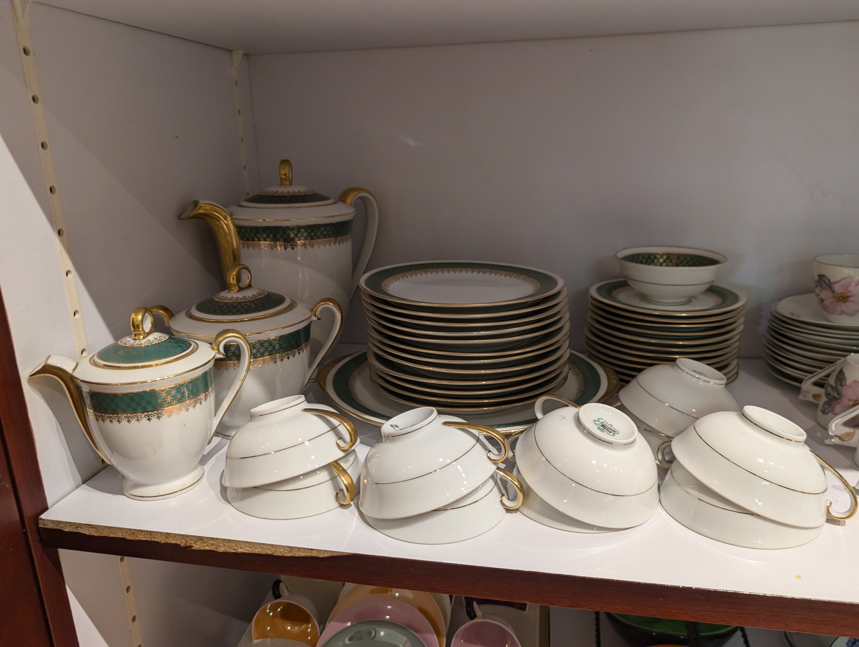 en porcelaine blanche, verte et dorée comprenant tasses, soucoupes, verseuse, pot à sucre et pot à lait.