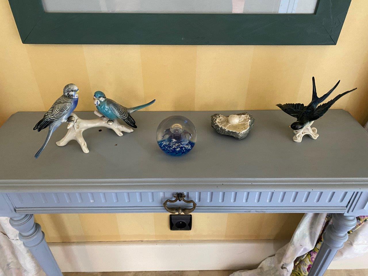 composés de deux sujets d’oiseaux en porcelaine, un presse papier et une pierre.