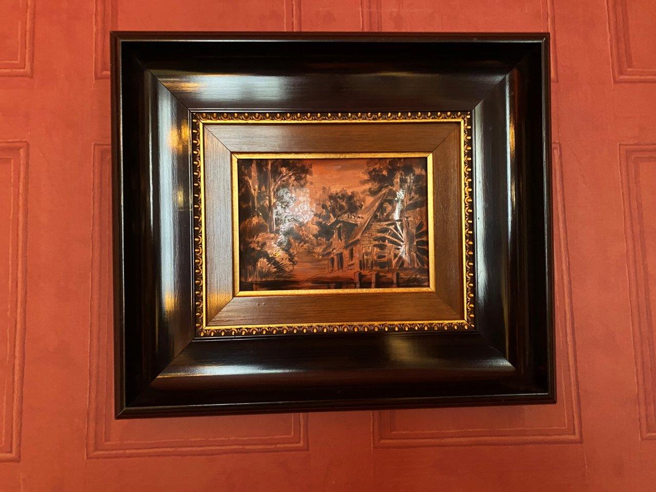 à décor d’un moulin. Dans un cadre en bois noirci.