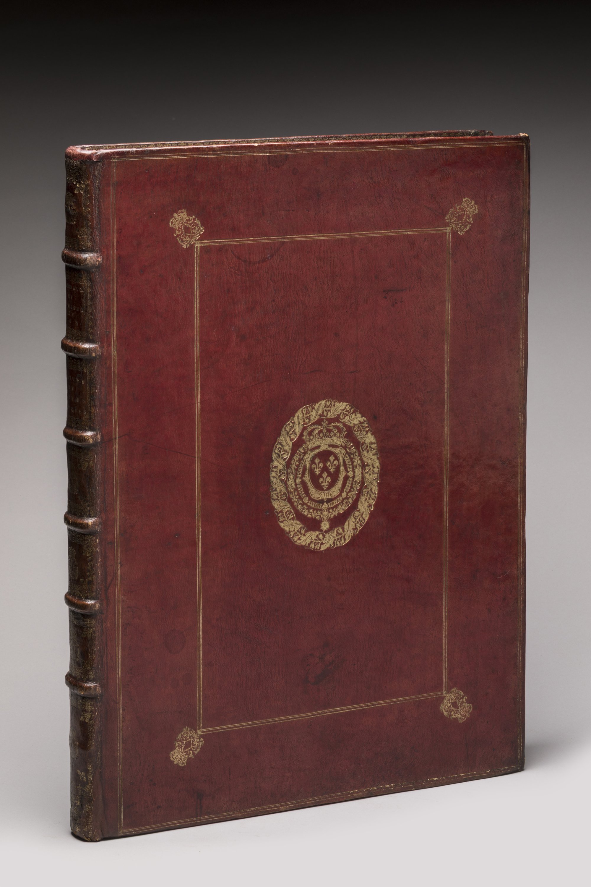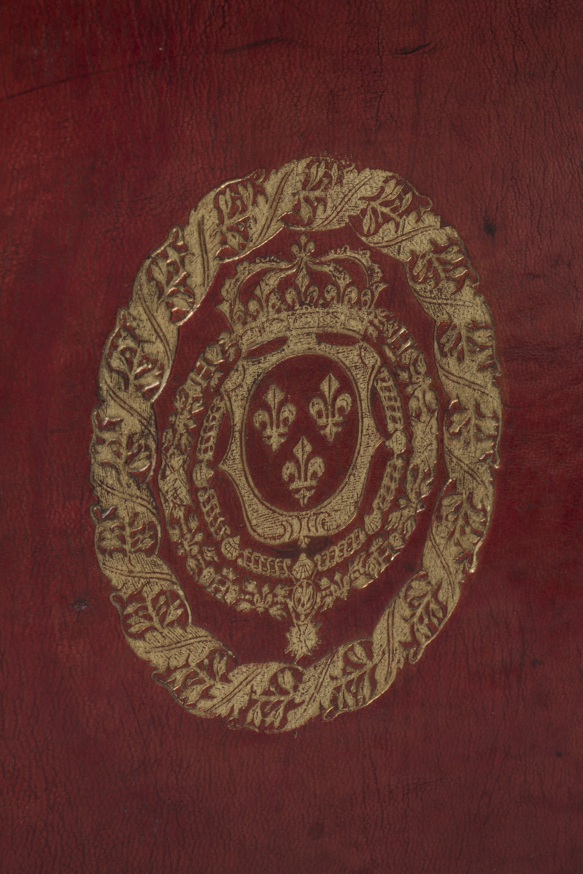 Grand in-folio (540 X 390 mm). Titre et 18 pages de texte, 32 planches de tableaux, un bon nombre sur double page (par divers ; datées de 1677 à 1682) ; 60 planches de sculptures (par Mellan, datées de 1669 à 1675, ou par Baudet, datées de 1677 à 1681). Plein maroquin rouge, double encadrement de filets droits avec fers armoriés dans les angles de l'encadrement intérieur ; grandes armes royales au centre des plats. Dos très orné de fers royaux dans les entre-nerfs.