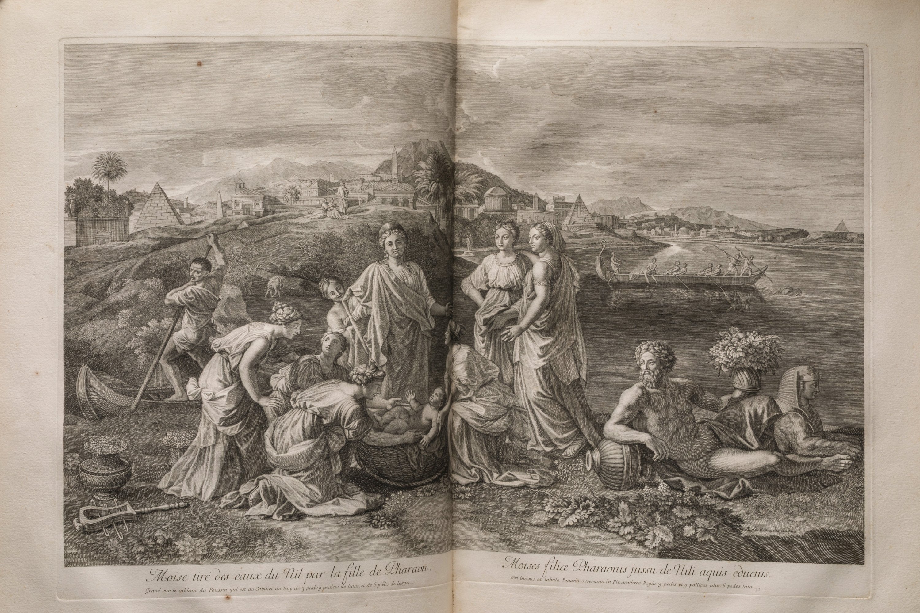 Le début de cette immense entreprise, toute à la gloire du Roy Soleil, date de 1662 quand Colbert réunit les plus célèbres graveurs du Royaume pour représenter les collections du Cabinet du Roy ainsi que les monuments royaux, les fêtes ou les campagnes militaires. La publication s'achèvera en 1727, riche de 23 volumes et de près de 1.000 gravures. Avant cette date furent publiés des volumes séparés, comme celui-ci, en fonction des planches déjà disponibles mais en gardant le texte descriptif de Félibien, imprimé en 1677. L'édition de 1677 ne contenait que 22 planches de tableaux et 18 planches de sculptures : ce volume, sans doute publié entre 1690 et 1700, renferme 32 planches de tableaux et 60 planches de sculptures.