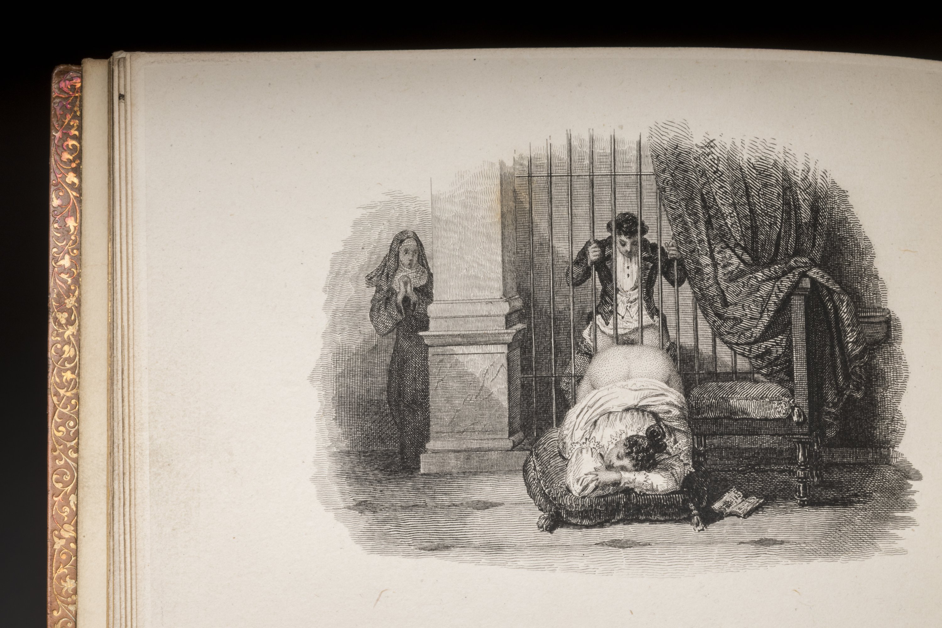3 volumes in-12 à l'italienne (95 X 135 mm), chacun de 26 pages en comprenant le titre, chacun illustré de 12 lithographies hors-texte protégées par des serpentes de Chine. Plein veau glacé blond ; encadrement de 3 filets droits avec fleurons d'angle. Toutes tranches dorées. Fine reliure de la seconde partie du XIXe siècle.