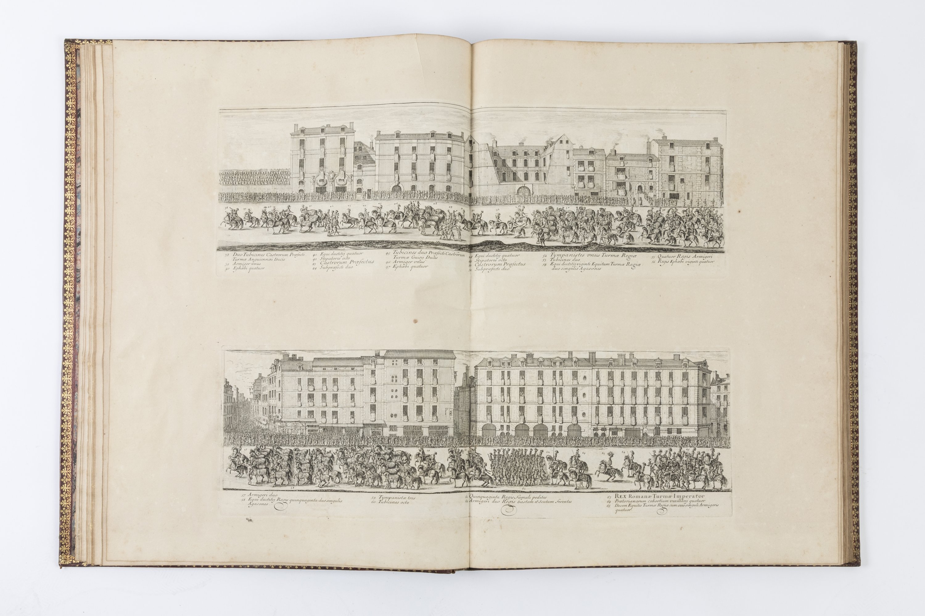 Très grand in-folio, 557 x 450 mm. (faux-titre, titre-frontispice avec le buste de Louis XIV gravé par Rousselet, titre), (2 feuillets pour la lettre-dédicace de Charles Perrault au Grand Dauphin), 8 pages (4 planches doubles), pp. 9-23, (pp. 24-30), 31-32, (33-34), 35-44, (45-46), 47-48, (49-50), 51-60, (61-62), 63-64, (65-66), 67-76, (77-78), 79-80, (81-82), 83-94, (95-96), 97-98, (99-100), 101-104, (1 planche double), 105, (106) pour le colophon. 65-104 pour le Circus Regius avec colophon page 104.