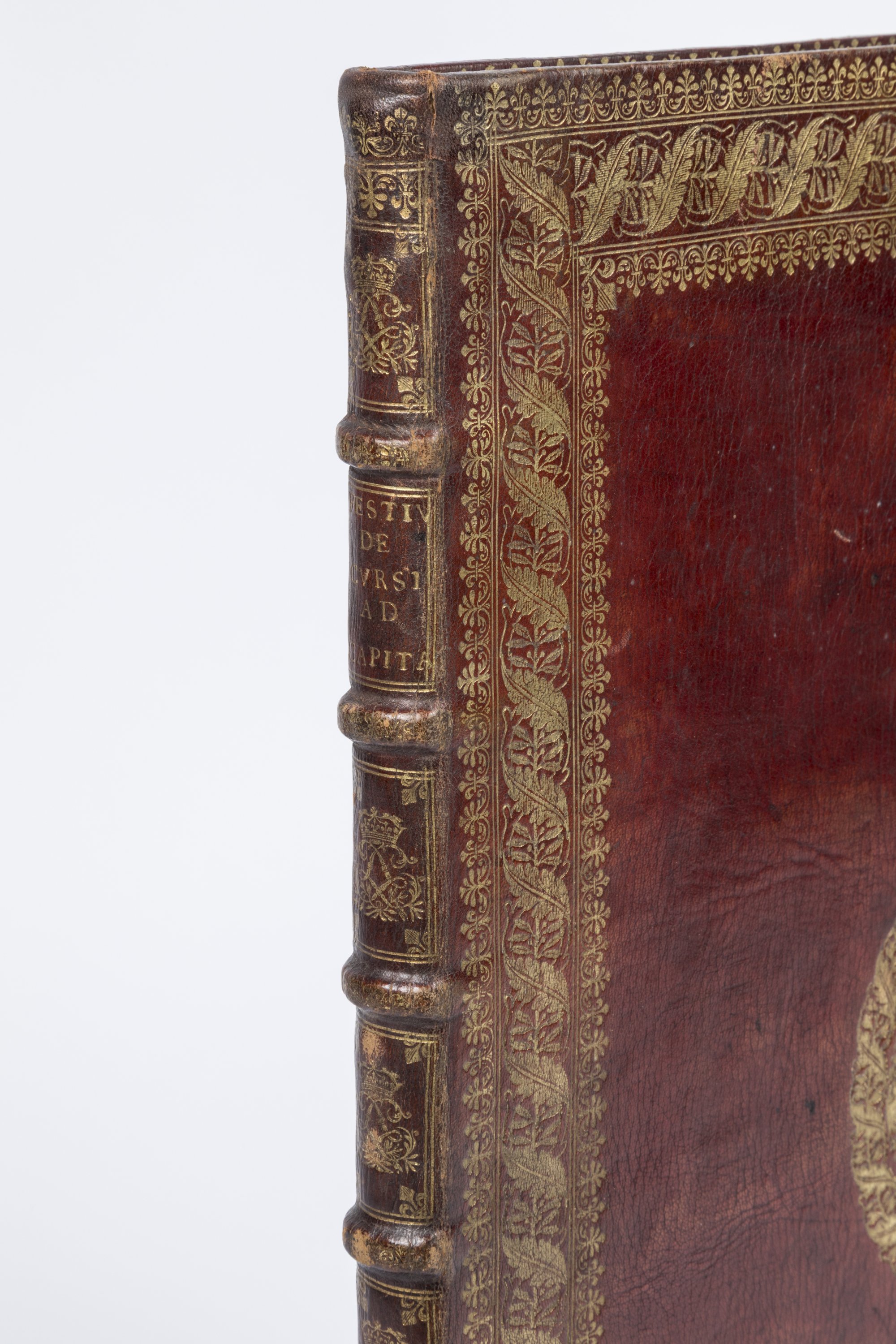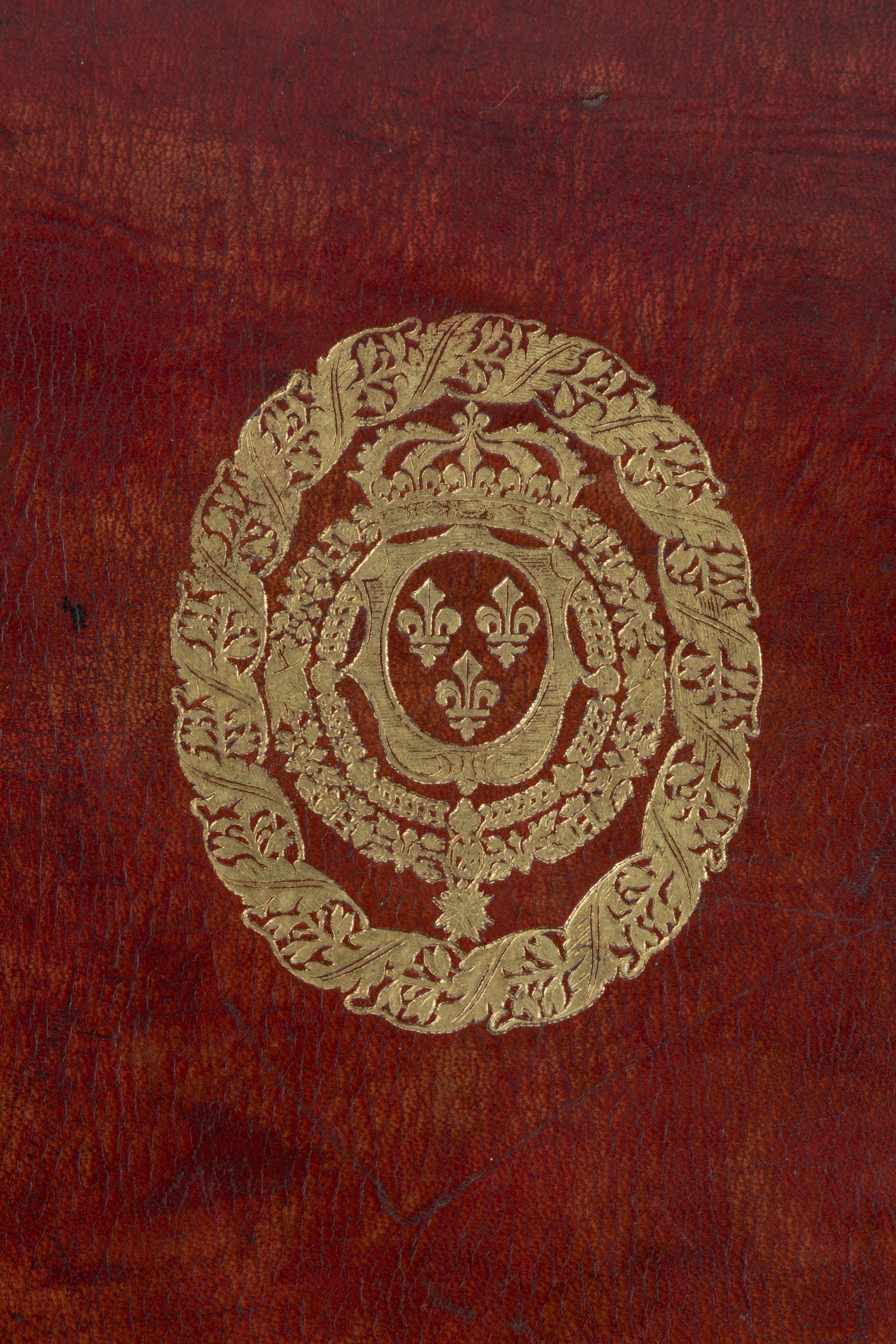Plein maroquin rouge, dentelle du Louvre placée au milieu de deux roulettes fleurdelysées, grandes armes de Louis XIV au centre des plats ; dos orné dans les caissons de fleurs de lys et du chiffre du Roi ; roulette sur les coupes ; roulette fleurdelysée intérieure. Roulette sur les nerfs. 1/2 gardes peignées. Reliure du temps.