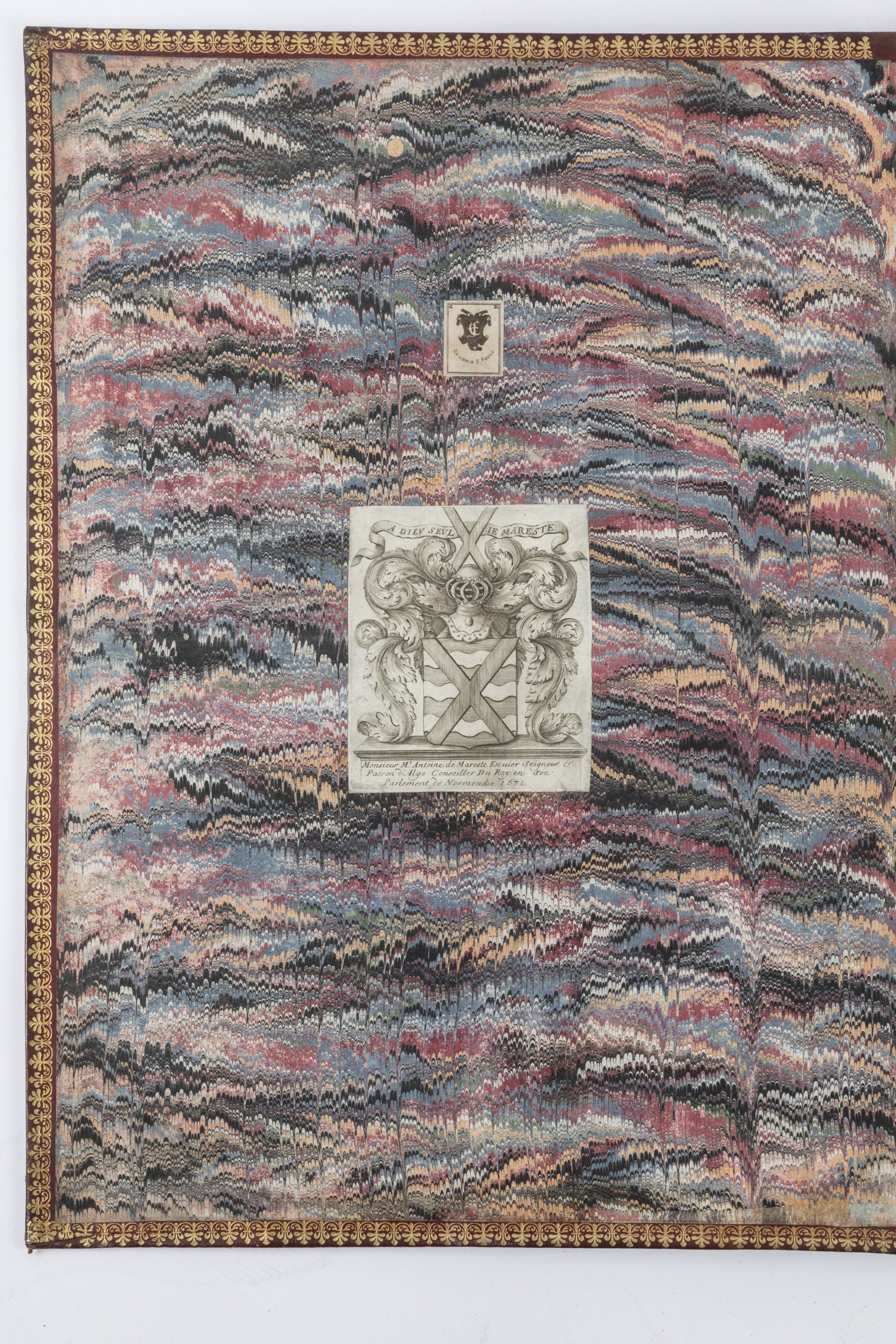 Grand ex-libris gravé daté 1672 : Antoine de Mareste d'Alge, conseiller du Roi au Parlement de Normandie. Ex-libris manuscrit sur le faux-titre : Demareste d'Alge.