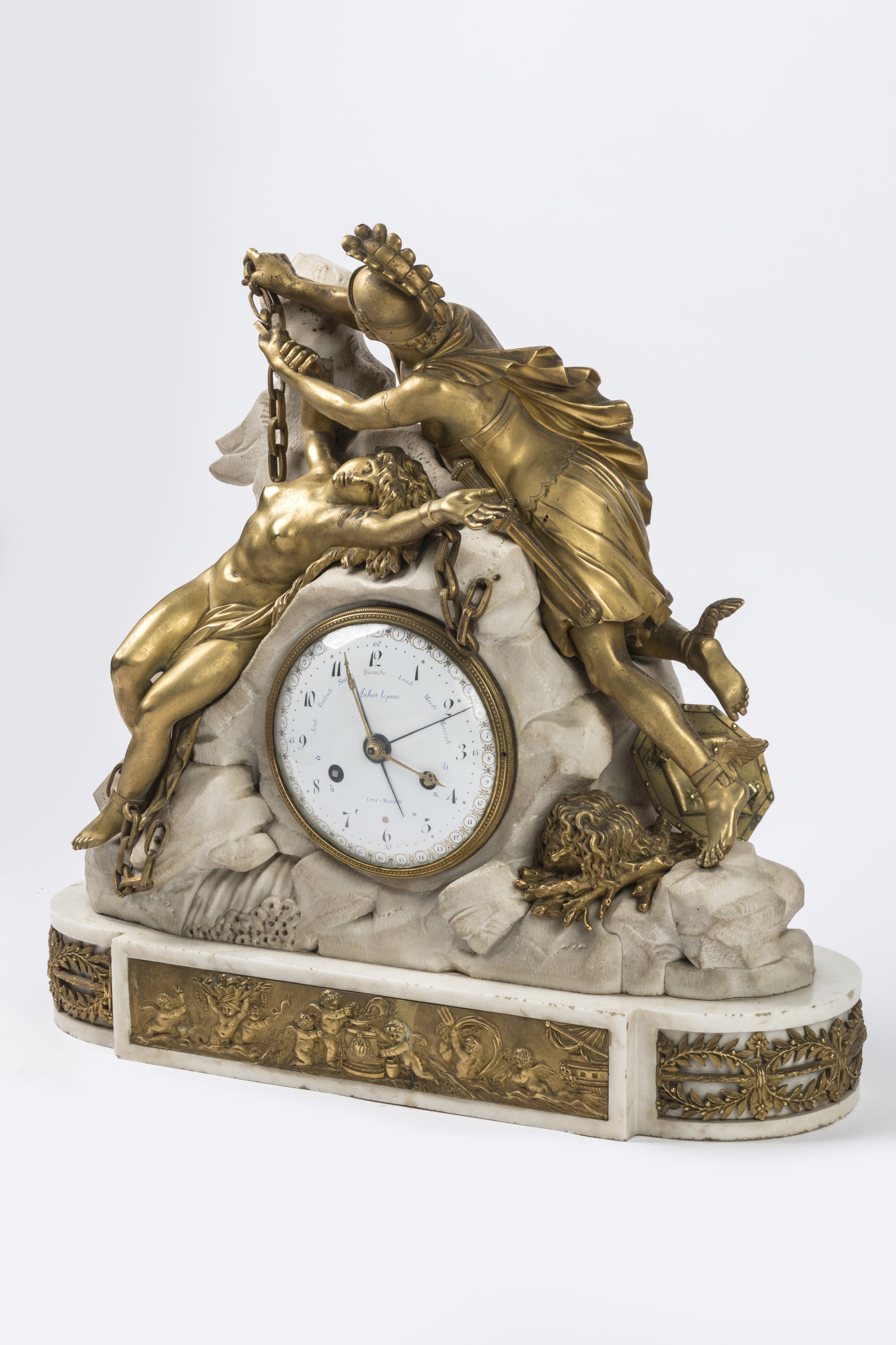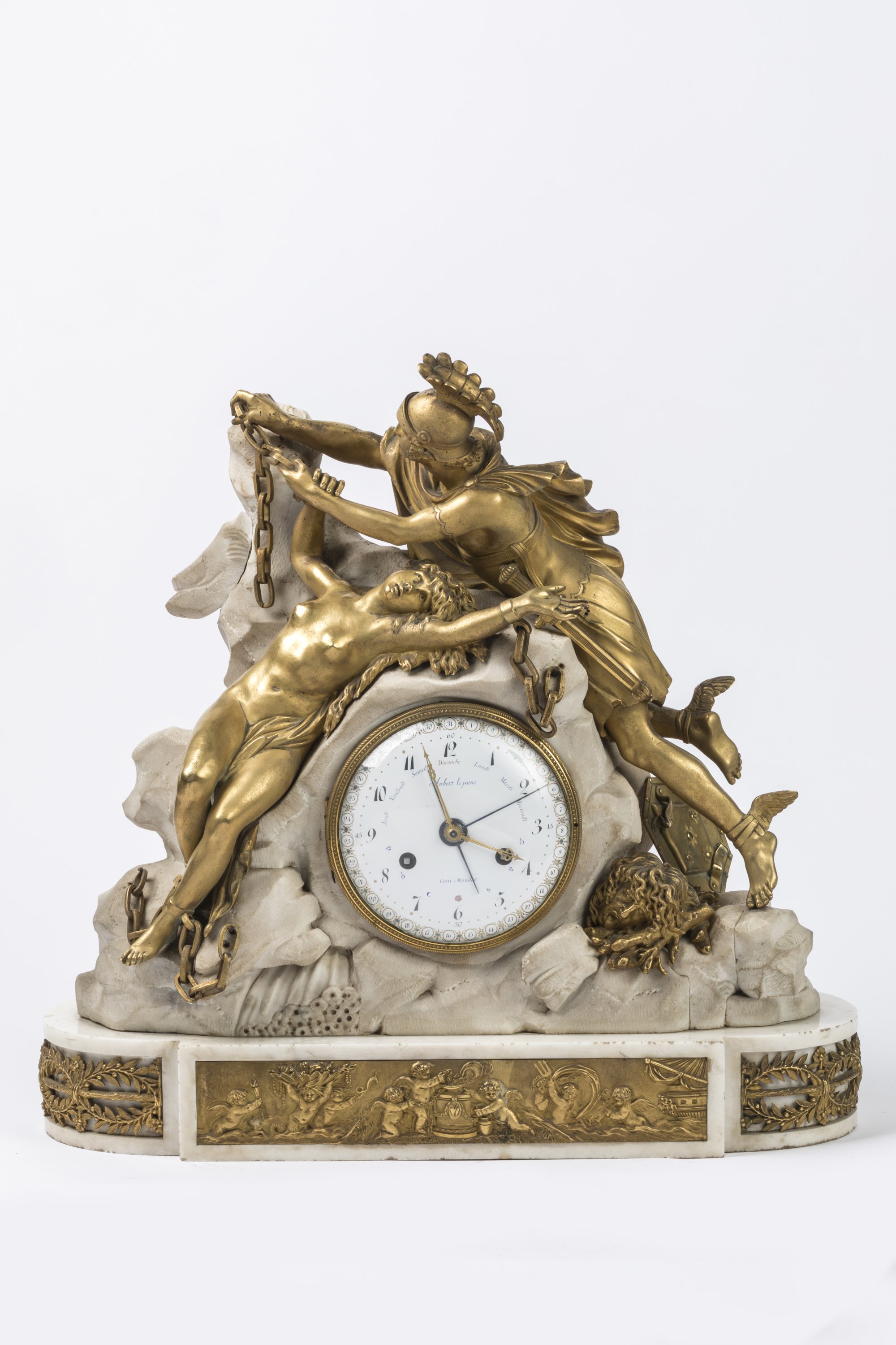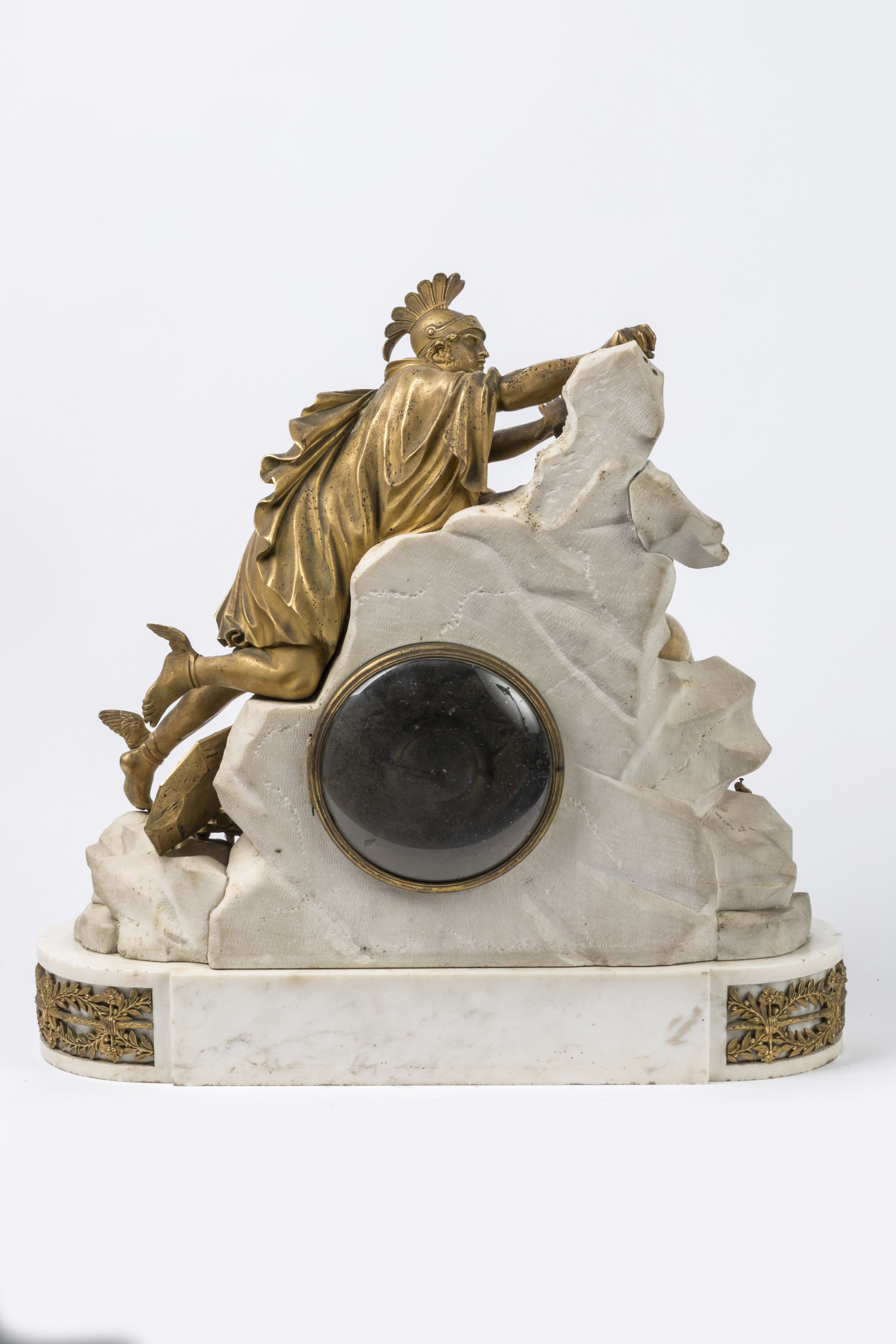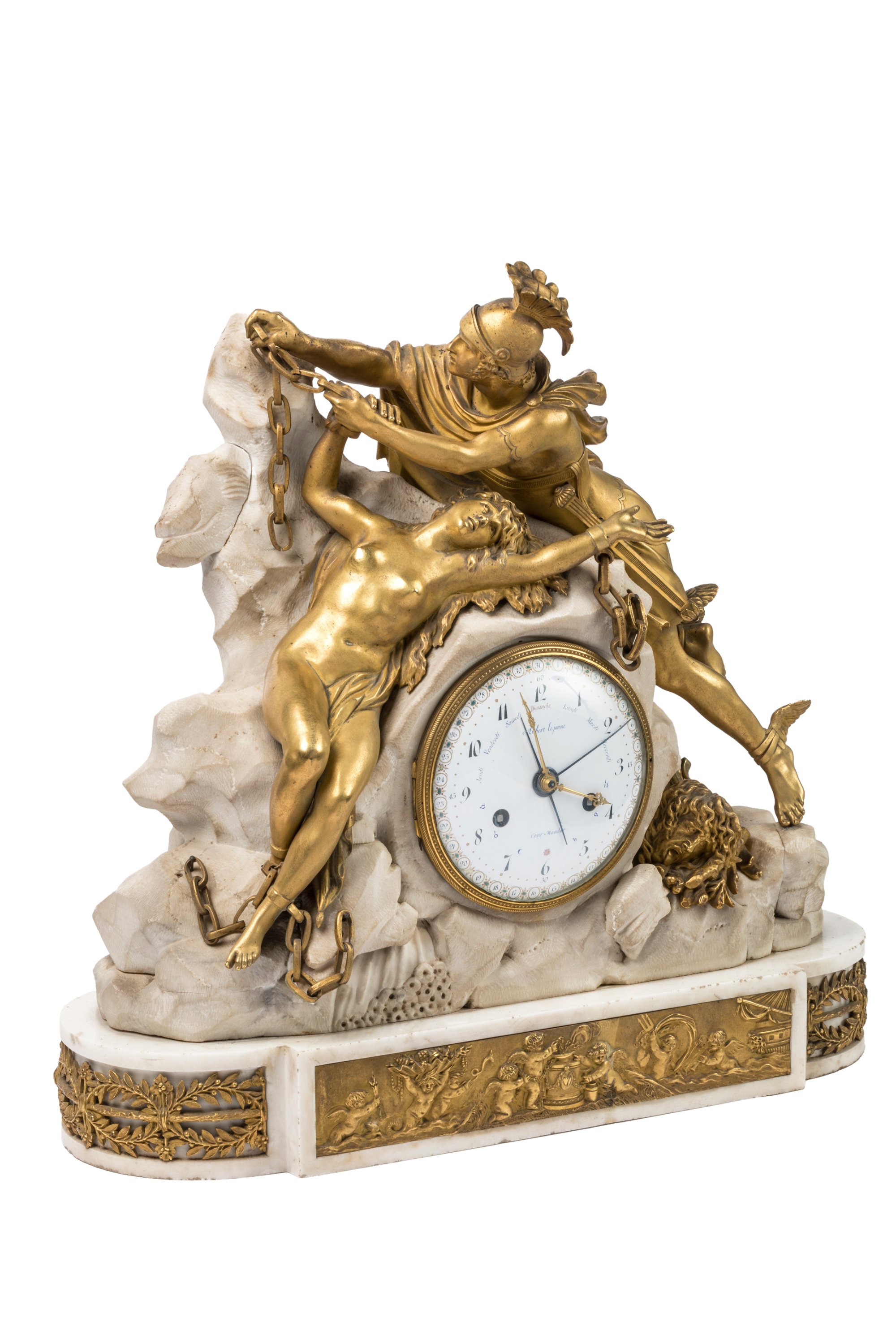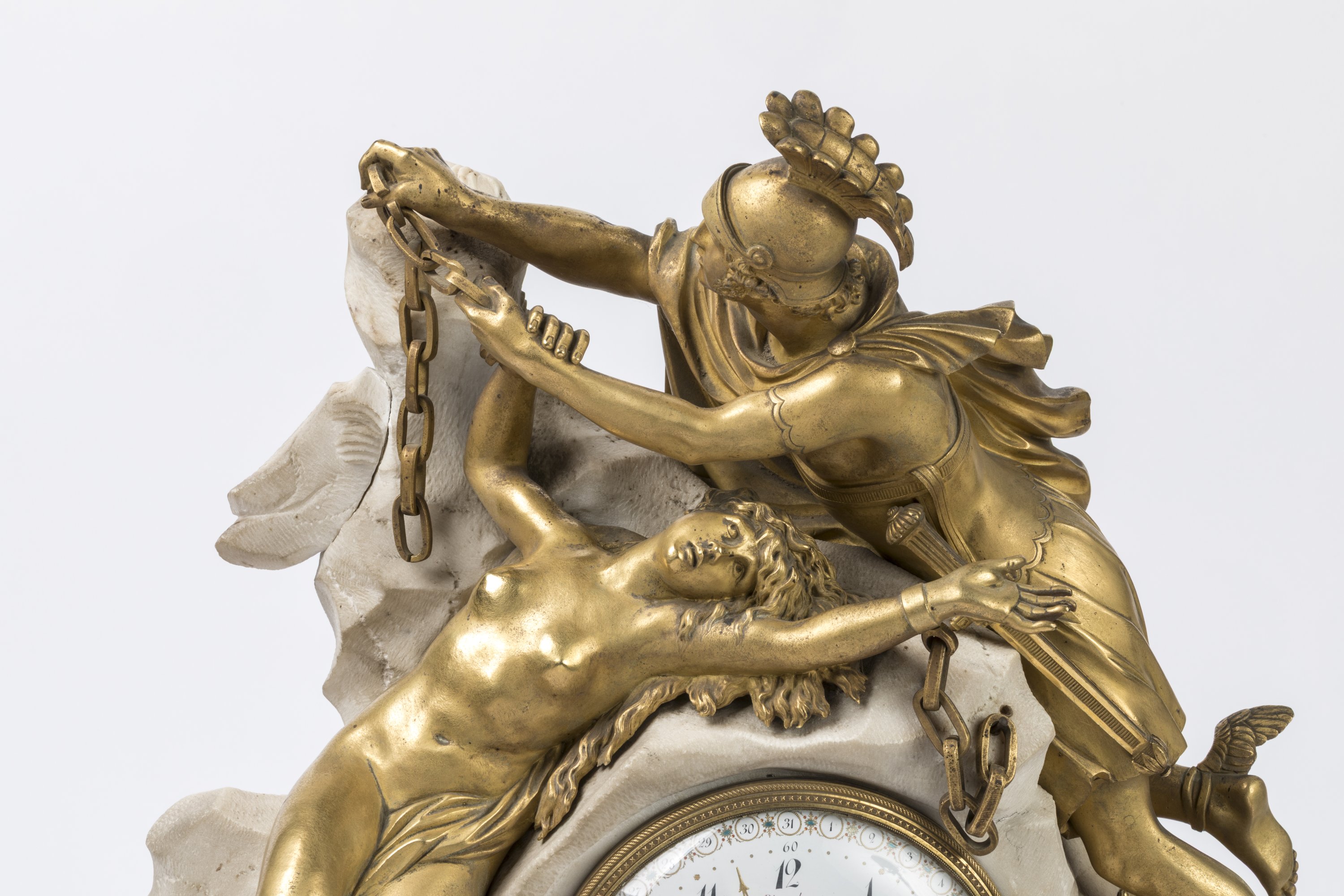 A chiseled ormolu and white marble mantel clock featuring Perseus freeing Andromeda. French Consulate-Empire Period.