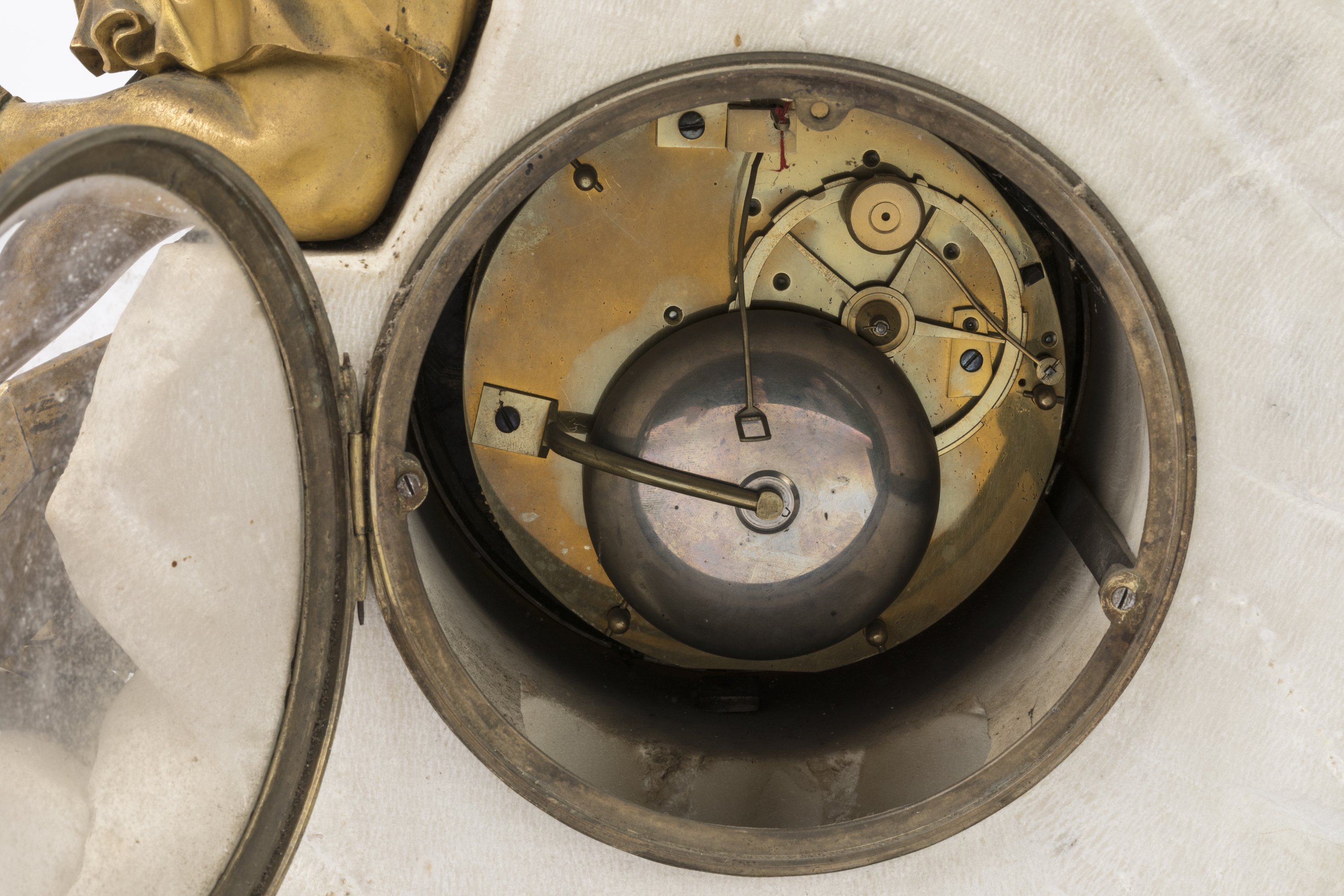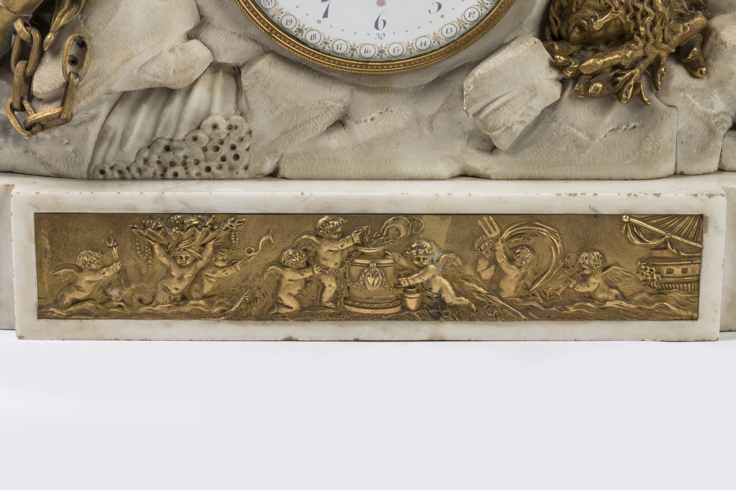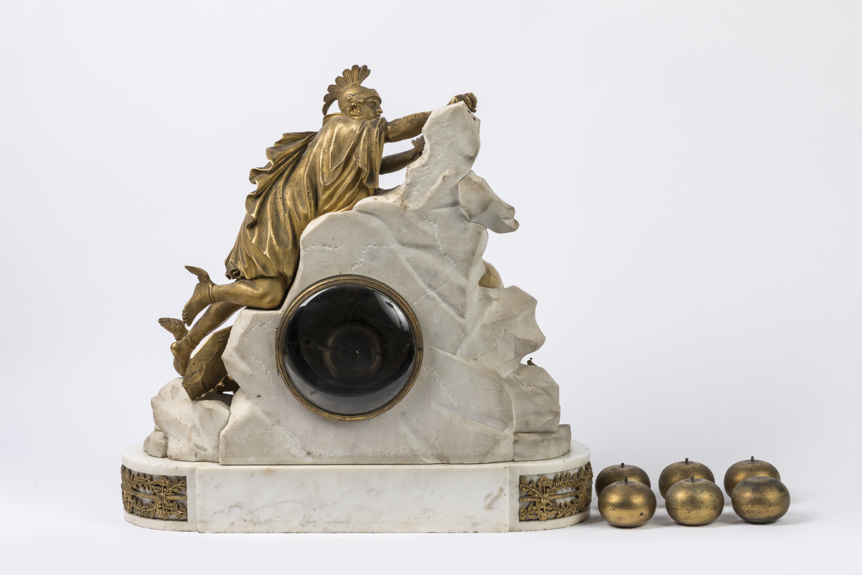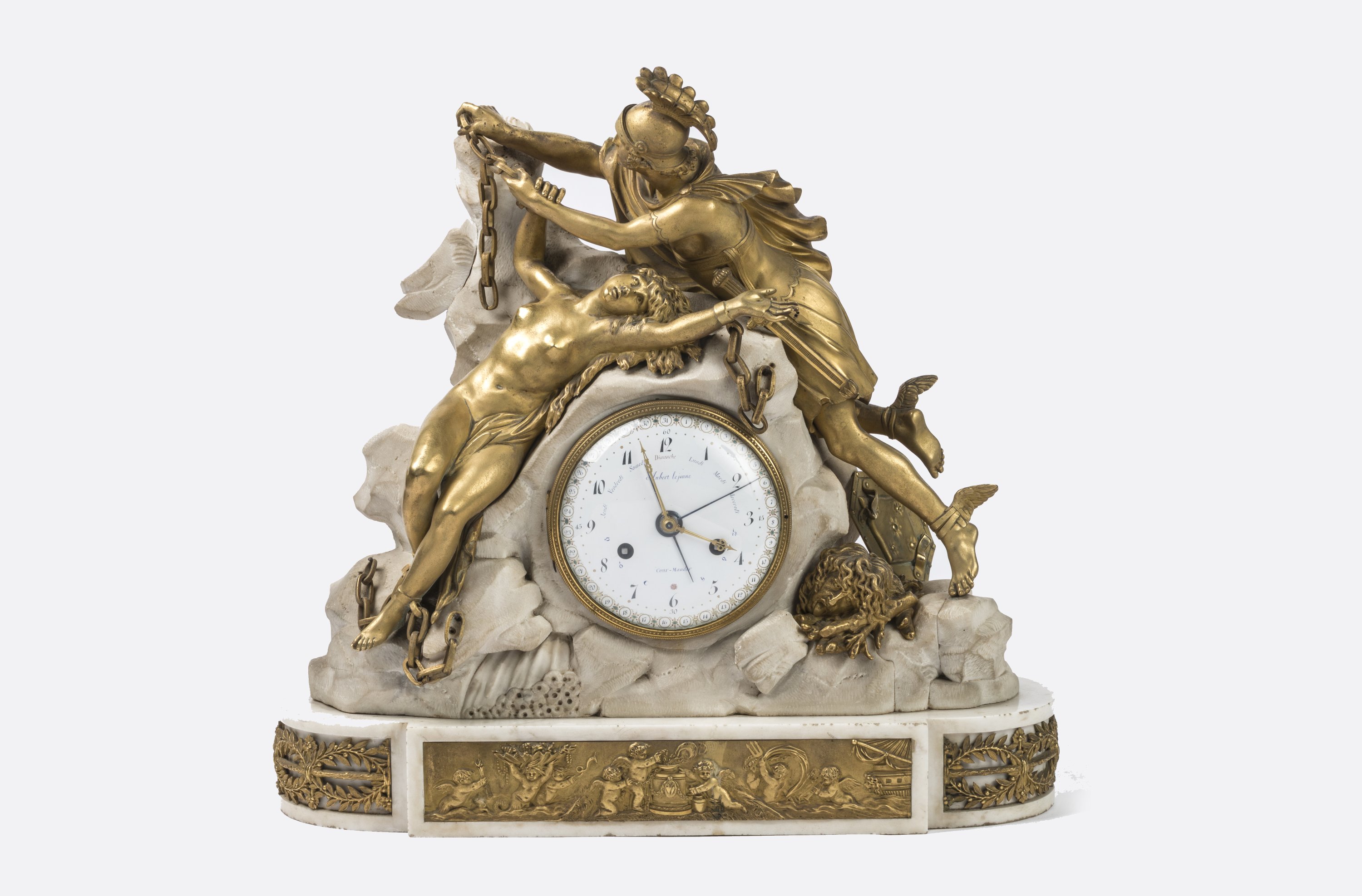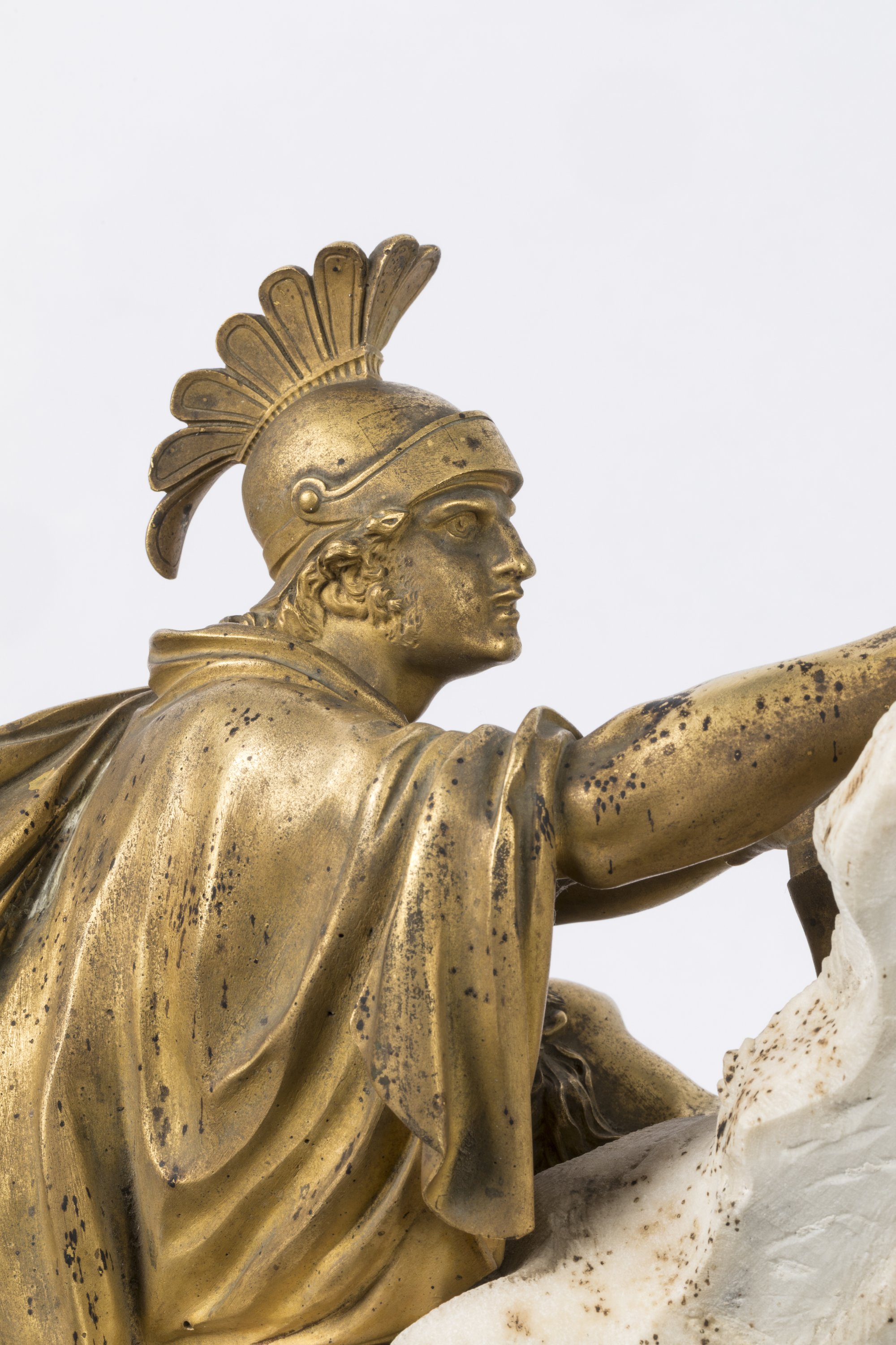 A chiseled ormolu and white marble mantel clock featuring Perseus freeing Andromeda. French Consulate-Empire Period.