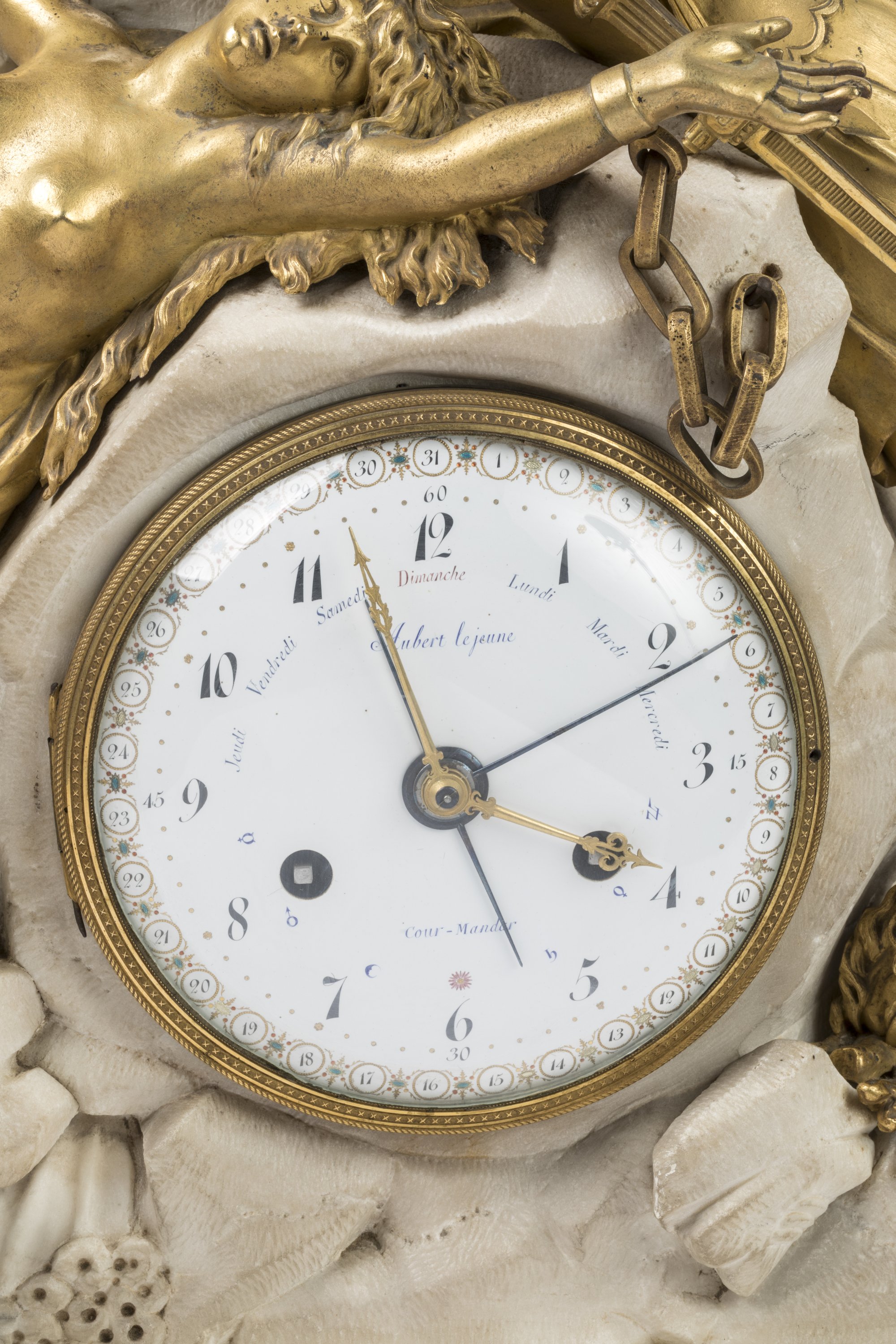 Persée délivre Andromède sur un rocher en marbre blanc surmontant le cadran émaillé blanc signé "Aubert Lejeune Cour Mandar" indiquant les heures en chiffres arabes, les minutes par des points et les jours dans des cercles sur le cadran au niveau de la bordure. Elle repose sur une base oblongue décorée d'une frise à la Clodion et de couronnes de laurier en bronze doré. Elle repose sur six pieds en forme de boule aplatie.