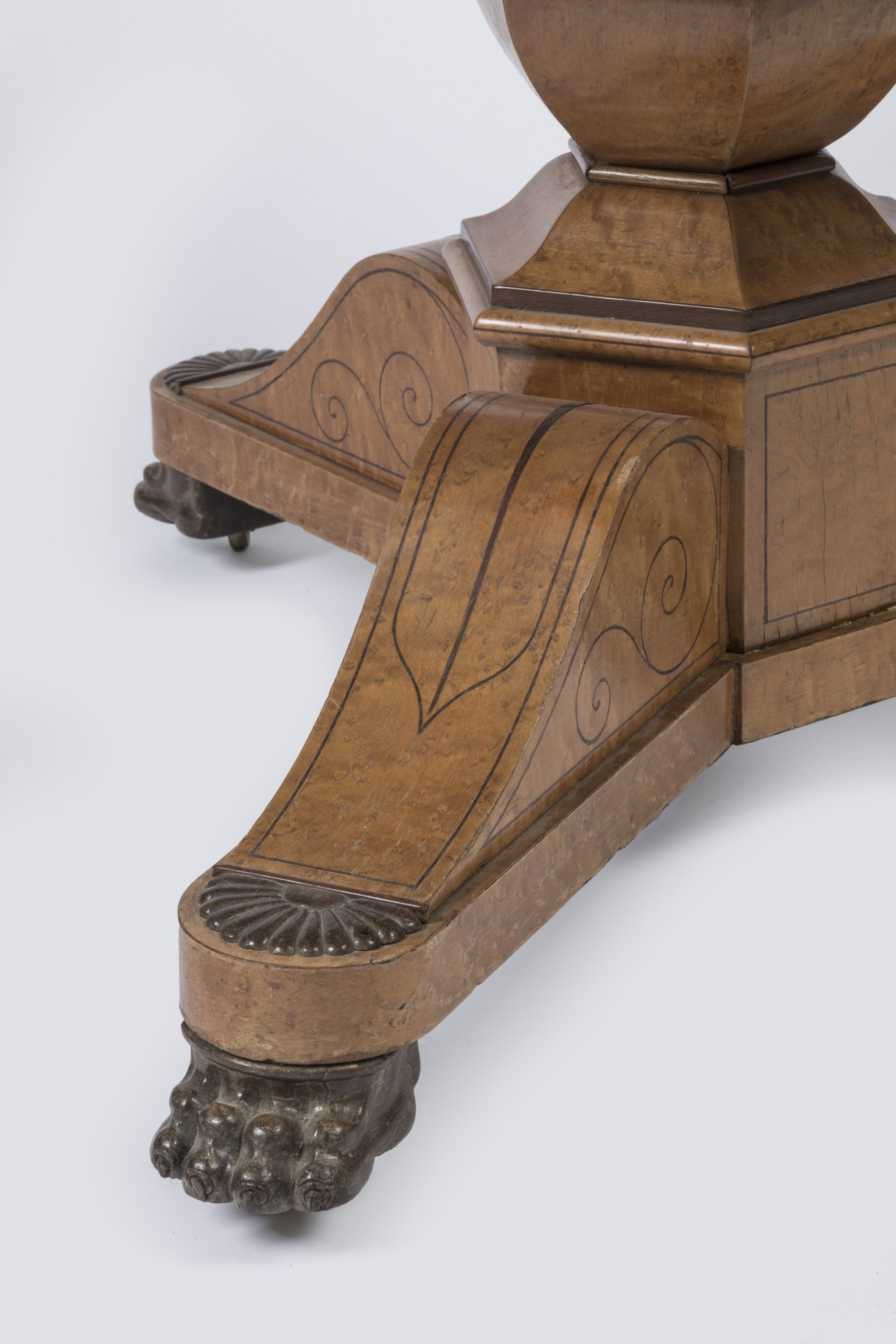 De forme circulaire, il ouvre par quatre tiroirs en ceinture et repose sur un fût hexagonal. Piétement tripode terminé par des griffes de lion sur des roulettes.