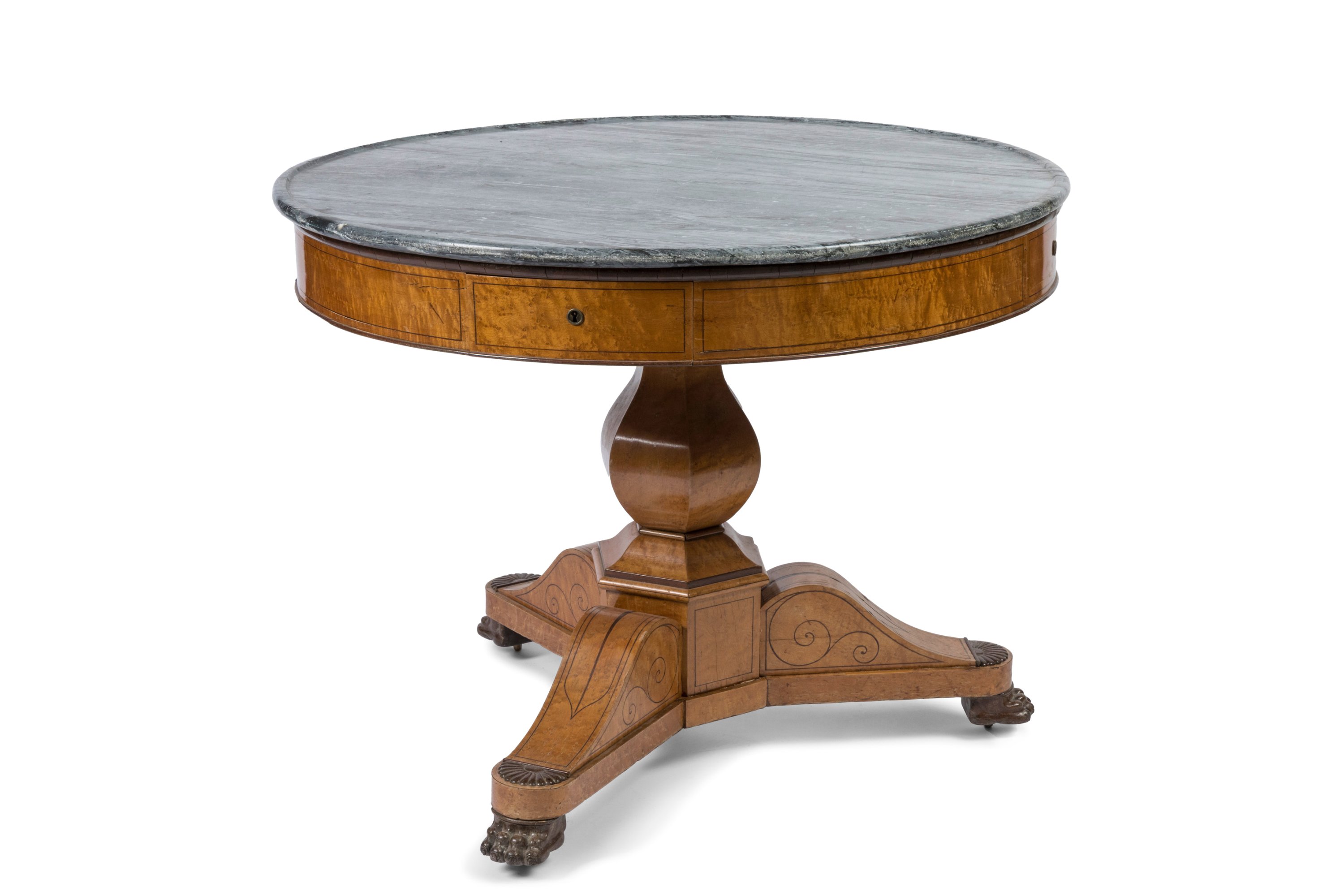 A round maple, amaranth and mahogany veneer library table. Blue marble top. Charles X Period.
