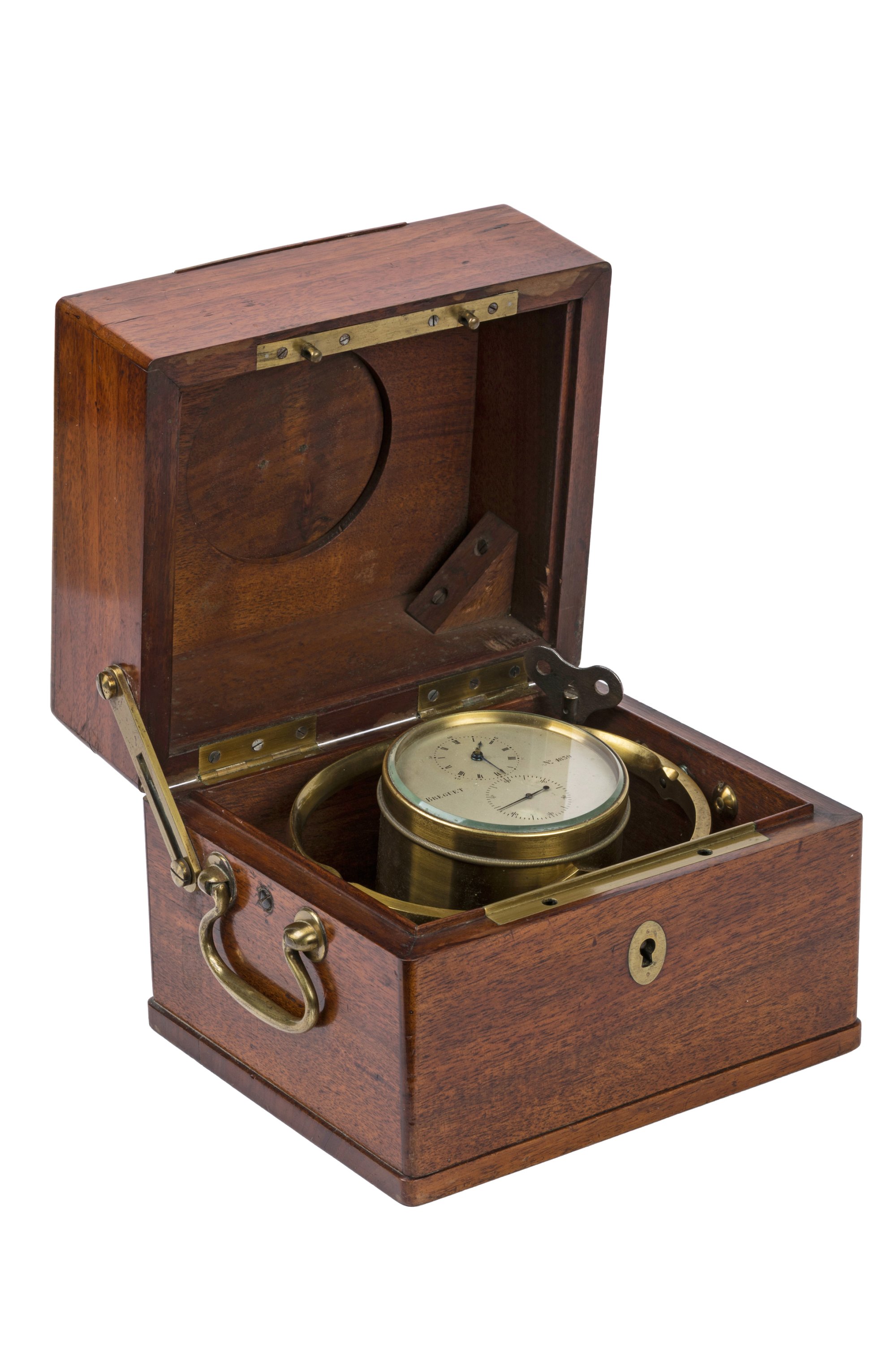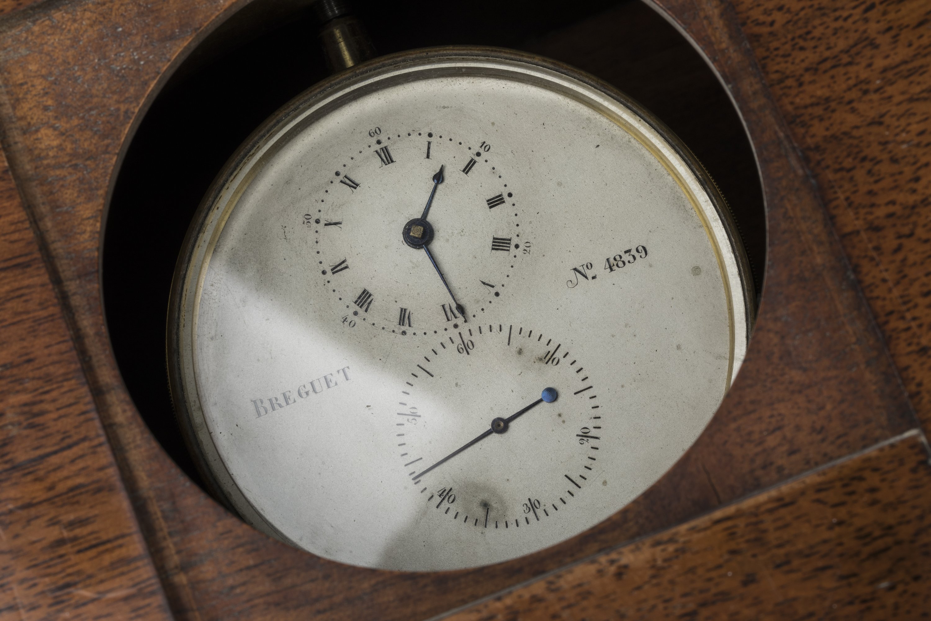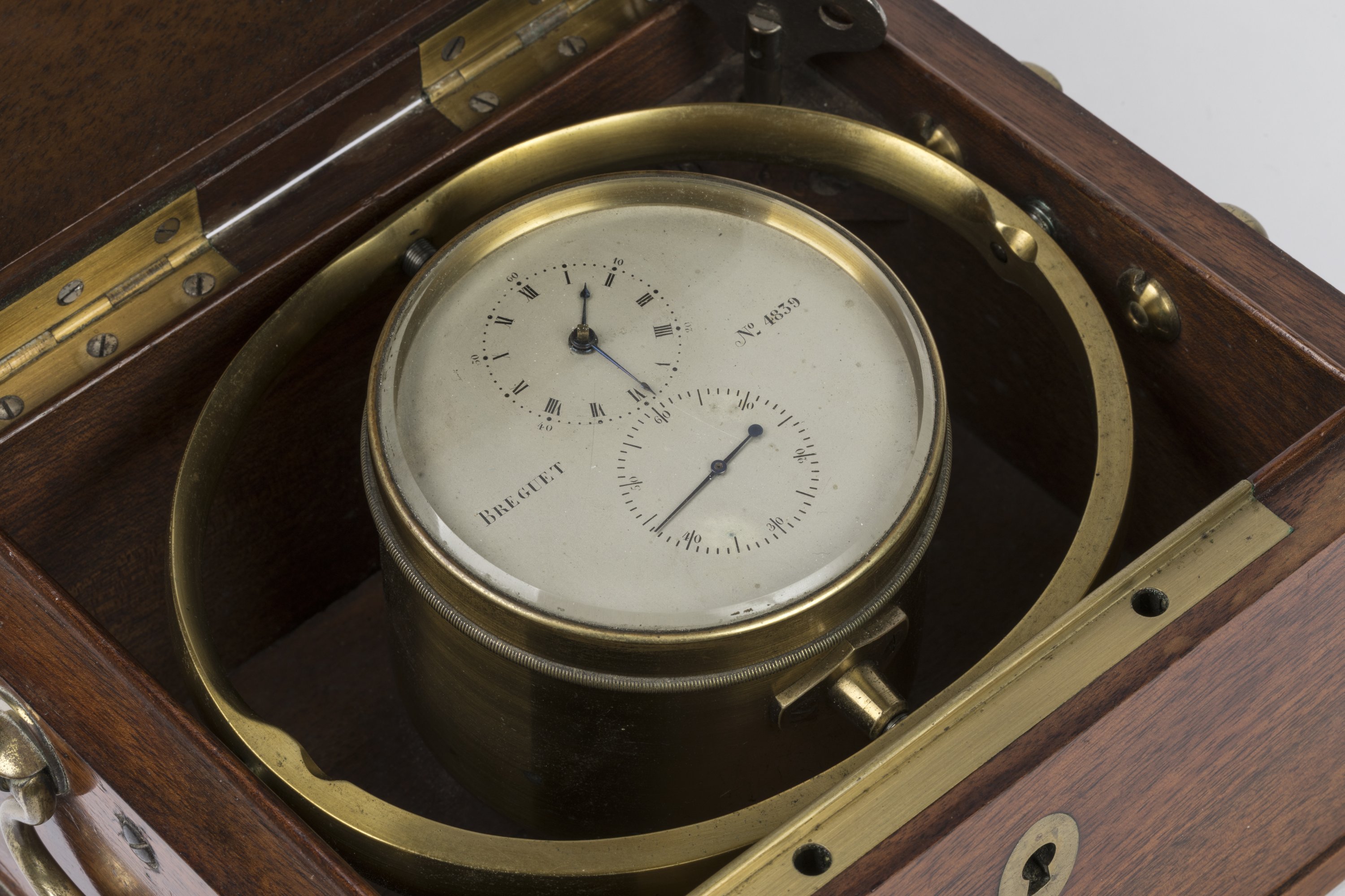 Breguet. A 1829-1830 single-barrel marine chronometer, walnut outer case with brass hinges and handles, brass clock case and Cardon suspension, silver-plated dial with subdial for hours/minutes above subdial for seconds, spring detent platform escapement. Signed and numbered.
