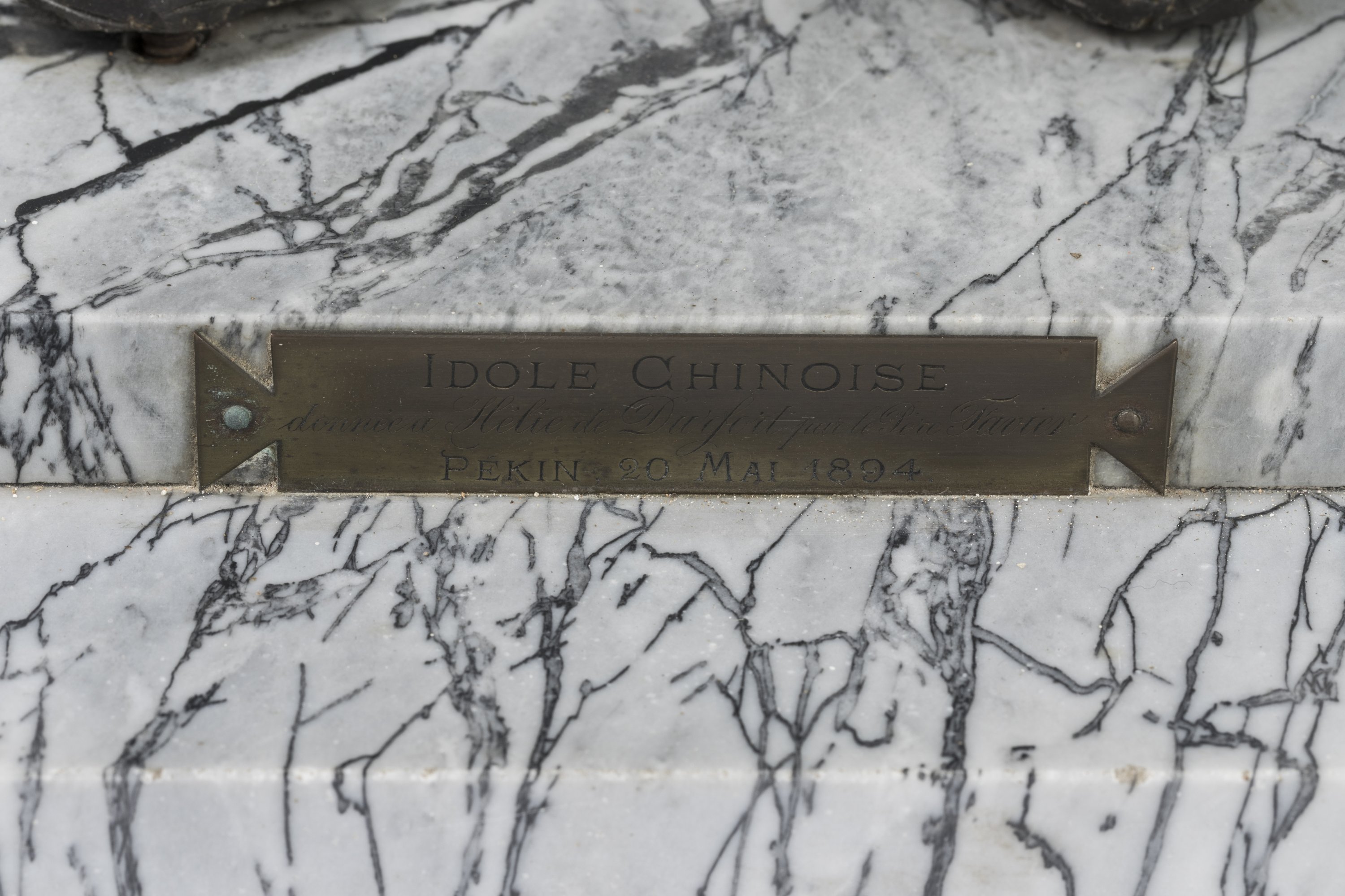 Sur un socle en pierre avec une plaque inscrite "Idole chinoise. Donnée à Hélie de D. par le Père Xavier F. Pékin 20 mai 1894". Haut. totale 46 cm.