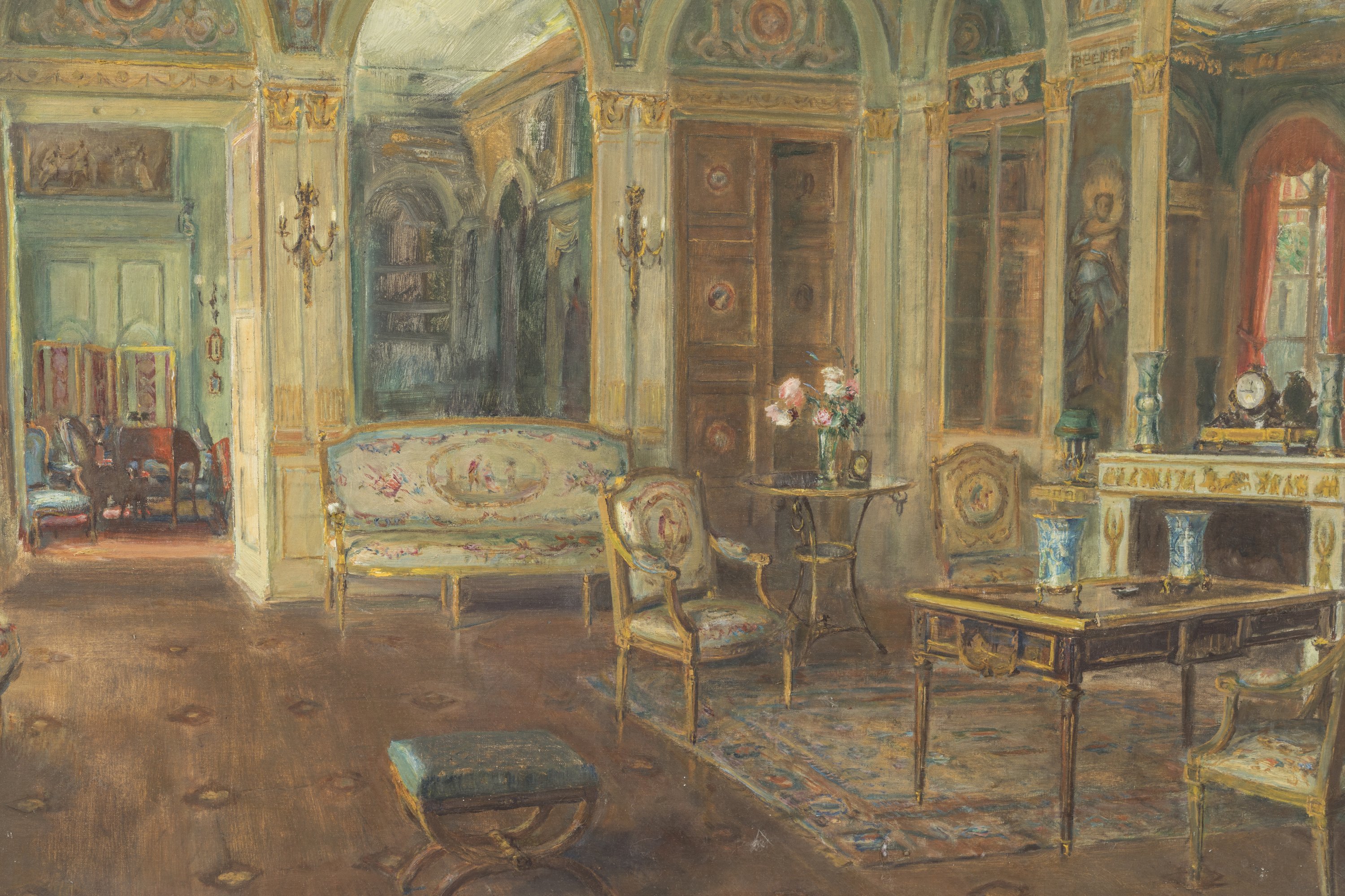 Peintre et collectionneur d’art Américain, Walter Gay arrive en France dès 1876. Il peint sa première scène d’intérieur dès 1895 avec une vue de sa maison de campagne à Magnanville dans laquelle il insuffle une lumière particulière rappellant le travail de Turner. Il représente ainsi de nombreux intérieurs de châteaux ou d’hôtel particuliers tels que ceux du musée Carnavalet, du château de Versailles ou de son propre château de Bréau. Il en réalise aussi chez ses amis comme le couple Jacquemart-André dont il reproduit le grand salon dans une œuvre aujourd’hui conservée au Metropolitan Museum of Art (n°61.91) ou le salon de Lord Stafford. Ce thème lui permet d’organiser sa première exposition personnelle dès 1905 à la Galerie George Petit qui connait un franc succès.