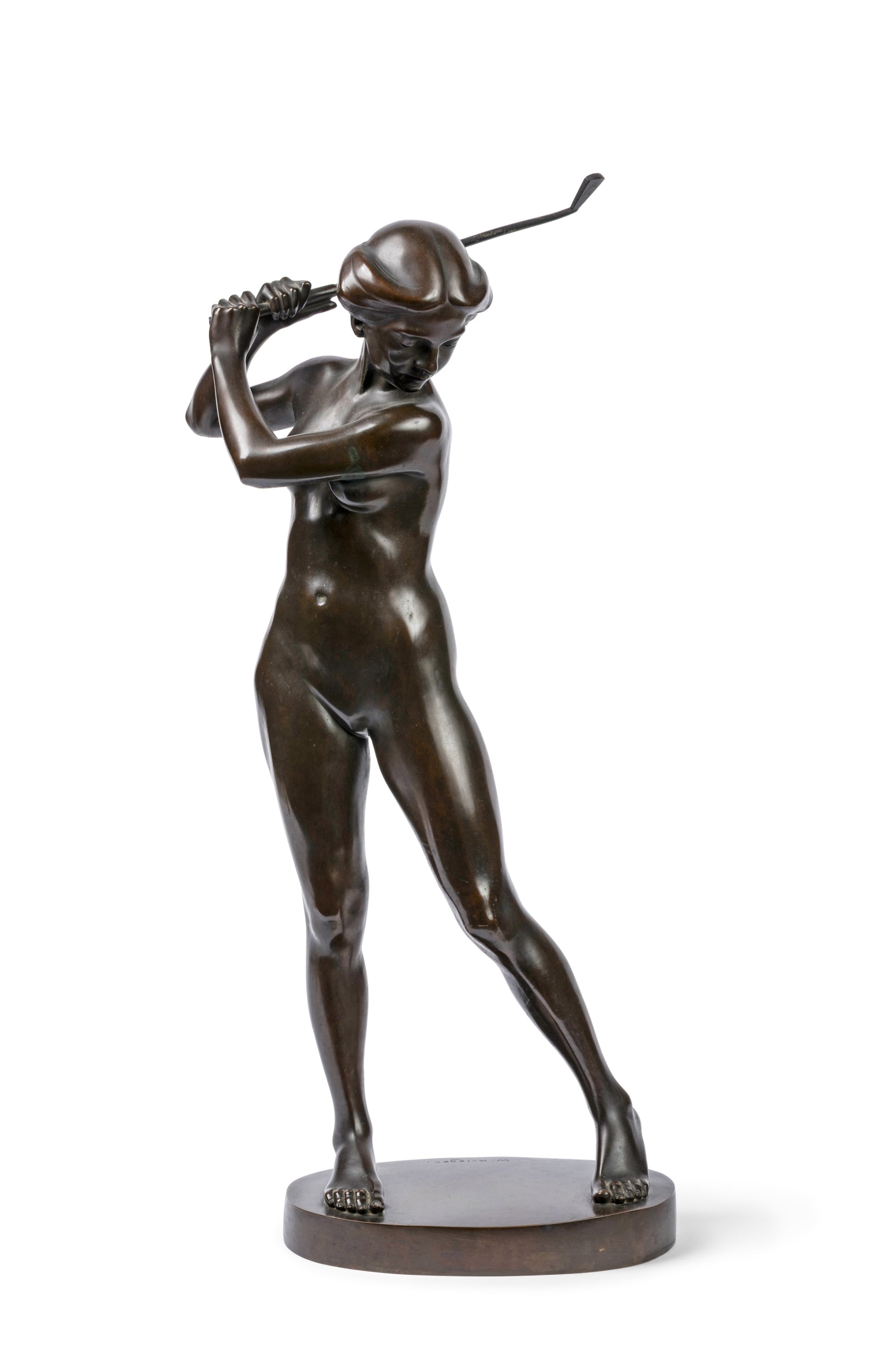 Wilhelm Krieger. A ca. 1910 bronze sculpture of a naked female golf player. Signed.