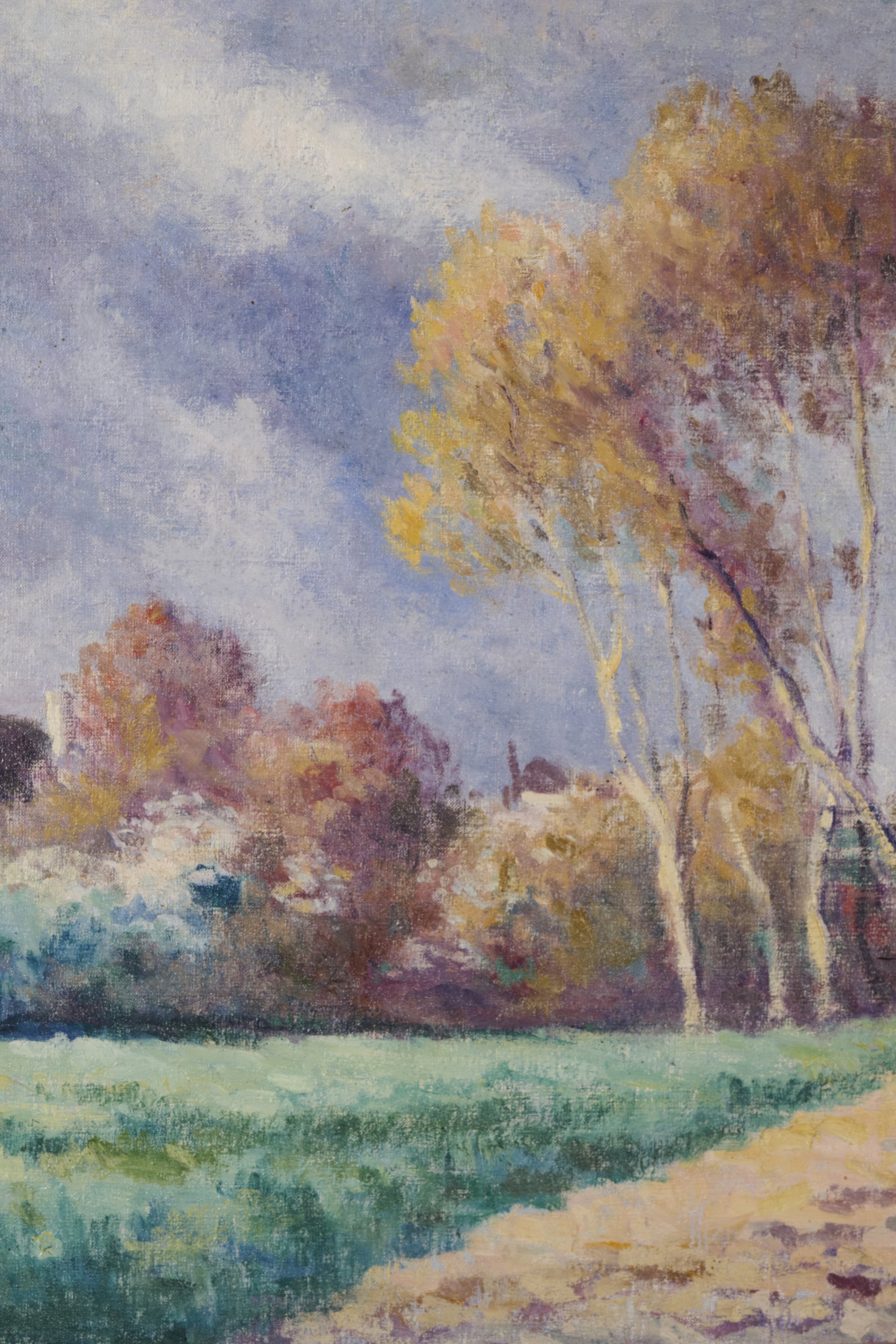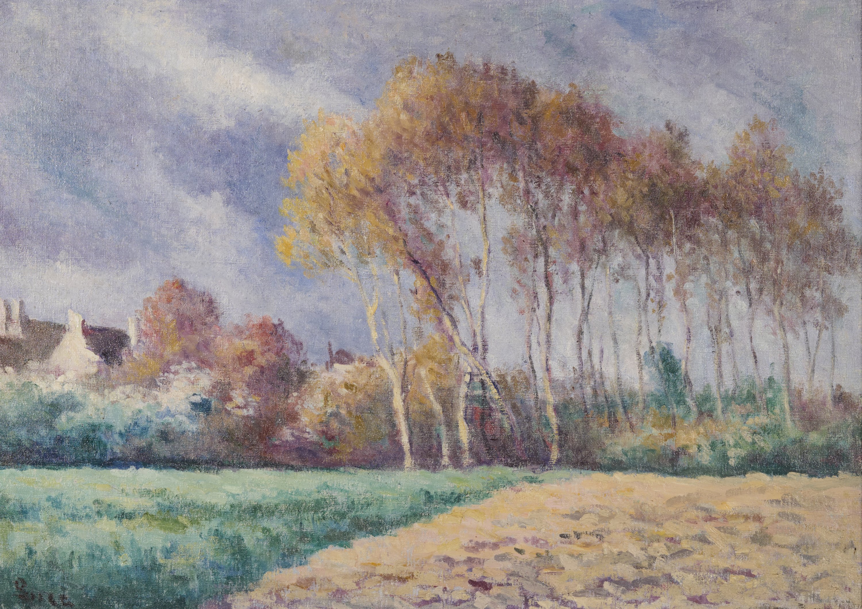 Maximilien Luce passe les étés 1903 et 1904 à Moulineux. S’il offre des représentations des plaisirs de la baignade, il s’applique surtout à proposer une série de toiles dans lesquelles il joue de variations dans la représentation des arbres. Réalisé plus tard dans la saison, notre tableau figure le calme avant l’orage, lorsque les feuilles rousses des bouleaux contrastent avec la couleur encre du ciel.