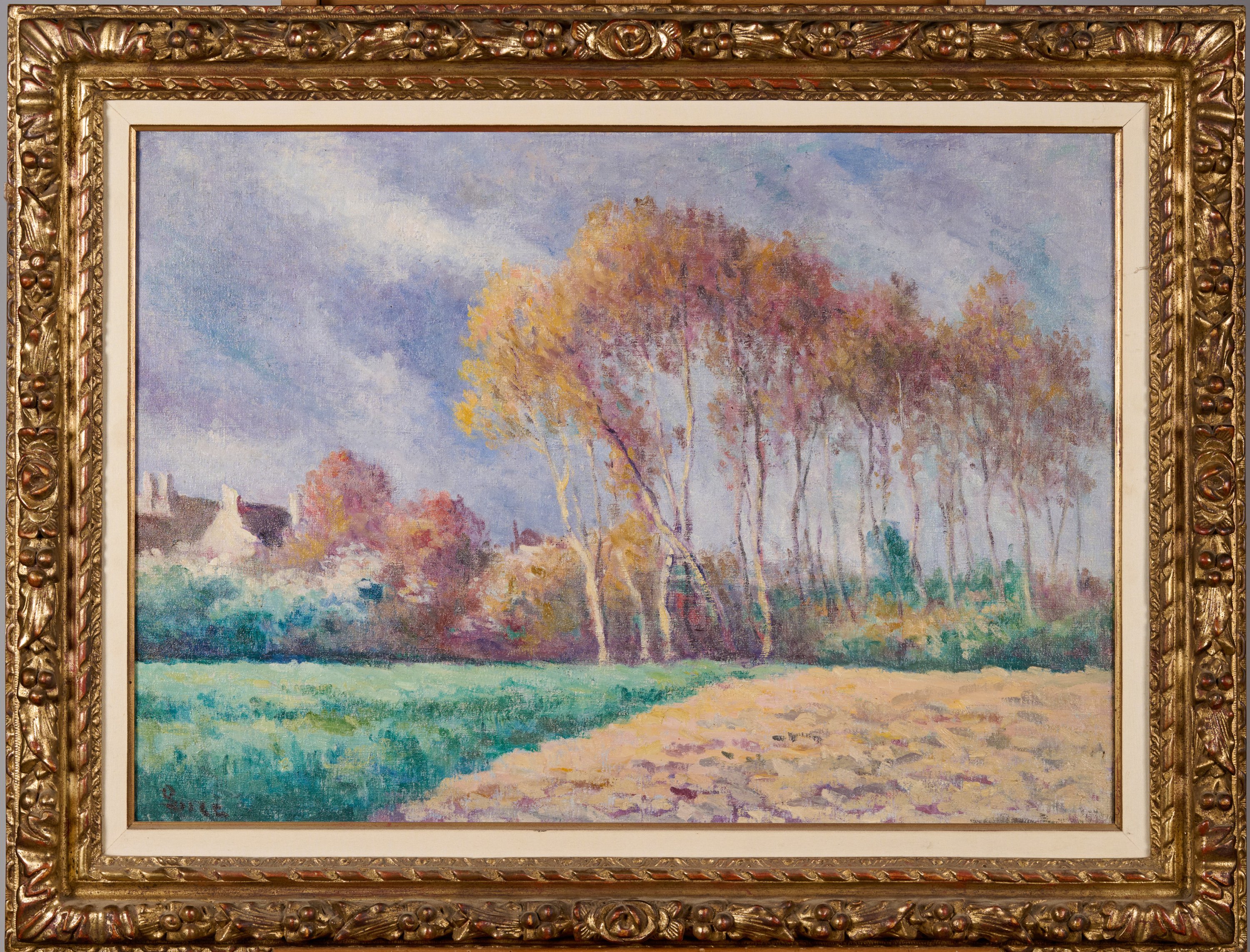 Maximilien Luce. A ca. 1903-1904 painting entitled "Moulineux, maisons dans les arbres" (Houses among the trees in Moulineux). Oil on canvas. Signed. In a Louis XVI style frame.