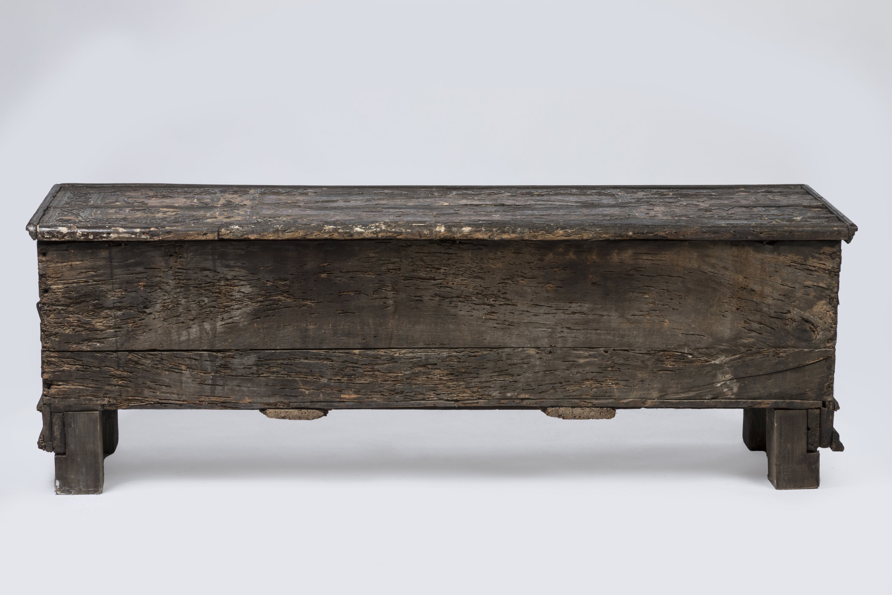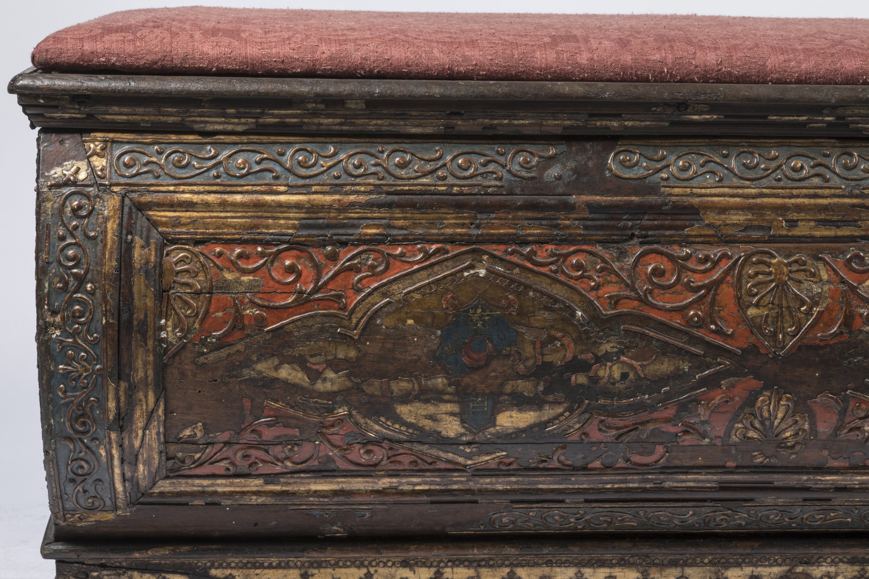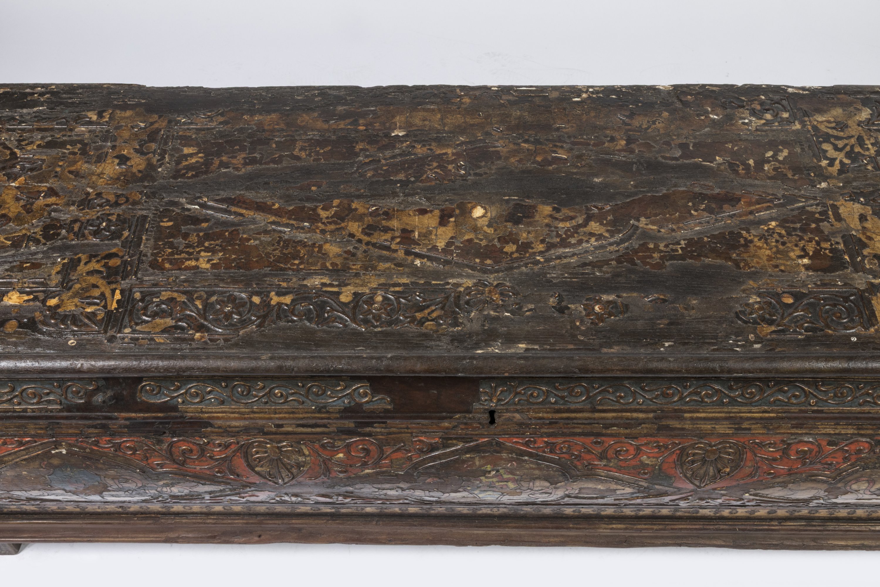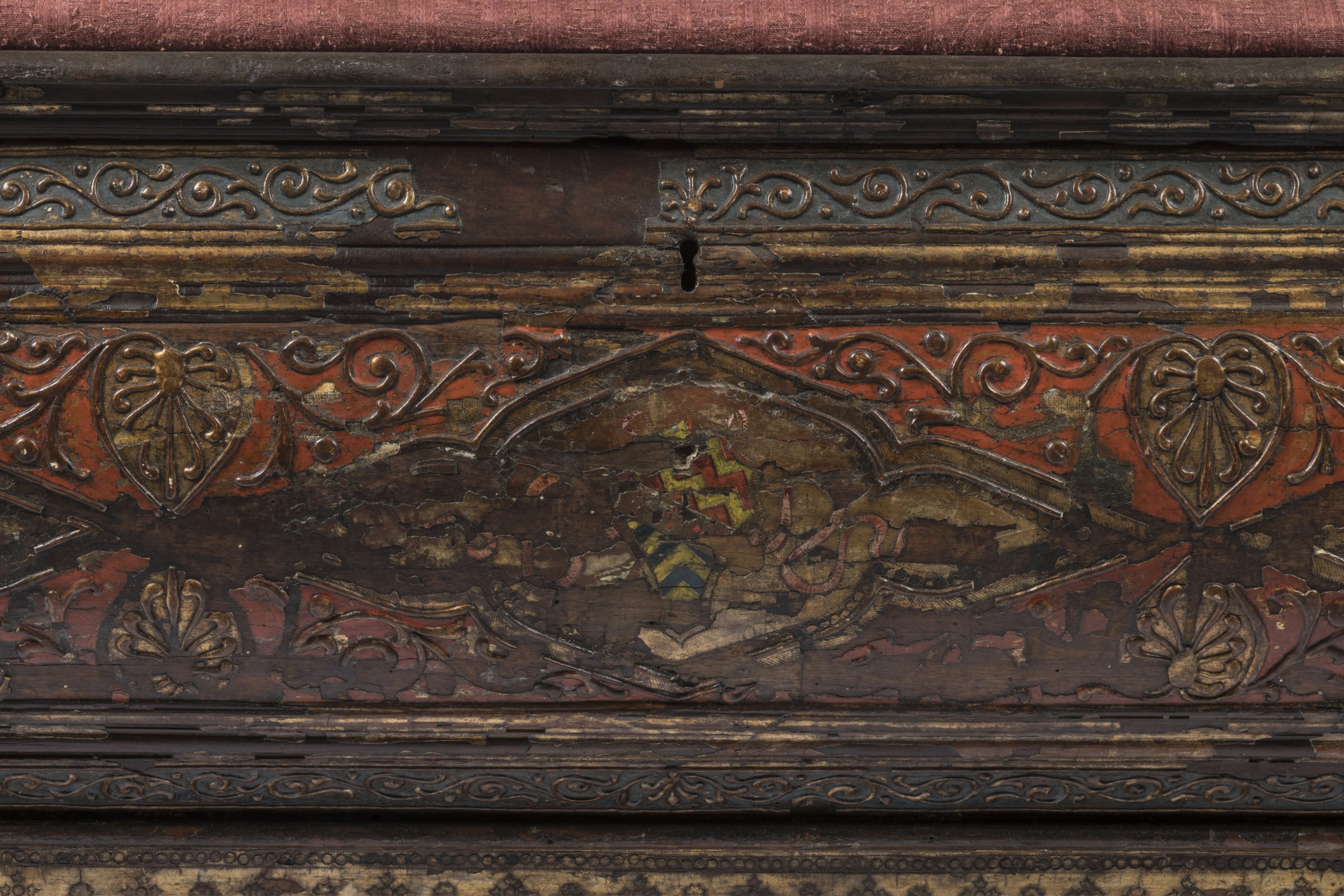 A carved giltwood and polychrome painted trunk with decorated panels. On a moulded wood base. Northern Italy, 16th century.