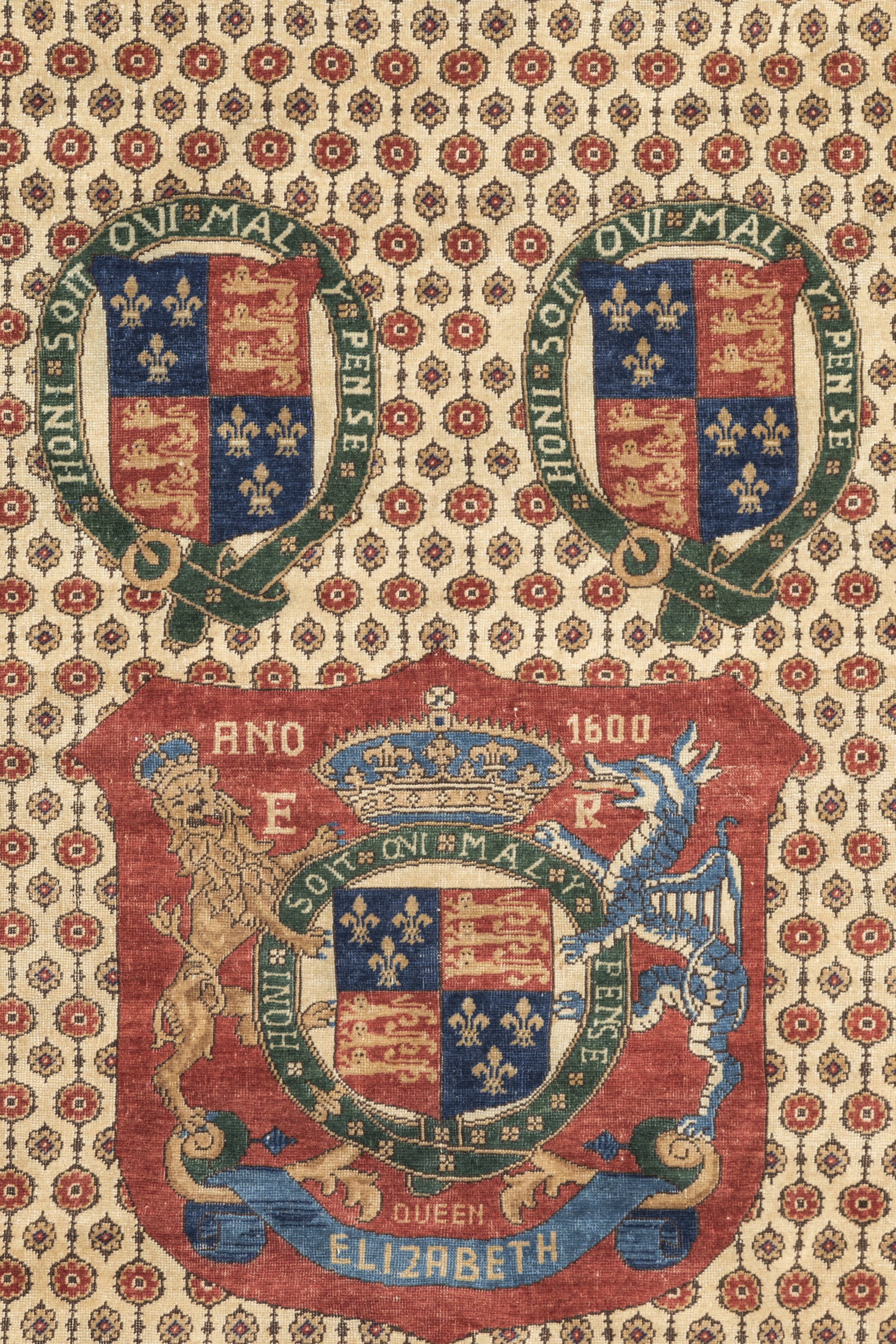 A 1600's style rug featuring Queen Elizabeth I's coat of arms in a central medallion. Former Kingdom of Romania, early 20th century.