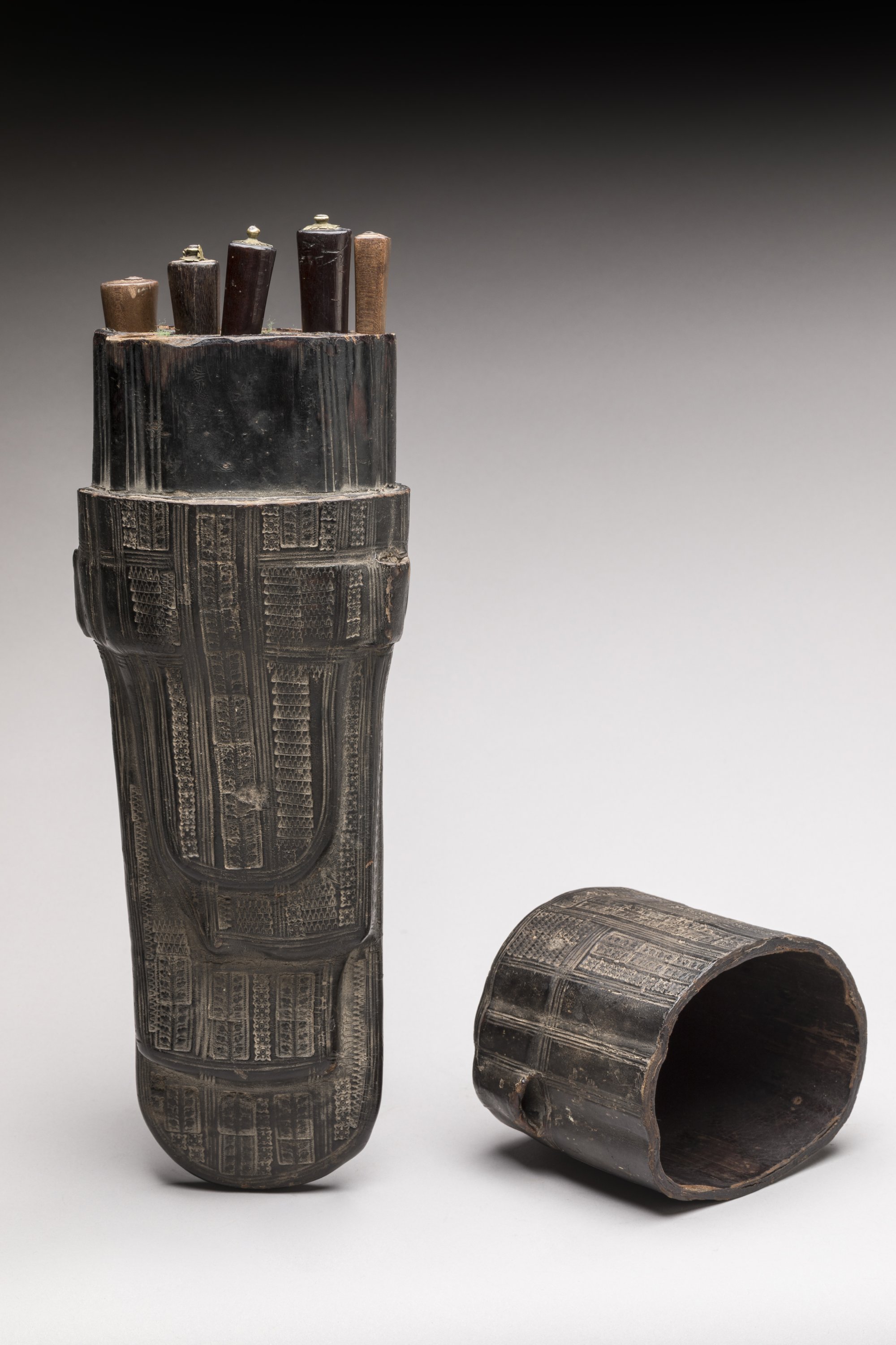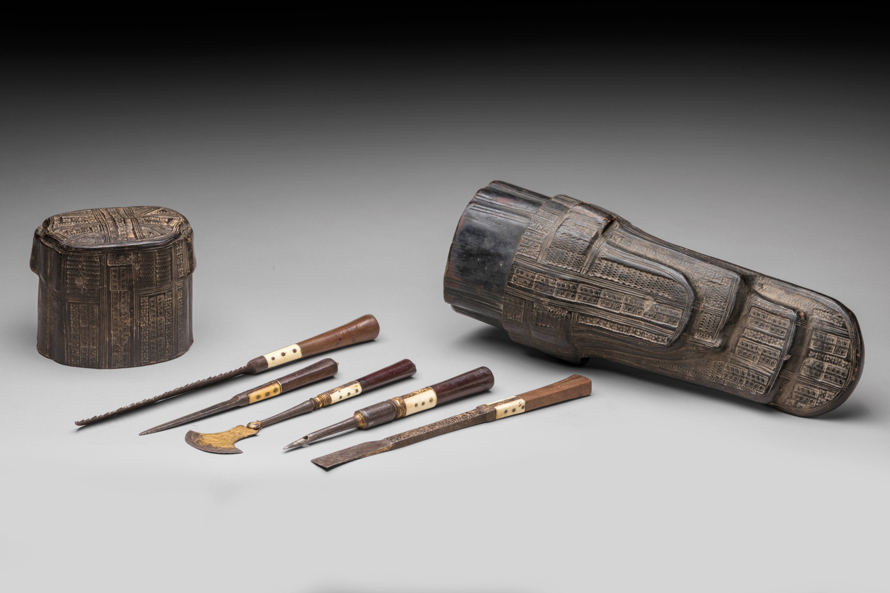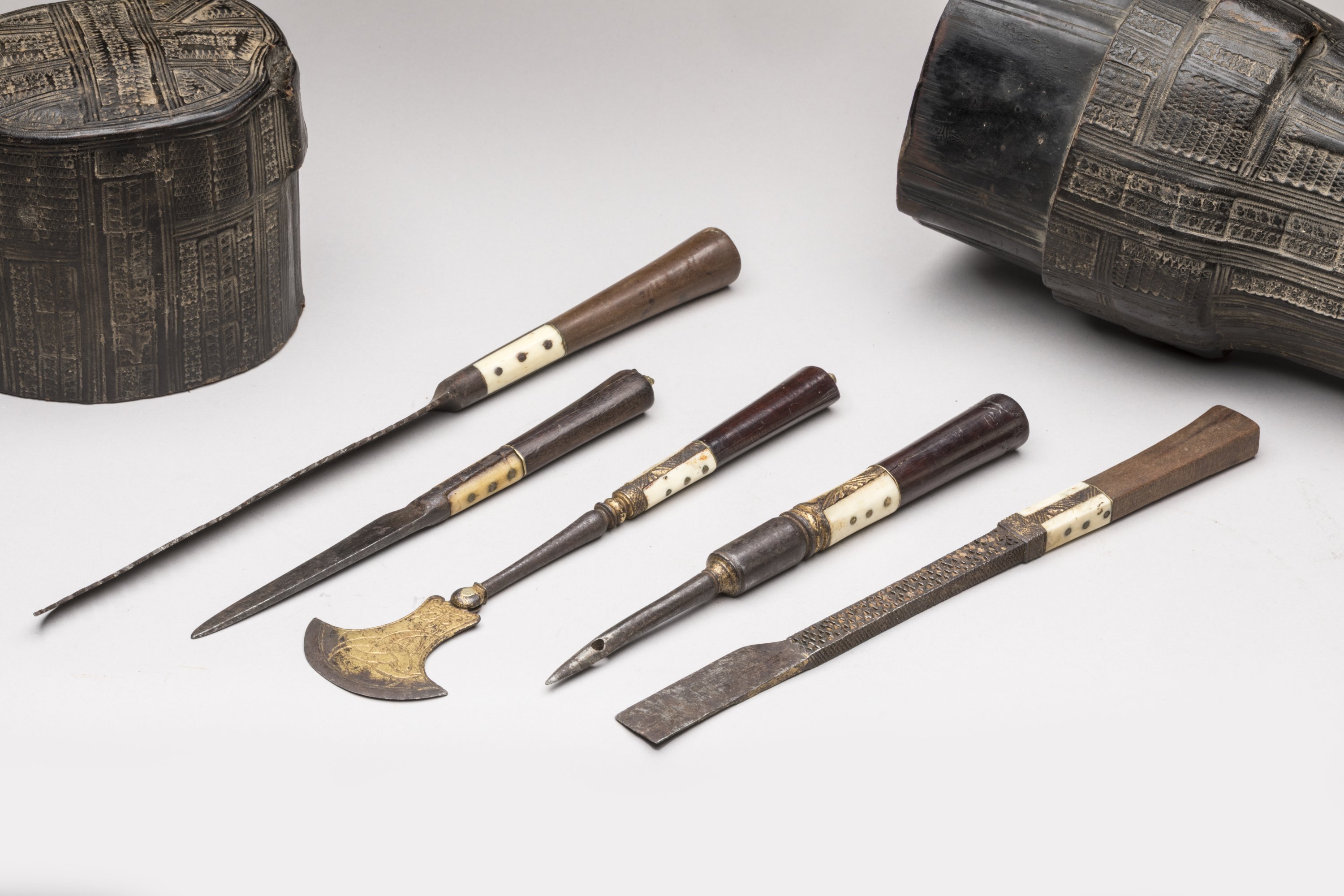 France, early 16th century. A rare squire leather bag holding a set of kitchen tools embossed with the cypher of Henri de Valois, future King Henri II of France.