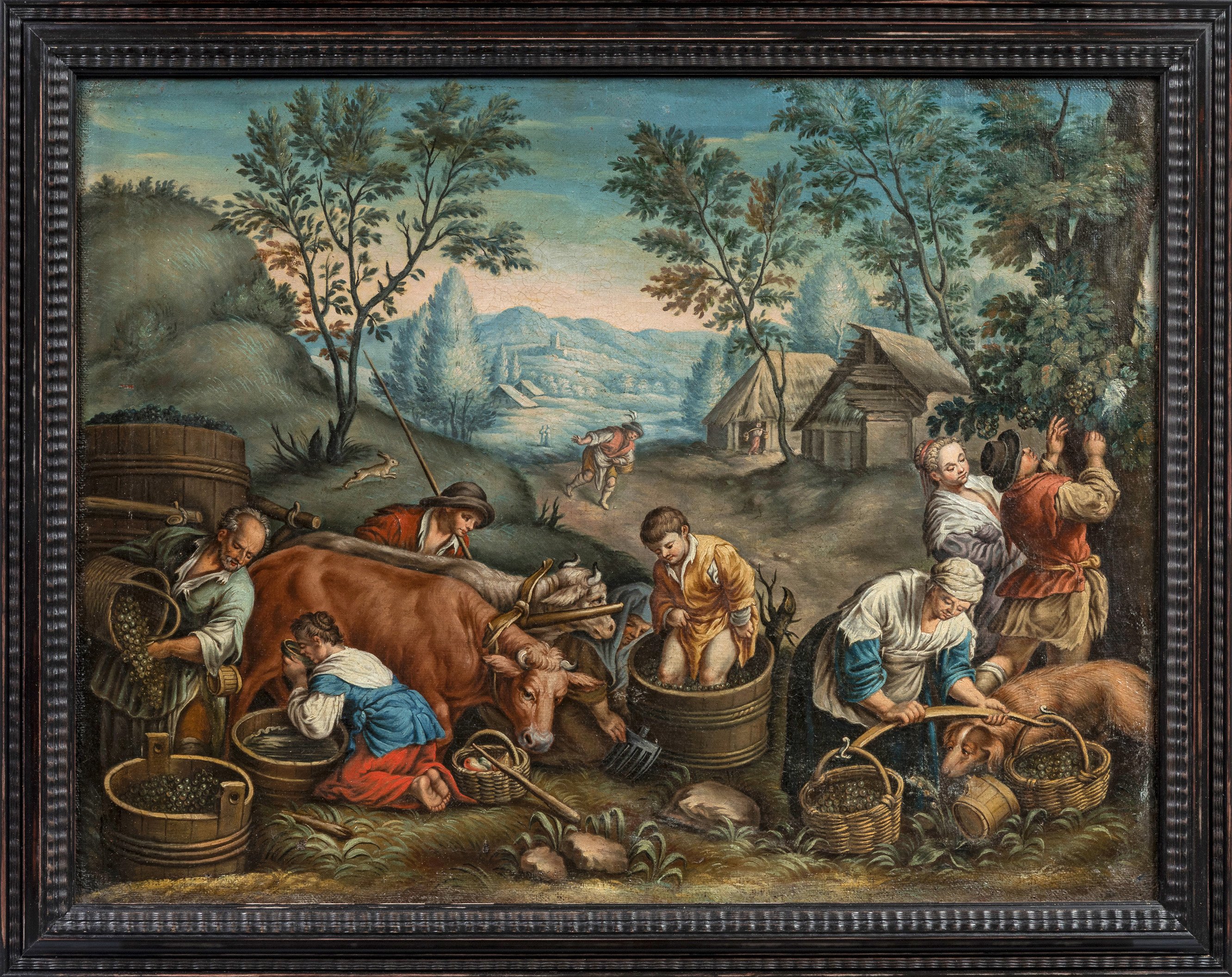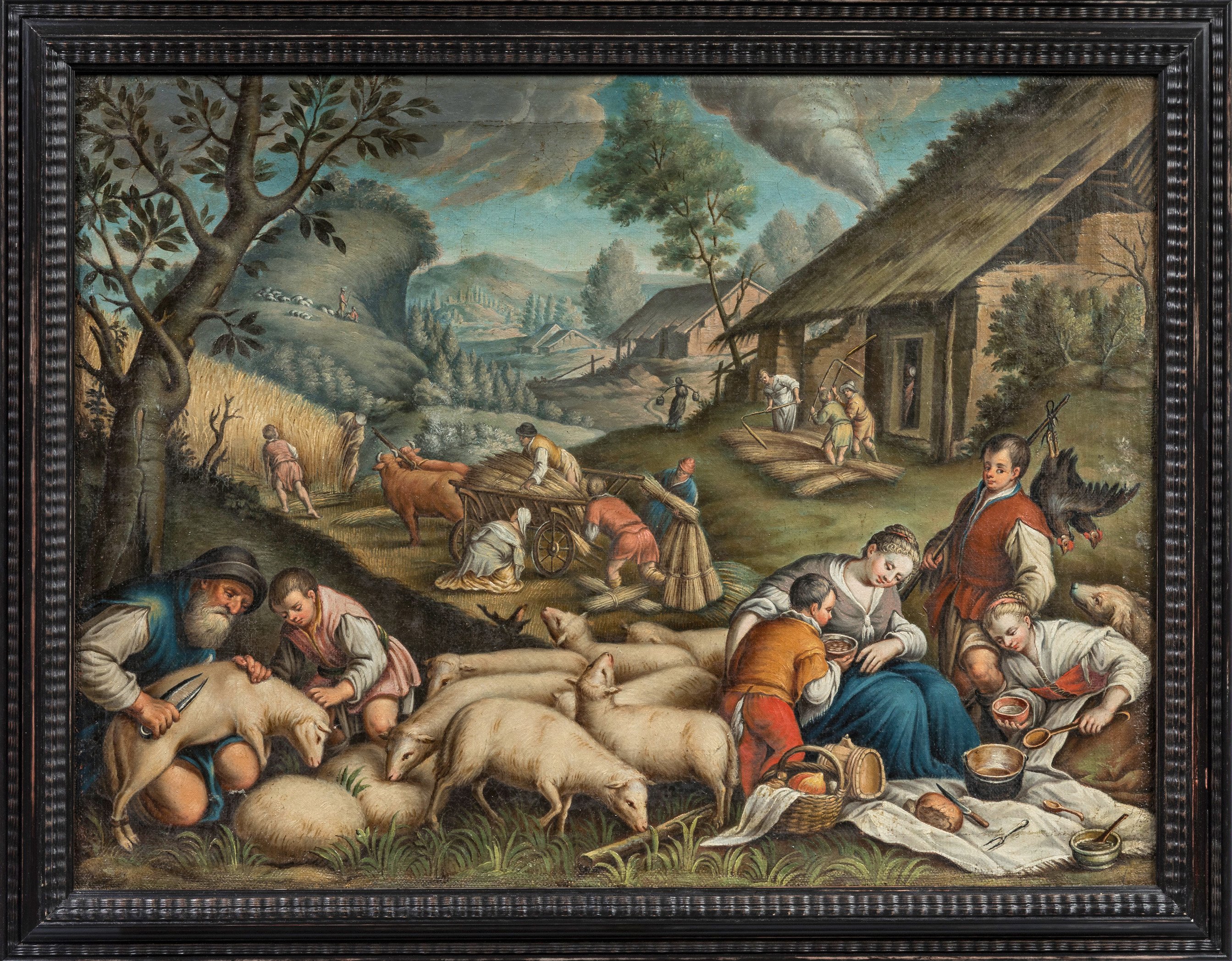A set of paintings depicting the four seasons after Jacopo Bassano. Oil on original canvas. Flemish School ca. 1700.