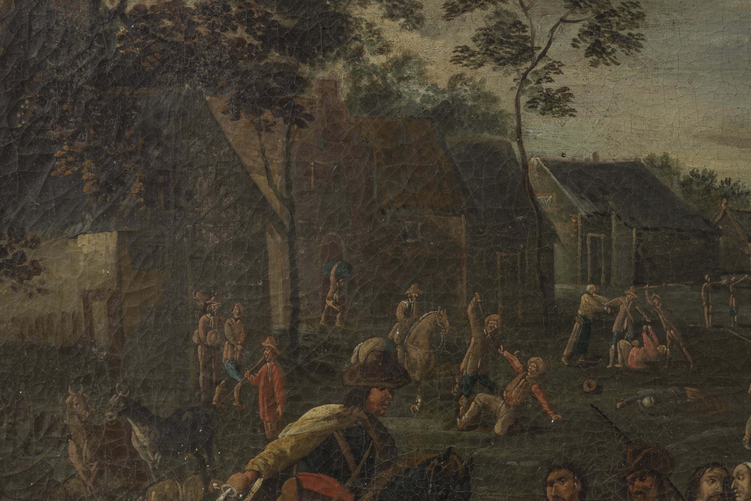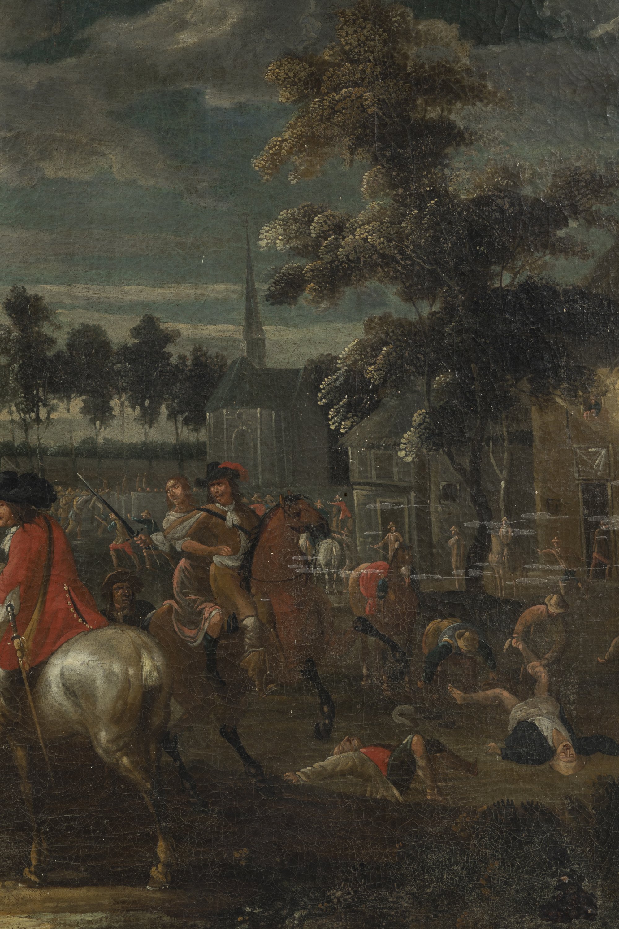 A painting featuring a horseman pardoning prisoners, by the entourage of Hendrick de Meijer. Oil on canvas. Flemish School, ca. 1690. In an 18th century giltwood frame.