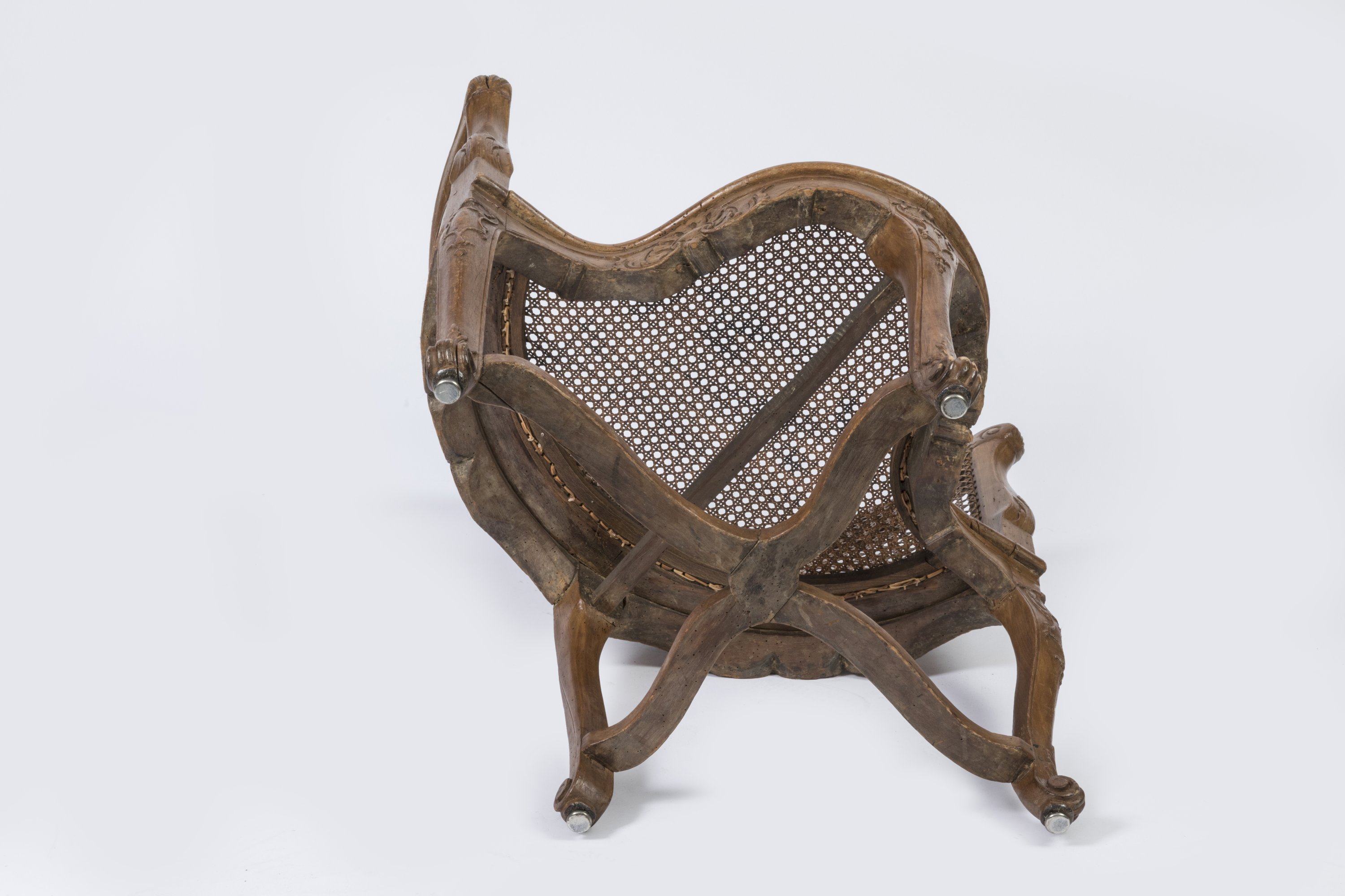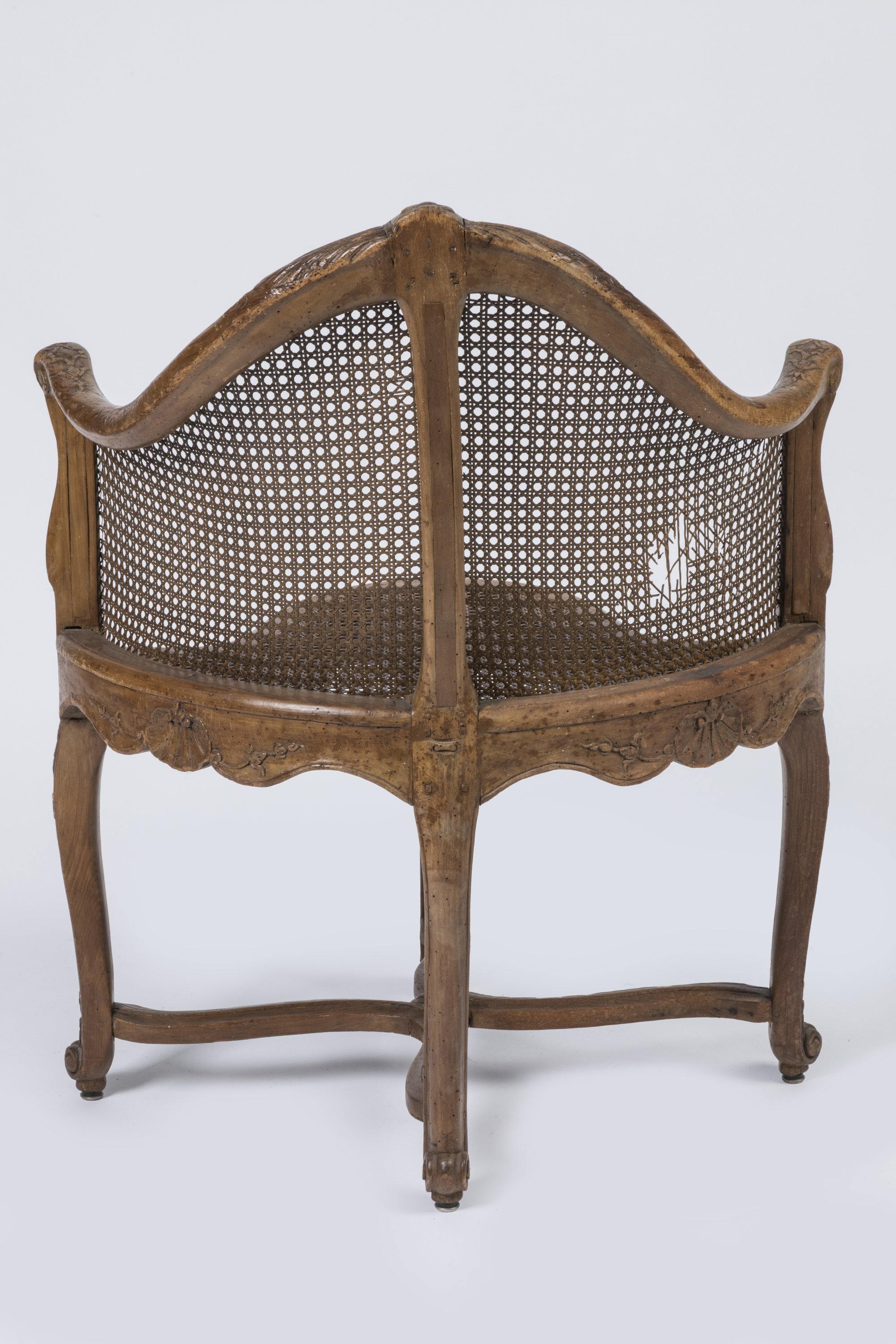 L'amortissement du dossier à décor de fleurettes et d'acanthe, les accotoirs mouvementés terminés en enroulement sont décorés de cartouches et d'acanthe. La ceinture mouvementée est ornée de motifs végétaux et de coquilles. Il repose sur quatre pieds cambrés à décor de cartouches reliés par une entretoise en X décorée d'une fleur en son centre.