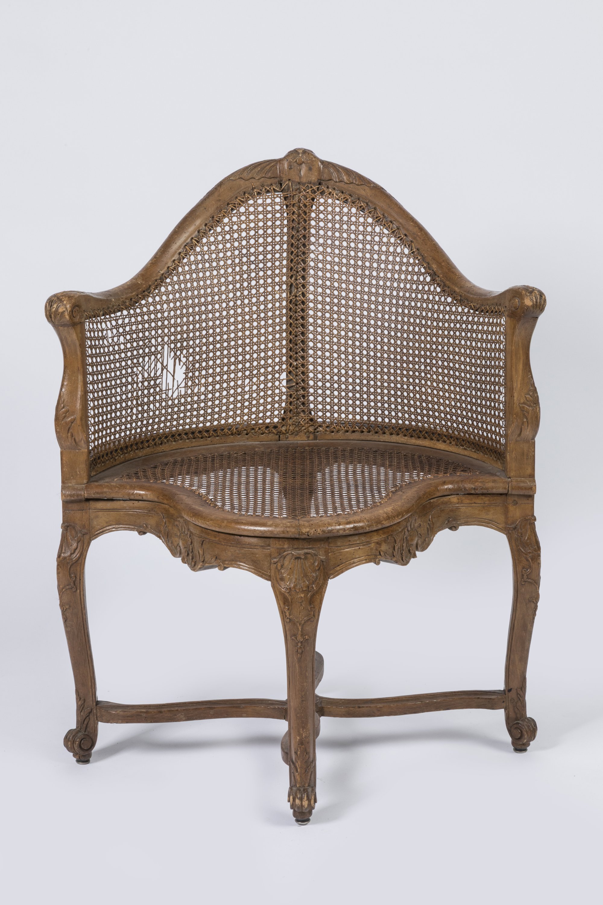 A cane desk chair in varnished, moulded and carved beechwood. Regency Period, presumably manufactured in Lyon.