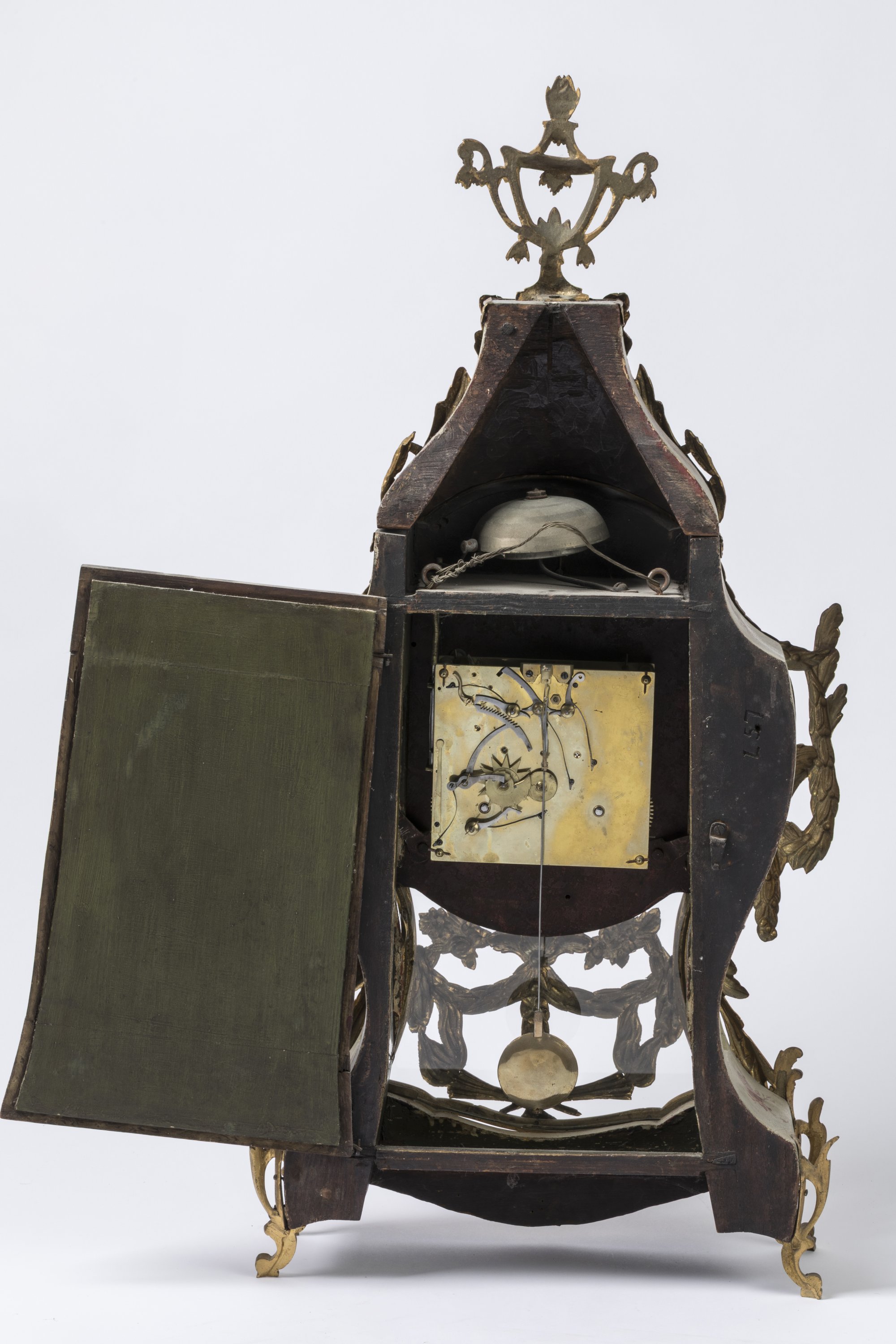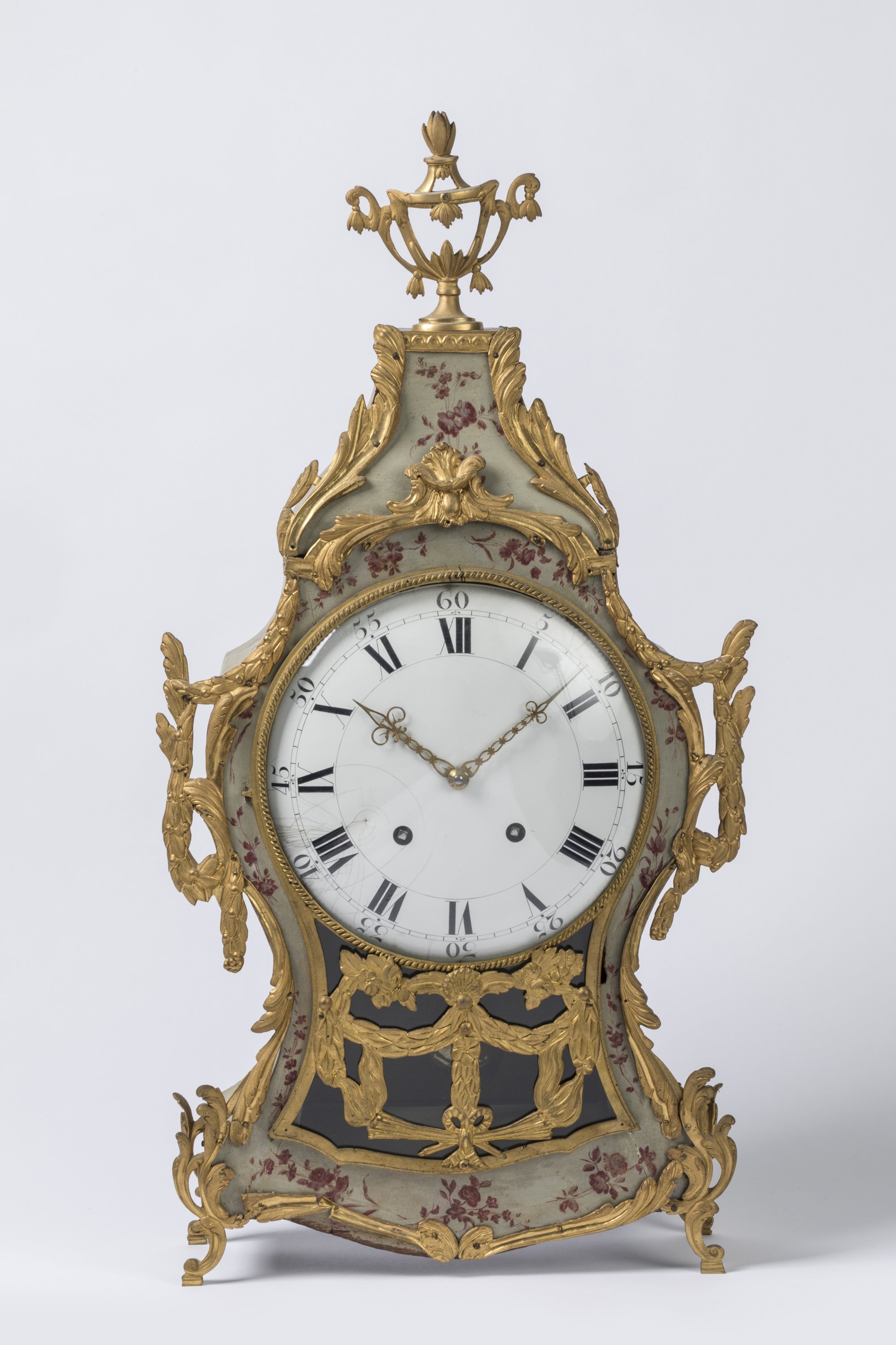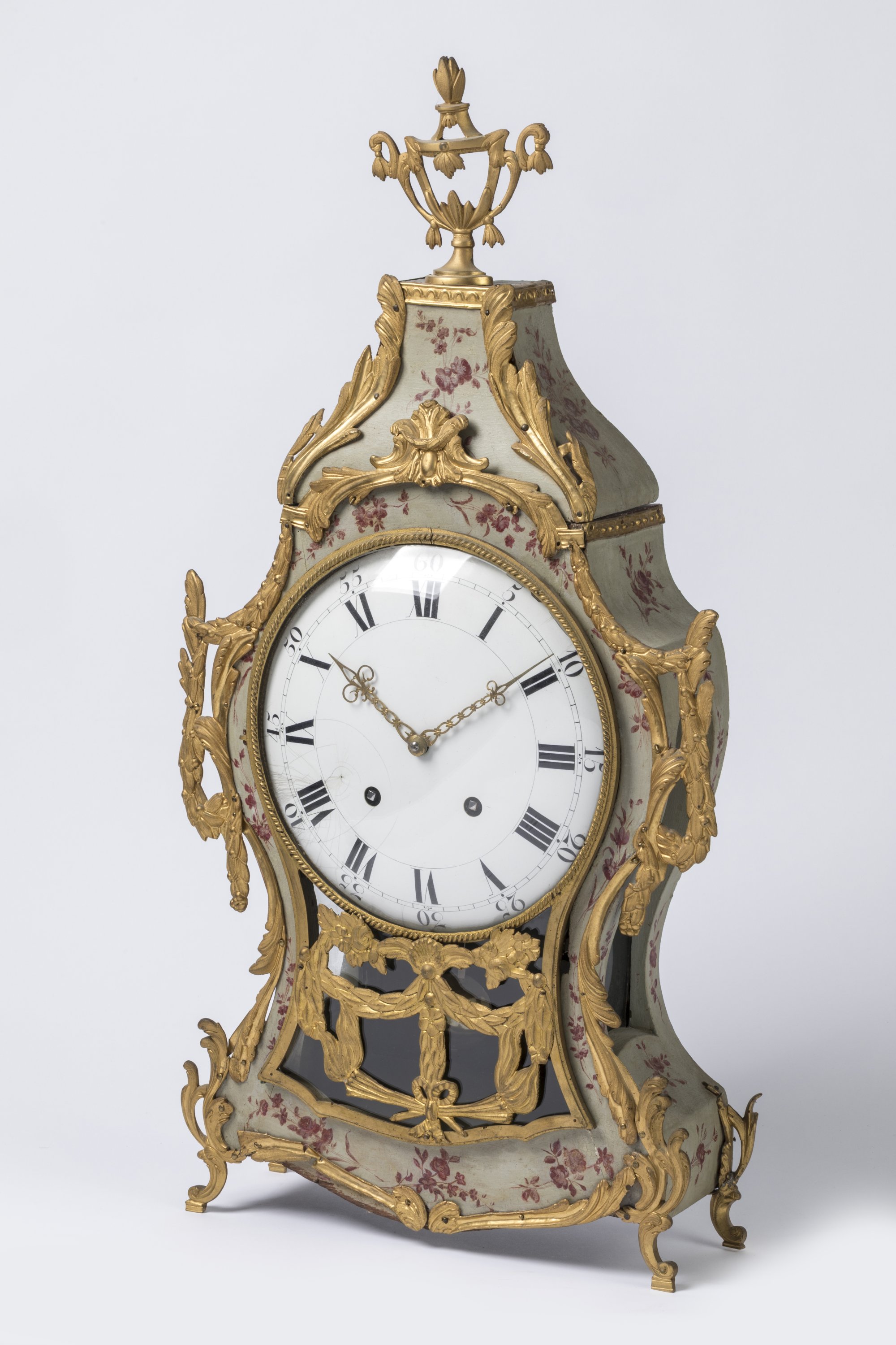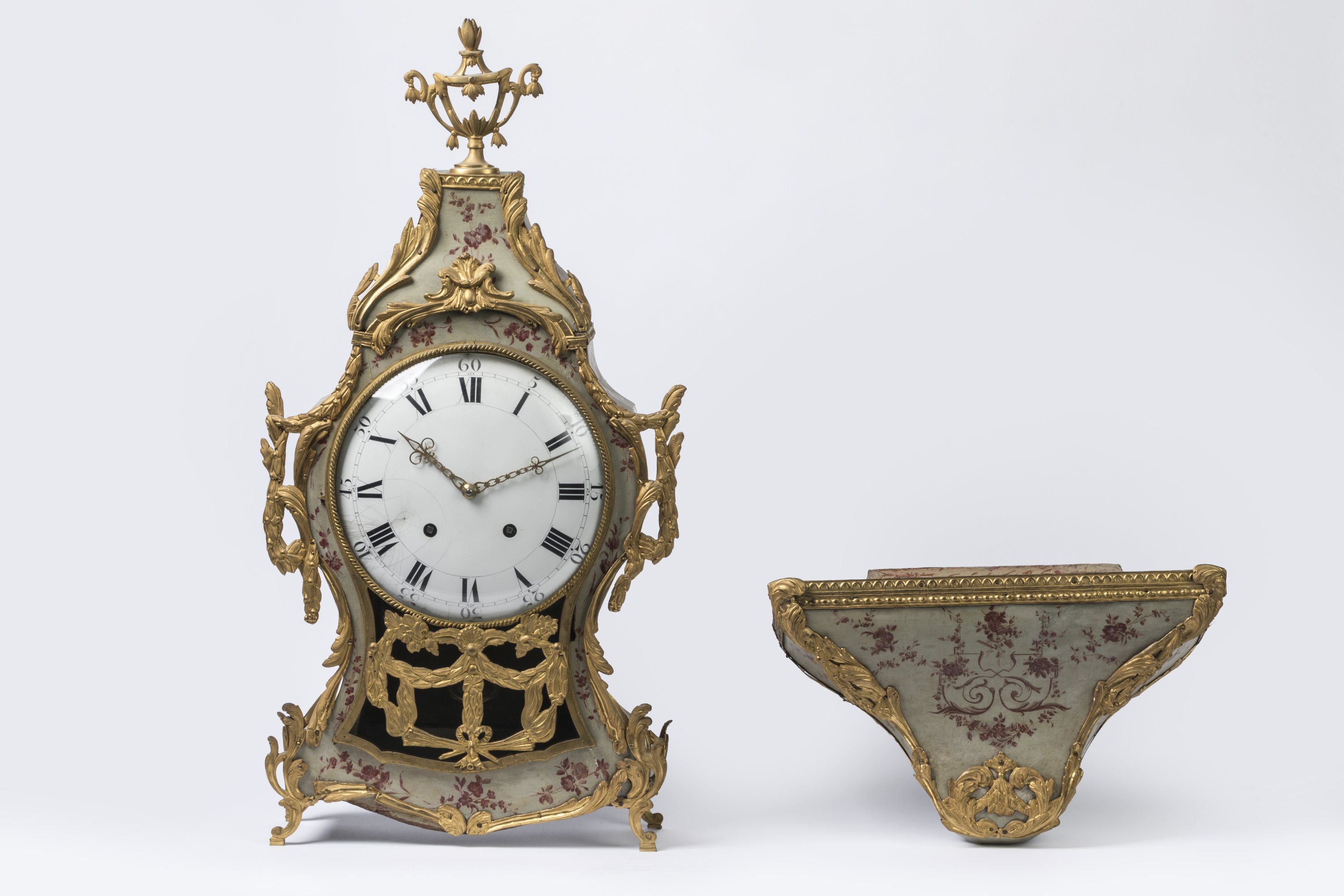 A Louis XV violin-shaped wood wall clock and its cul-de-lampe. Decorated with red flowers on a green background. Partly manufactured in the 18th century.