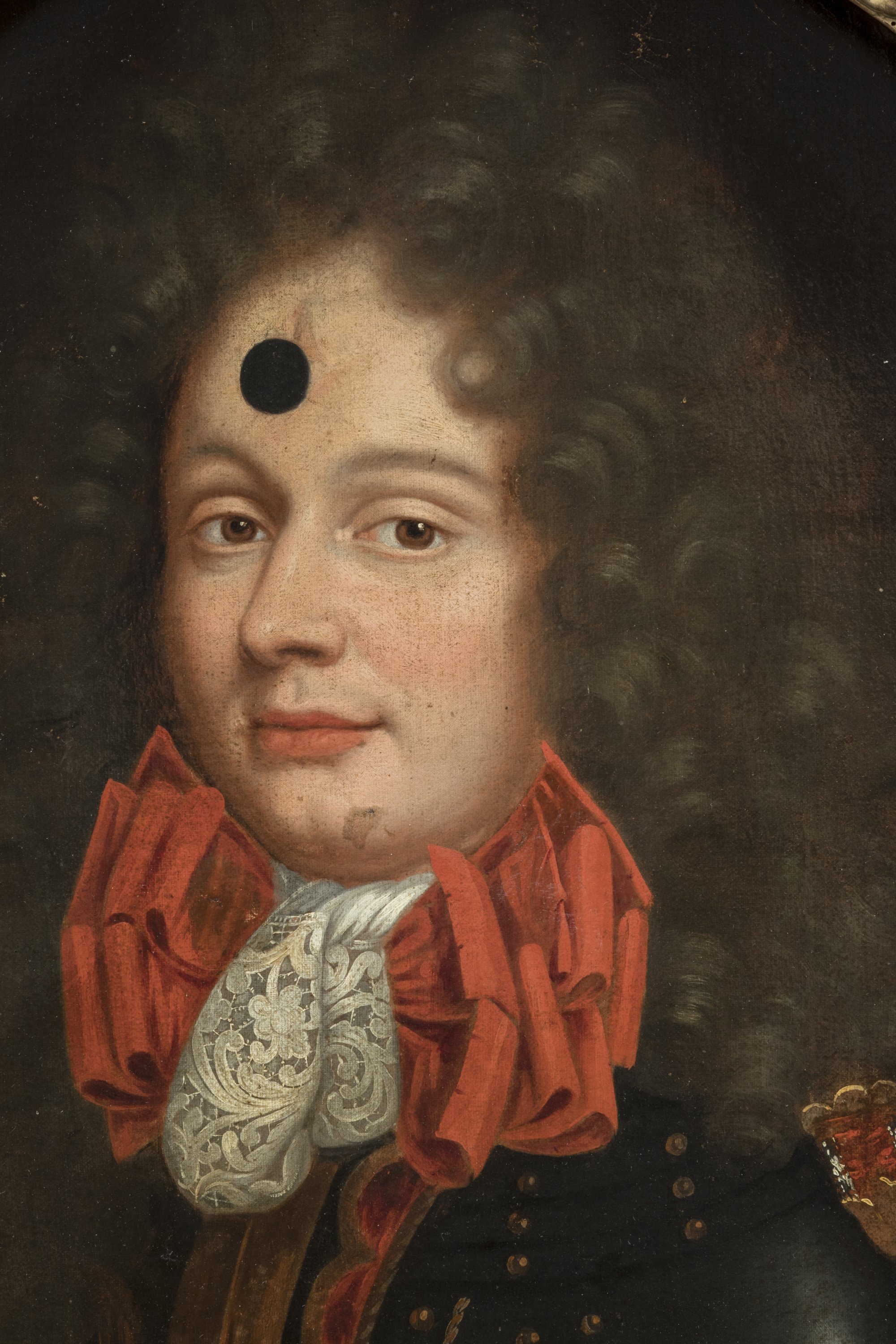 A portrait of a man in armor hoding a marshal's baton by the entourage of Pierre Mignard. Oil on oval canvas in a giltwood and stucco frame. French School, ca 1680.