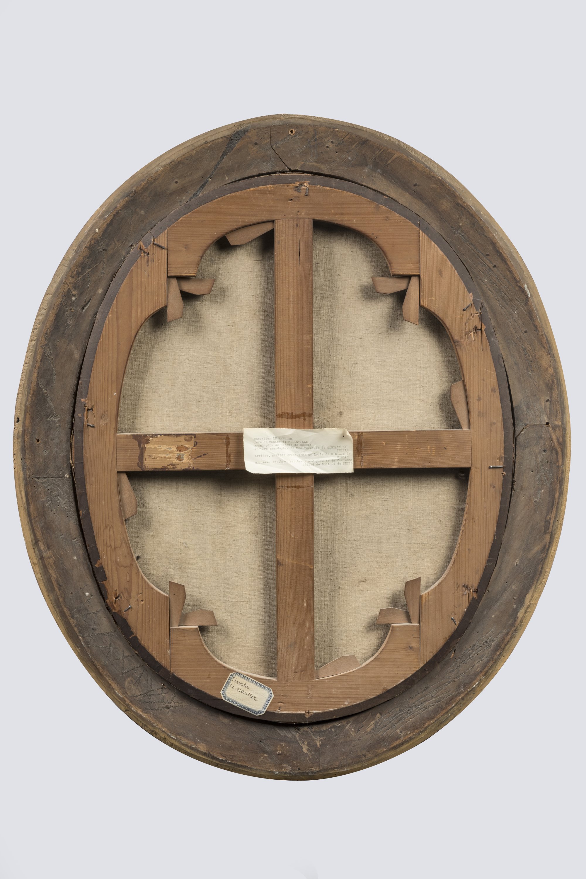 Inscription au revers du châssis "portrait du chevalier le Hantier" Père de Madame de Milleville / Grand père de Madame de Corday / arrière grand père de Mme Théodule de Ghislain de Cernzay / arrière arrière grand père de Louis de Ghislain de Cernay / arrière arrière arrière grand père de la comtesse de Bonardi du Mevil.