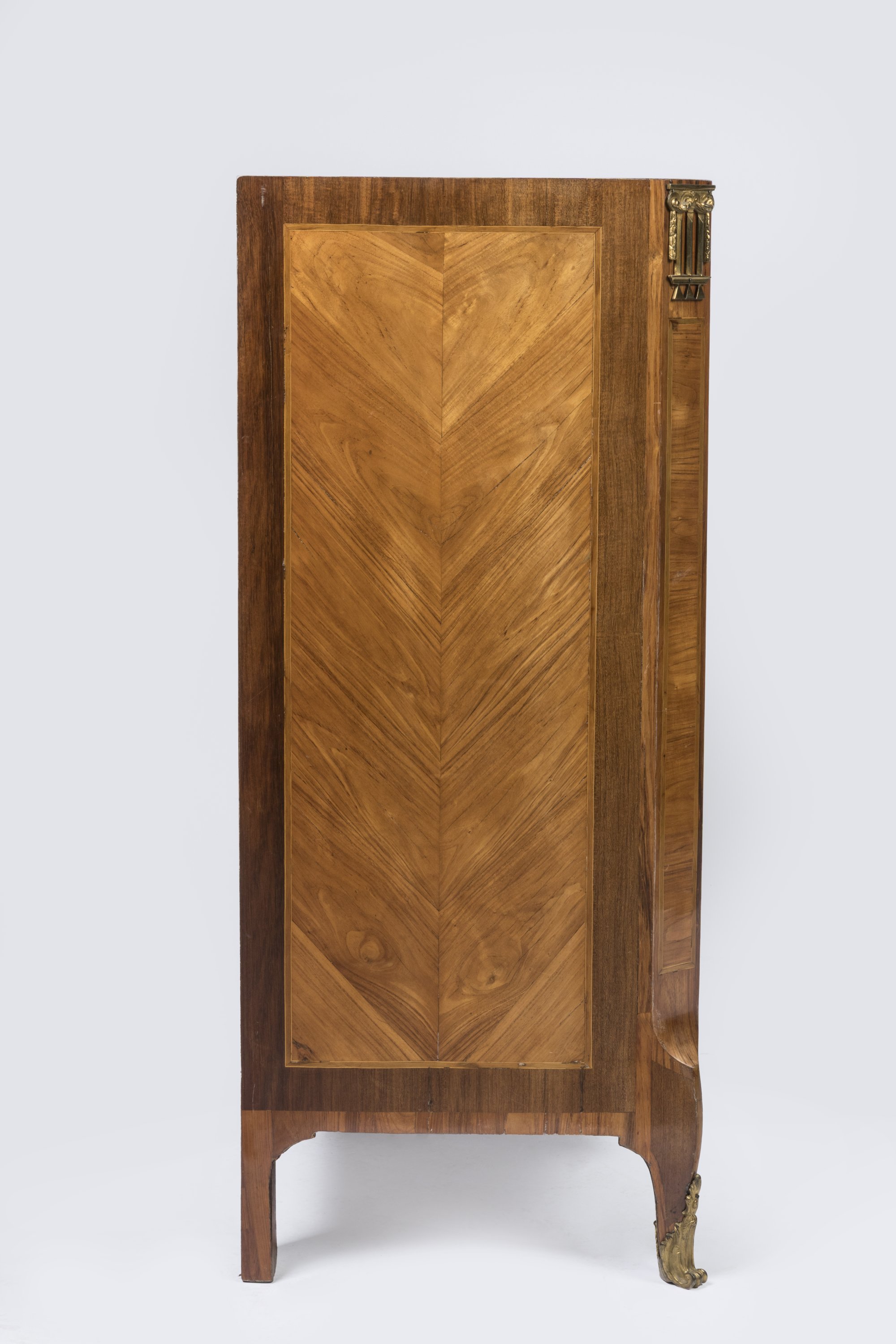 Il ouvre par deux tiroirs en ceinture et trois tiroirs sans traverse. Les montants à pan coupé, les côtés à décor de frisage. Il repose sur des pieds antérieurs cambrés et postérieurs droits. Ornementation en bronze doré comme entrées de serrure, chutes, sabots et cul de lampe.