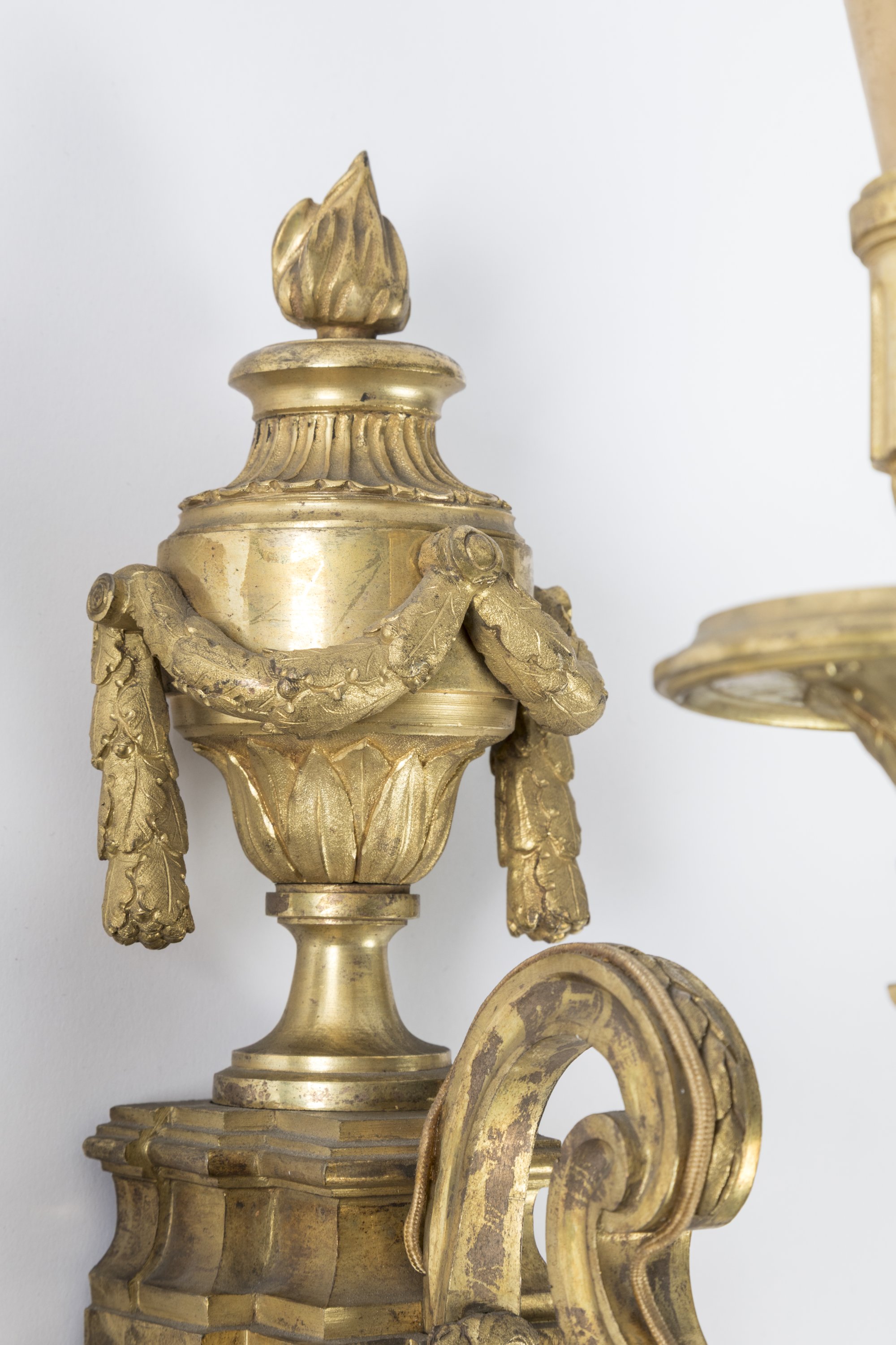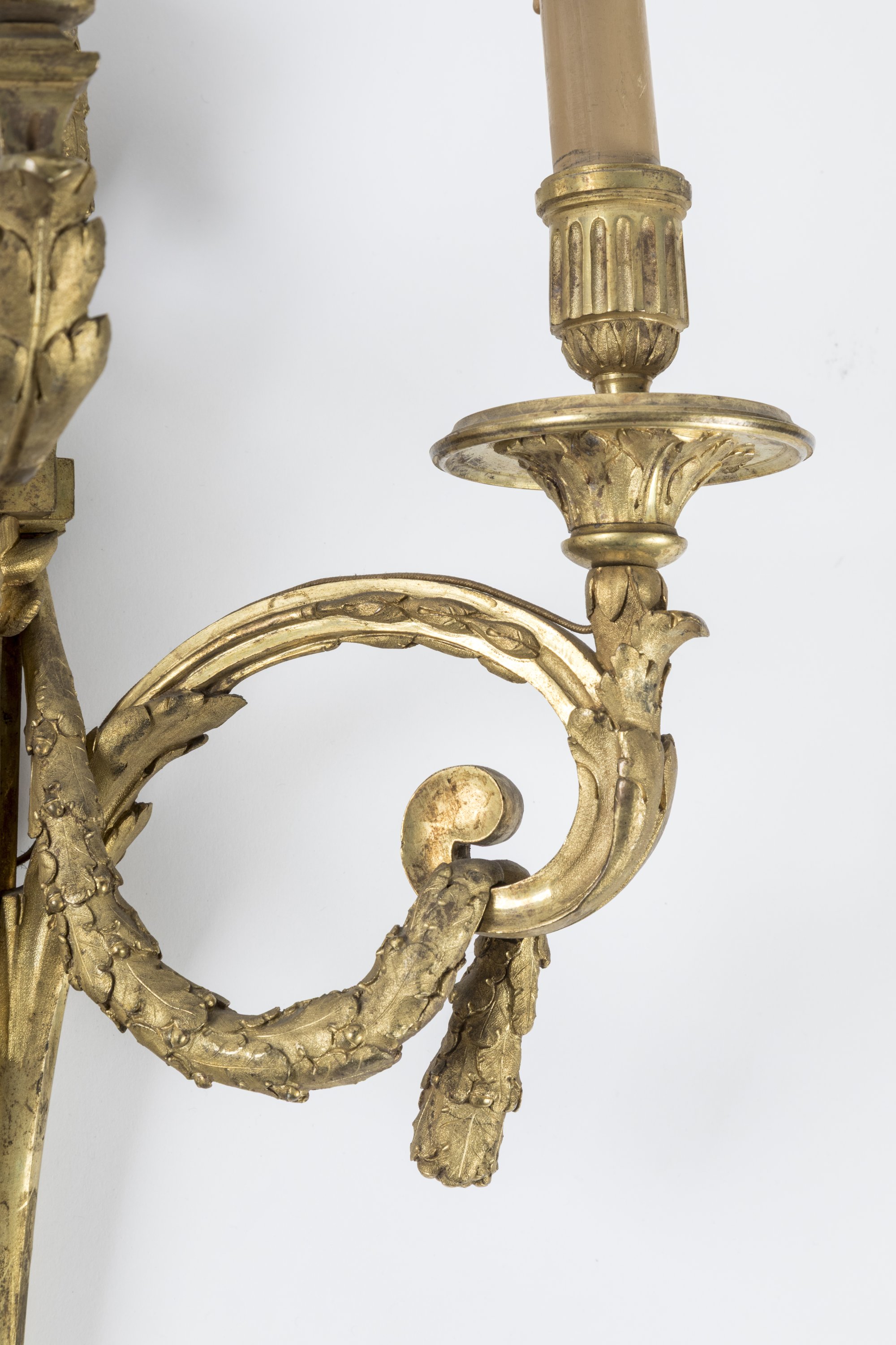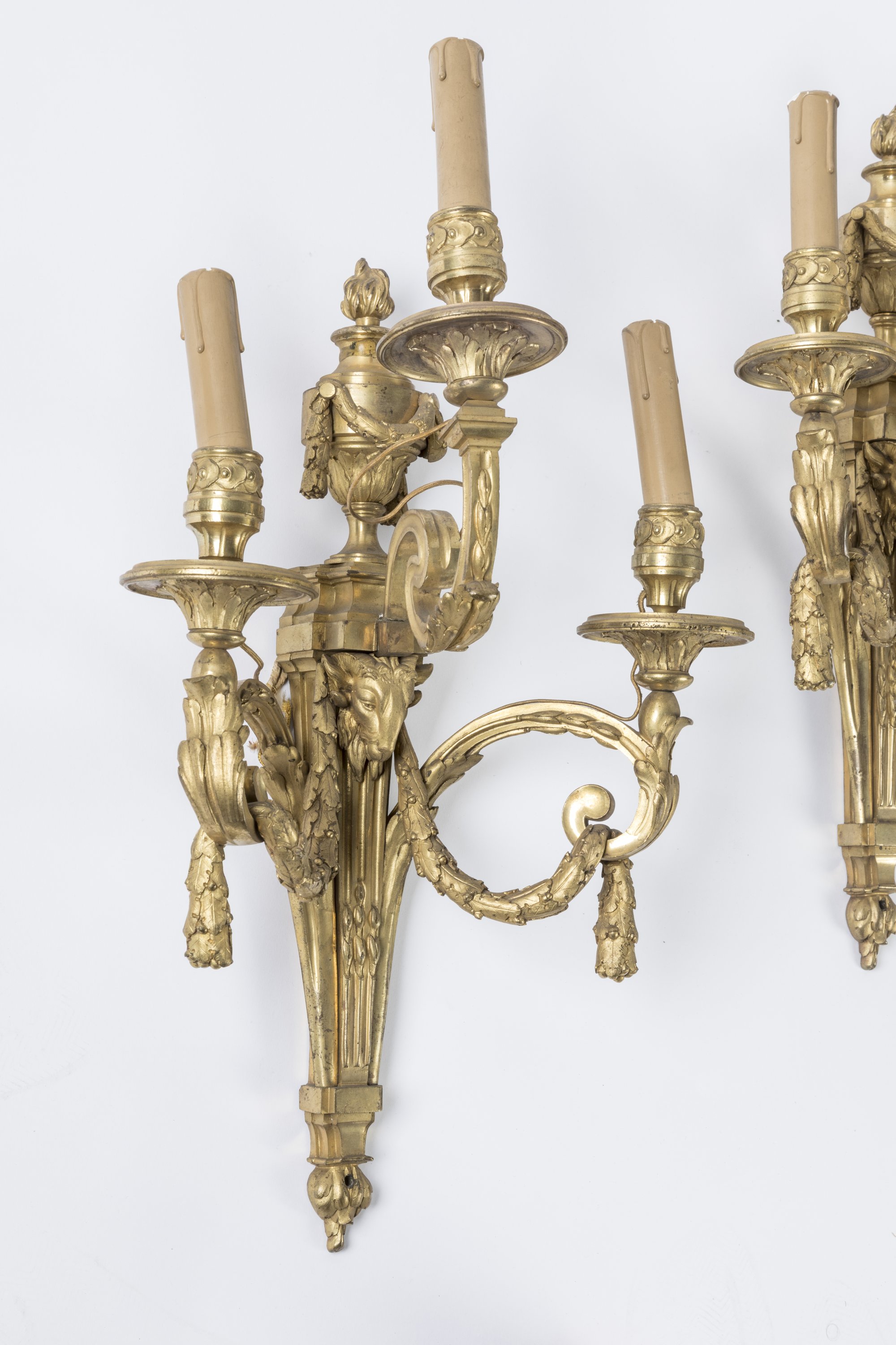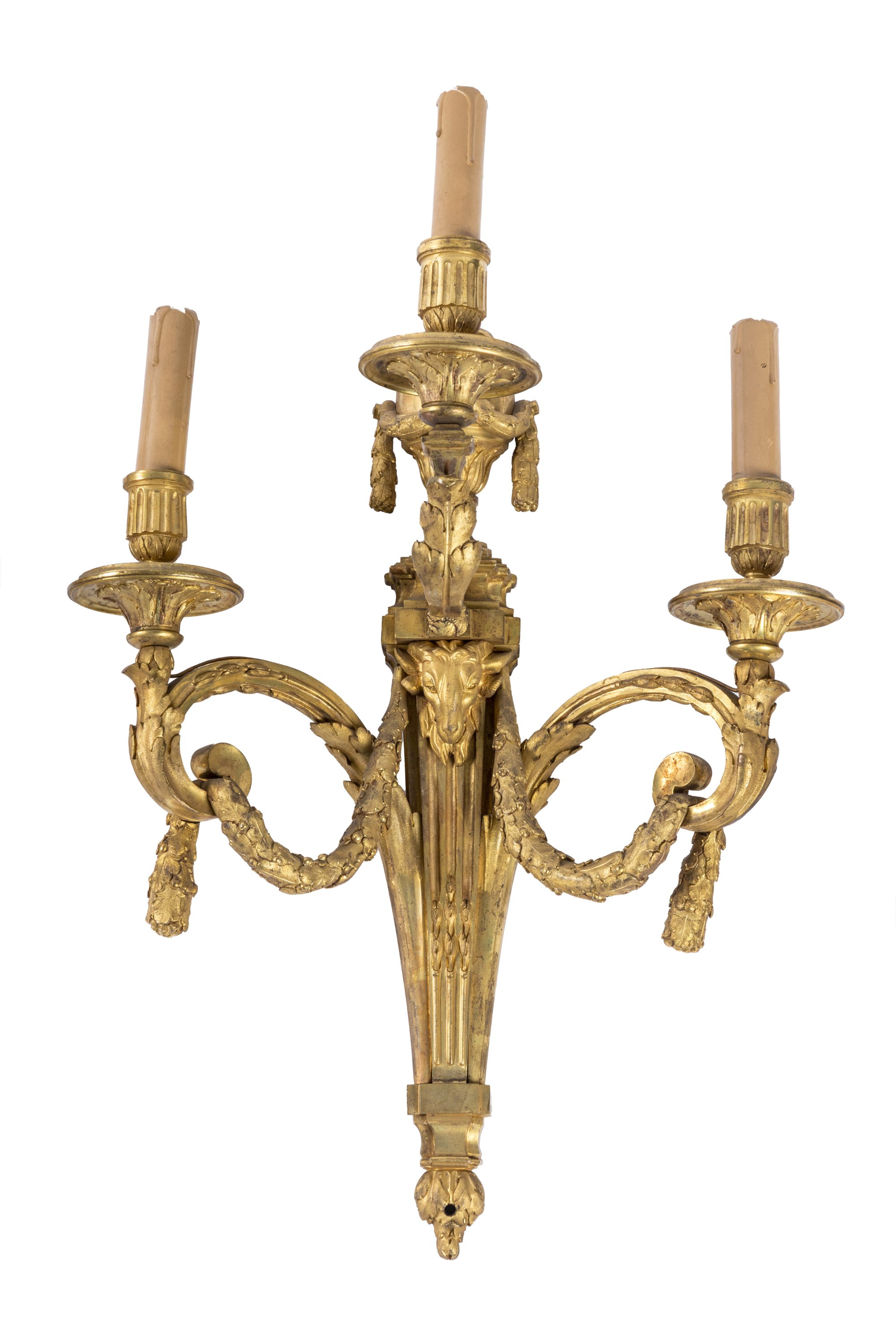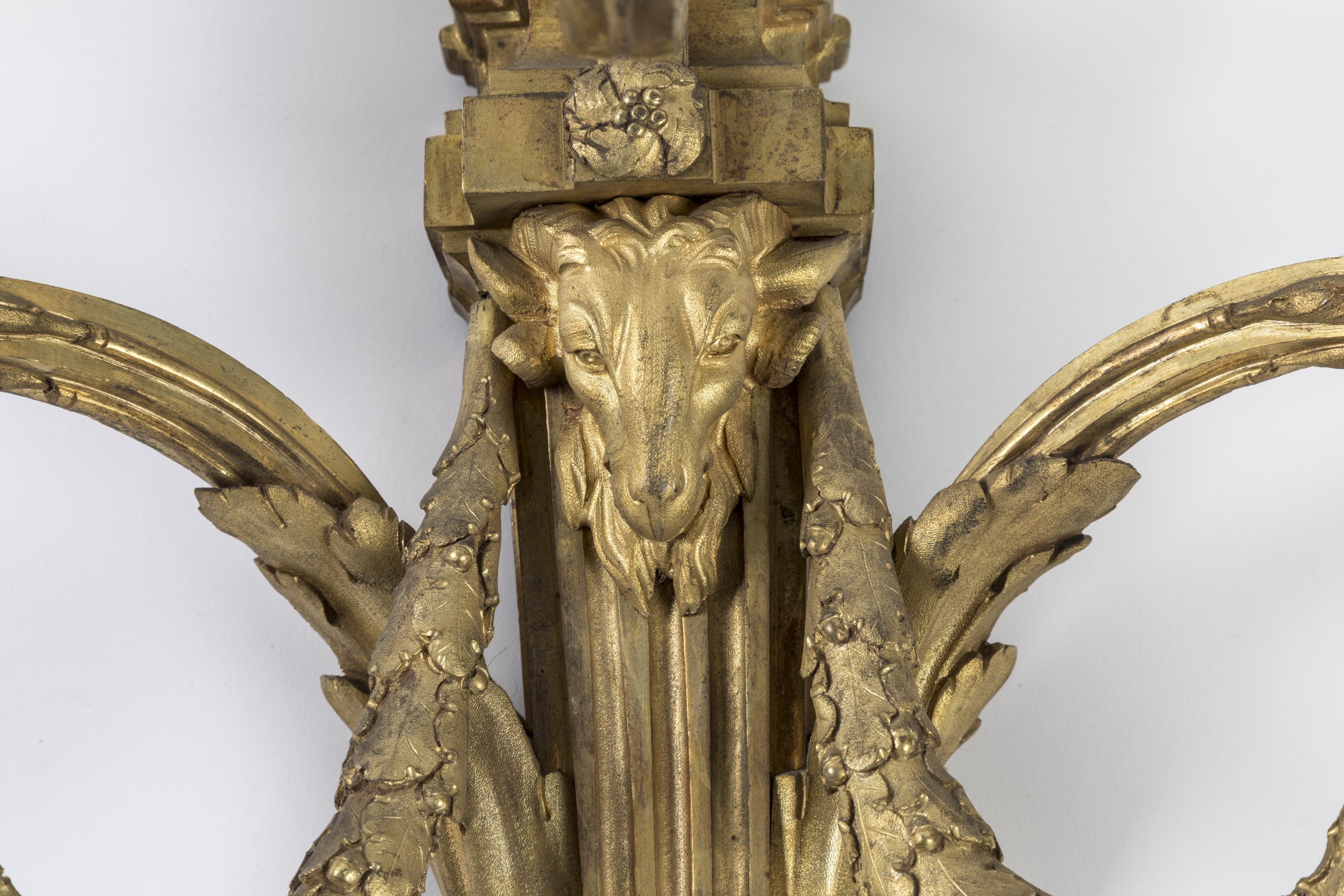 A set of four chiseled ormolu wall sconces decorated with ram heads, after a model from Jean-Charles Delafosse. Louis XVI Period.