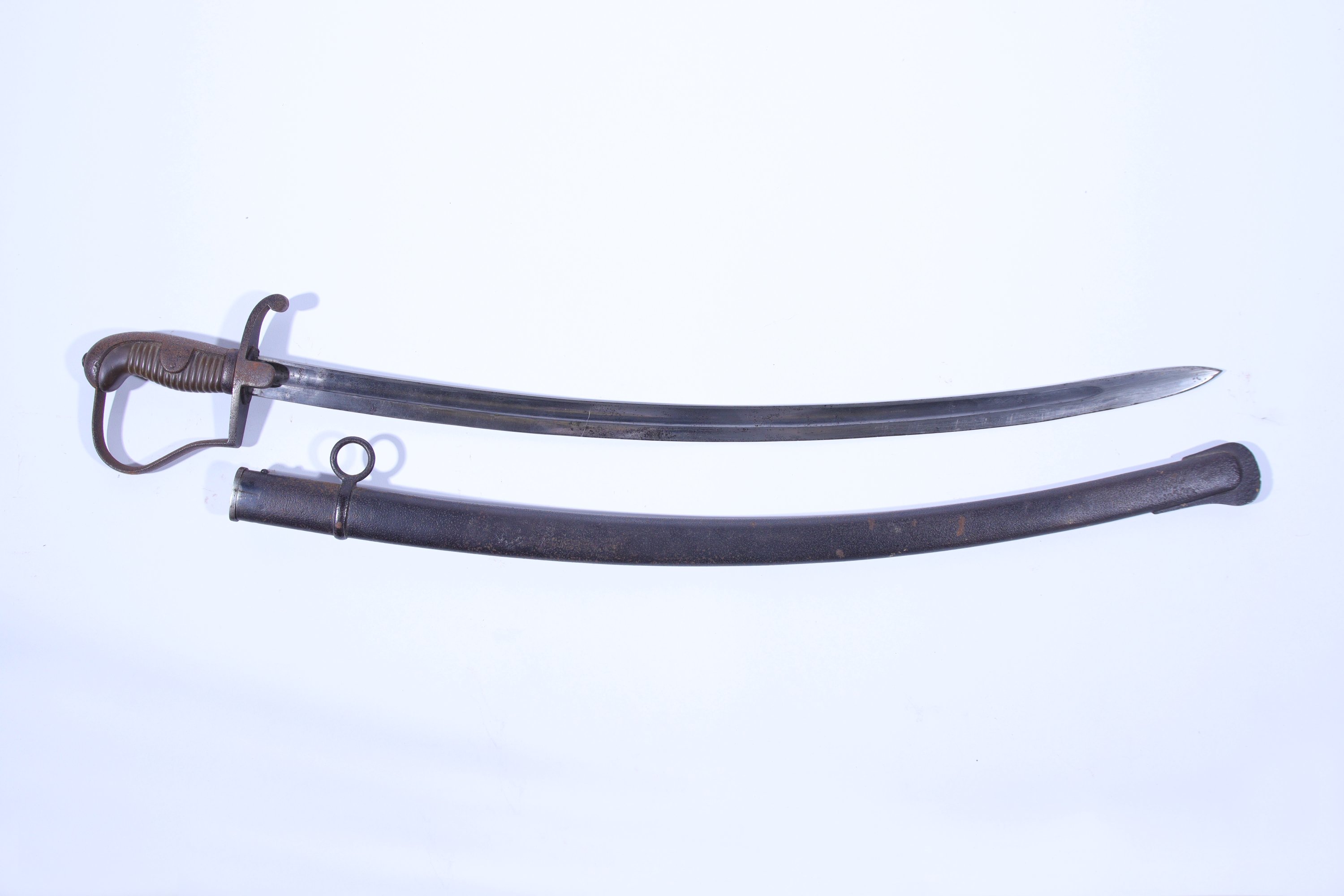 Monture en fer, garde à la Blücher, à demi-oreillons (matricule biffé). Lame courbe à dos plat daté « 15 ». Fourreau en tôle de fer à un bracelet fixe.