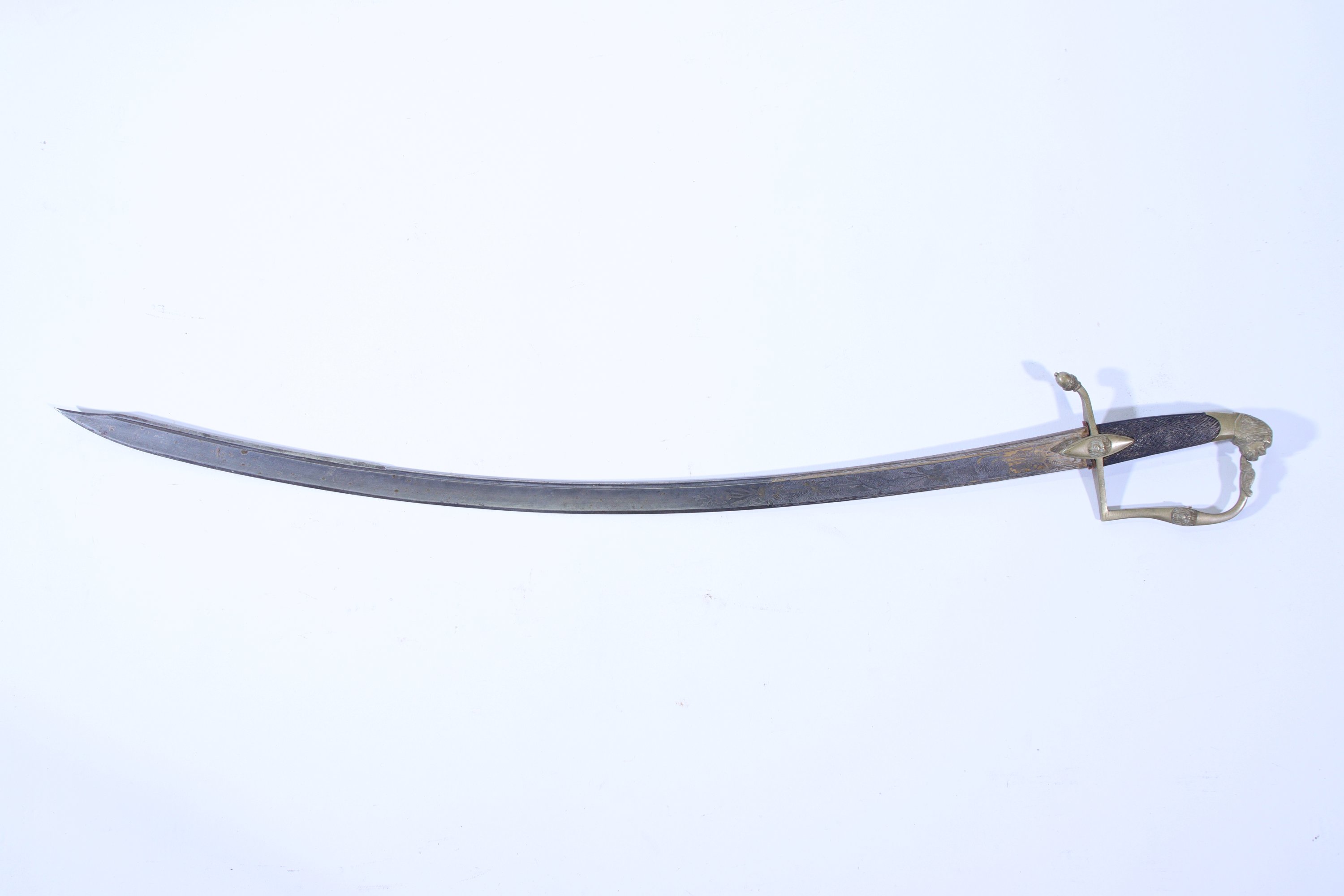 Poignée en bois quadrillée, monture en laiton, pommeau en tête de lion, garde à une branche et oreillons en navette décorés de mufles et de lions, quillon en forme de gland.