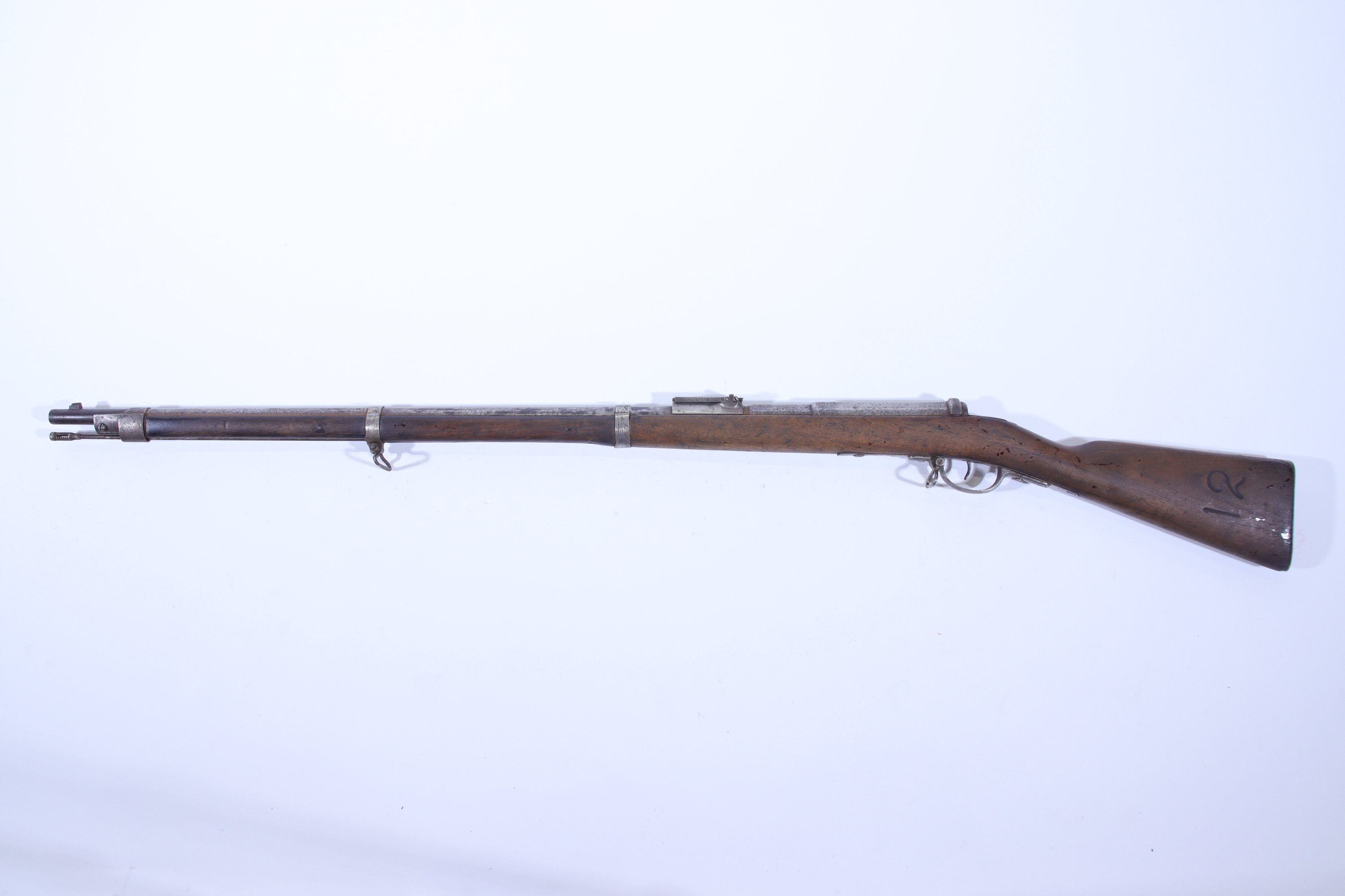 Canon rond, à pans au tonnerre, poinçonné « Danzig », avec hausse. Boîtier de culasse marqué « JG Mod 71 » , daté 1873 et 1874. Garnitures en fer poinçonné, pontet en fer. Crosse en noyer avec marquage au fer 12.