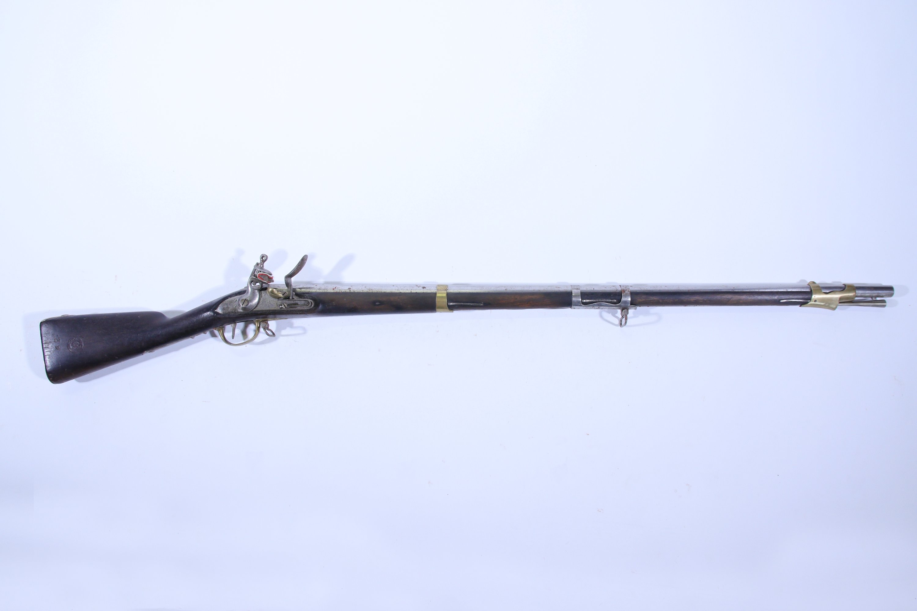 Garnitures en laiton et grenadière à double bande en fer. Crosse en noyer avec joue. Baguette en fer.