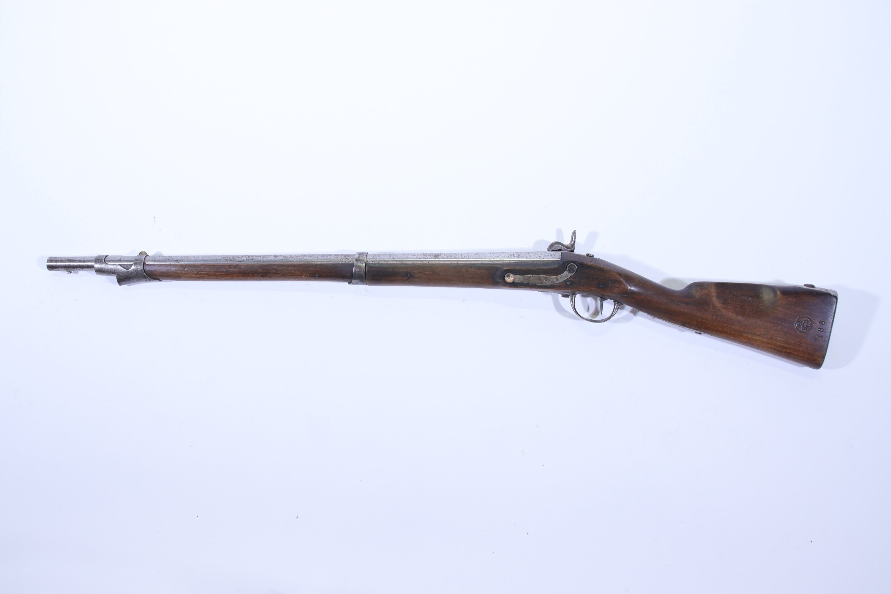 Canon rond à pans au tonnerre daté 1816, queue de culasse frappée M1777. Platine et chien à corps plat, garnitures en fer, crosse en noyer avec marquage PDL.