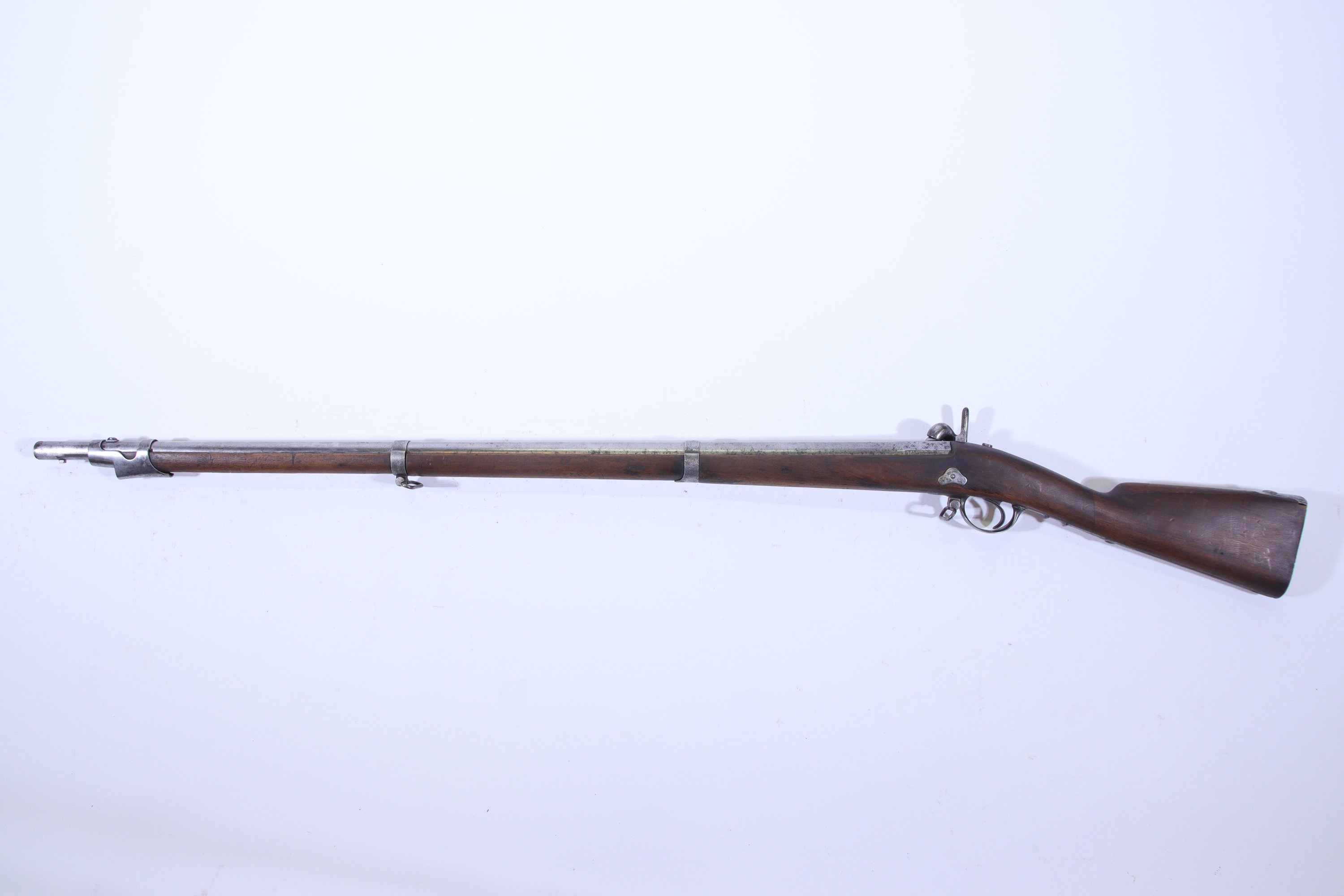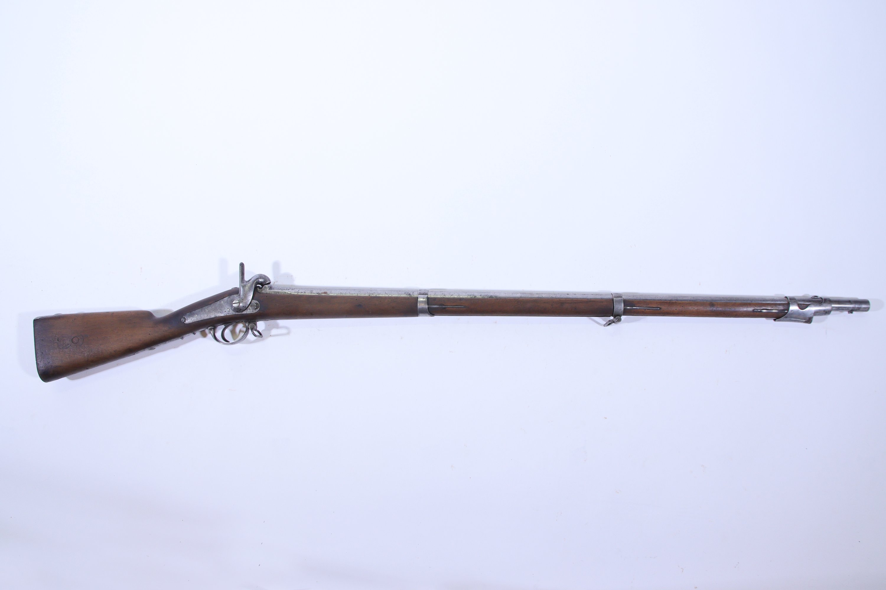 Canon rond à pans au tonnerre, poinçonné, daté 1853. Queue de culasse avec marquages « Le 1842 T ». Platine arrière marquée « Mre Imple de Tulle » et chien à corps rond. Garnitures en fer poinçonné. Plaque de couche frappé « 17 ». Crosse en noyer avec cachet. Manque la baguette