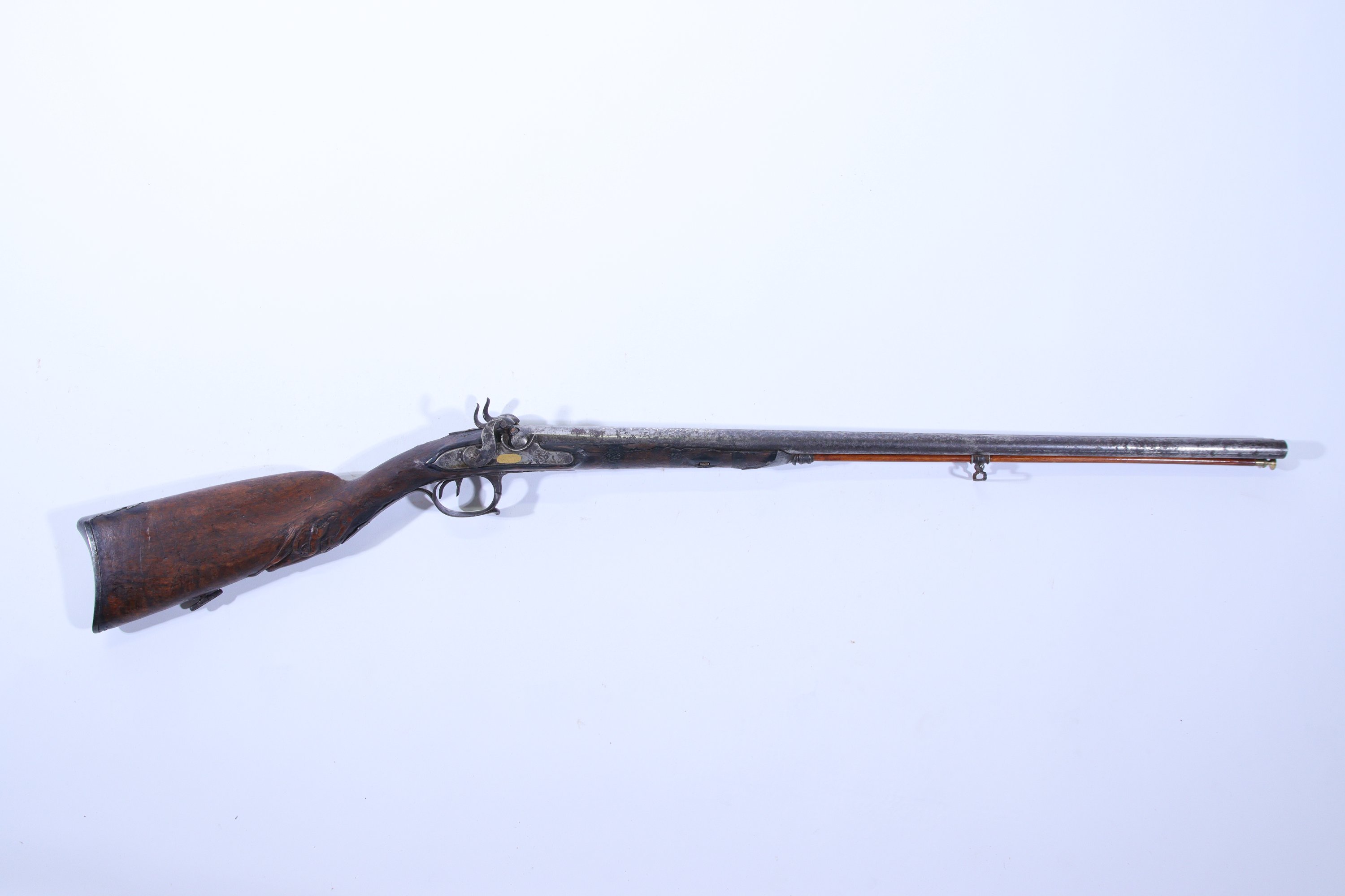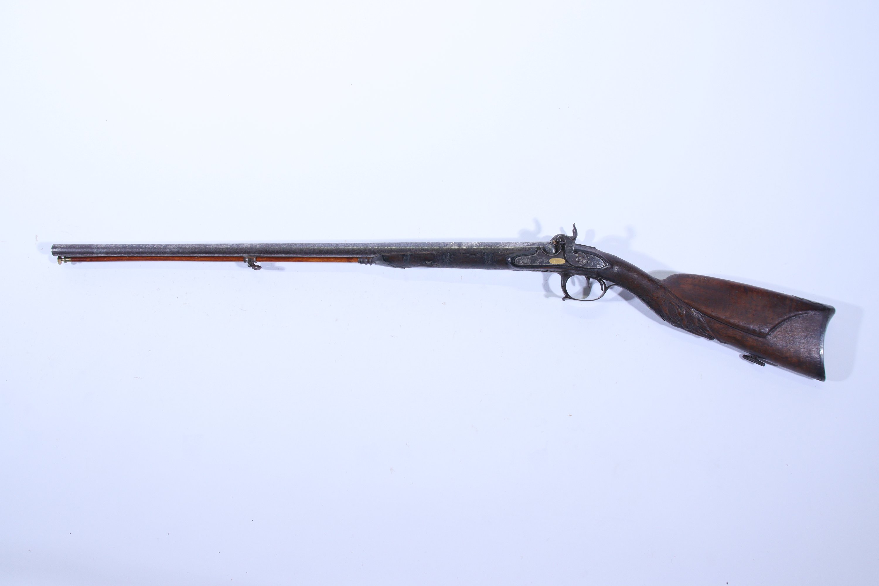 Platines marquées à l’or « Louis Bizalion » et chien à corps plat. Garnitures en fer. Crosse en noyer sculptée d’une hure de sanglier.