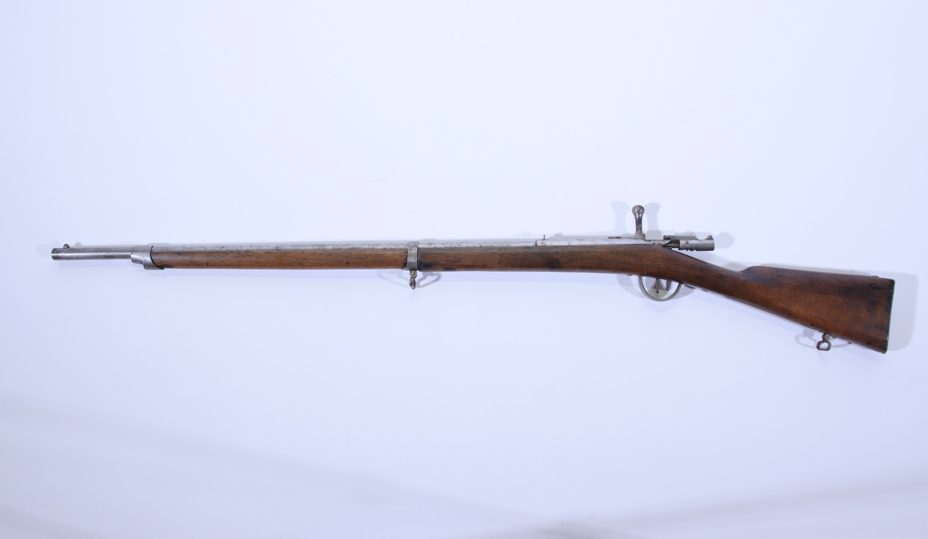 Canon rond, avec cheminée au tonnerre interne. Garnitures en fer (piqûres). Crosse en noyer avec marquage « FUSIL D’HONNEUR »
