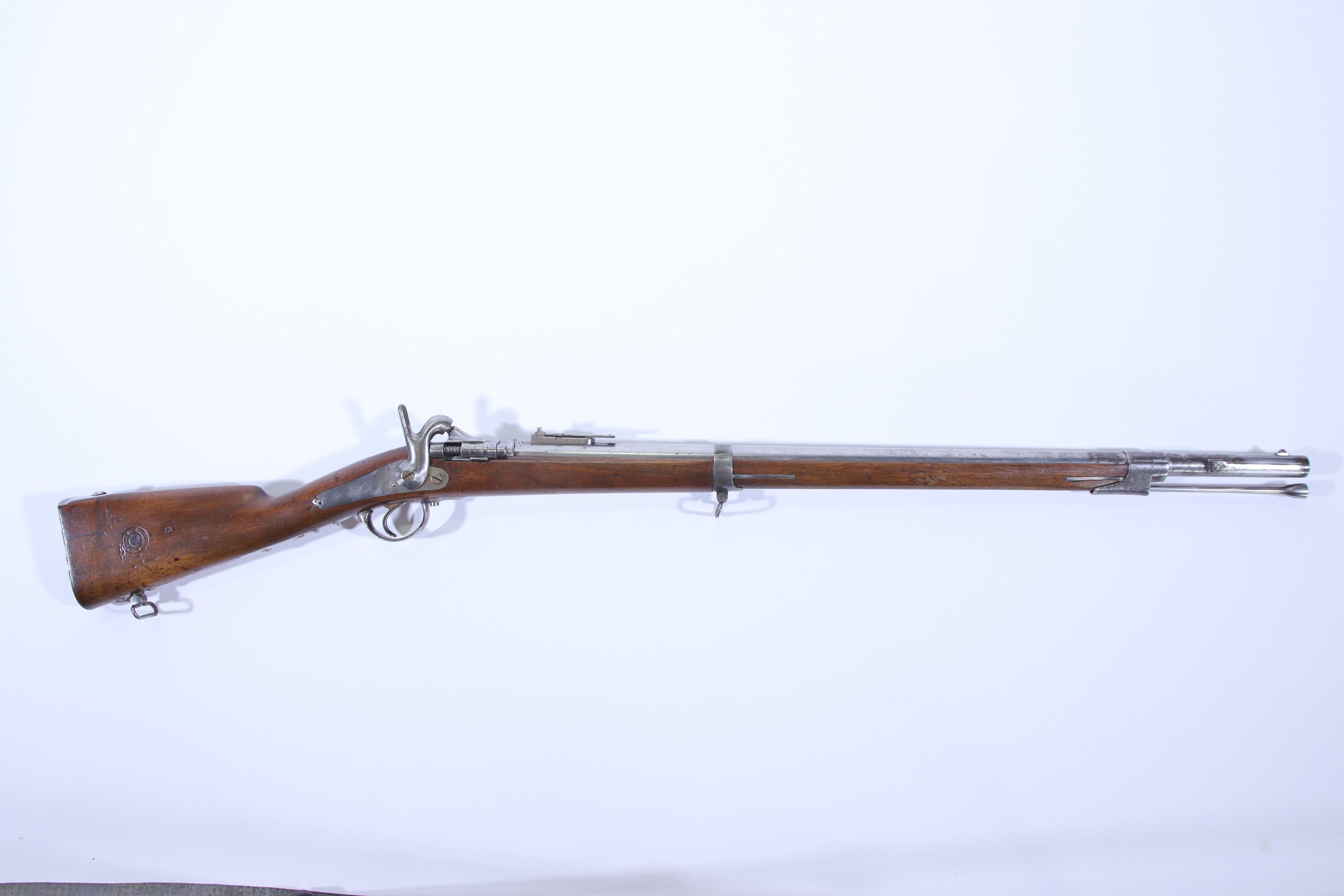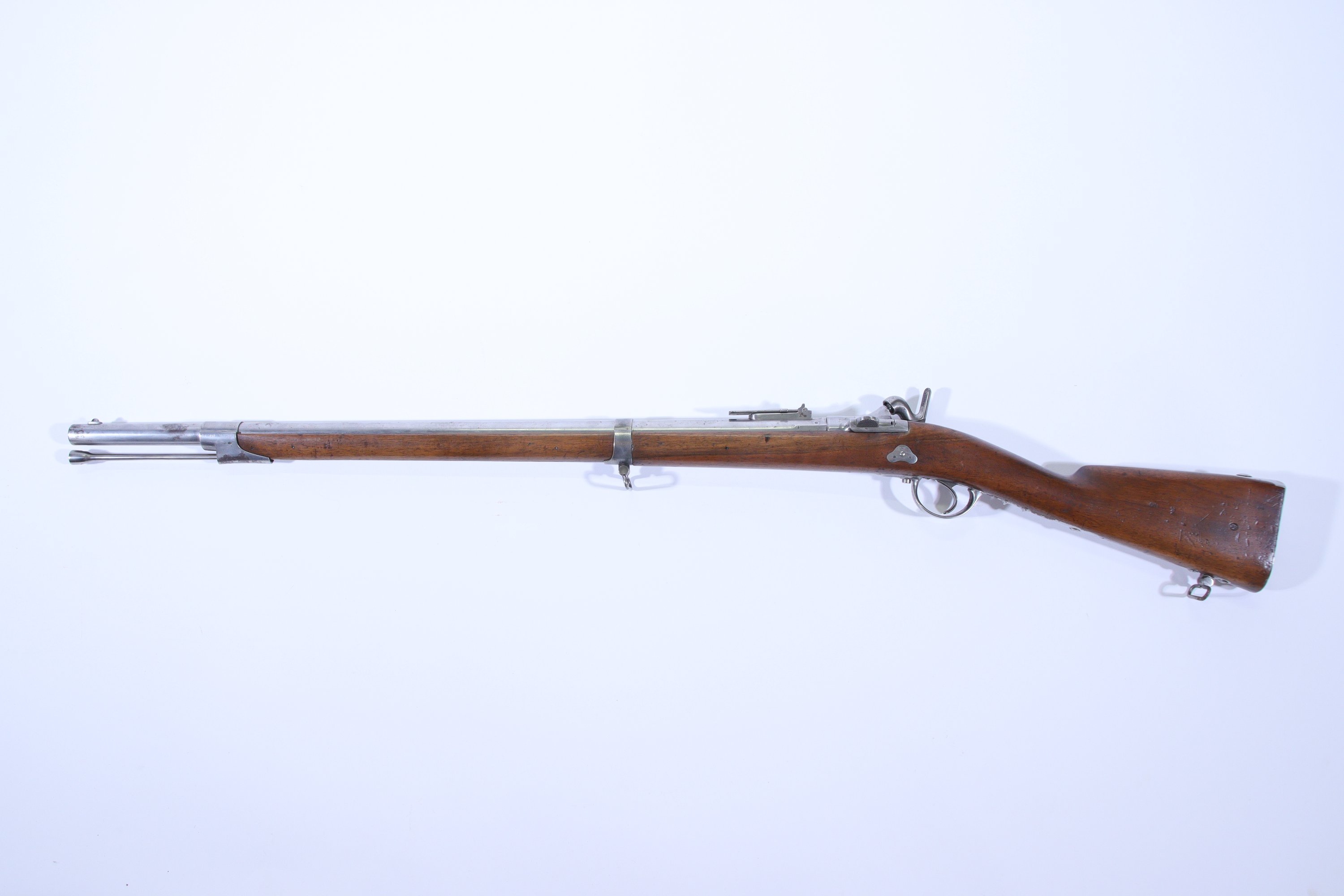 Canon rond avec hausse. Platine arrière « Mre Impale de Chatellerault ». Garnitures en fer poinçonné. Crosse en noyer
