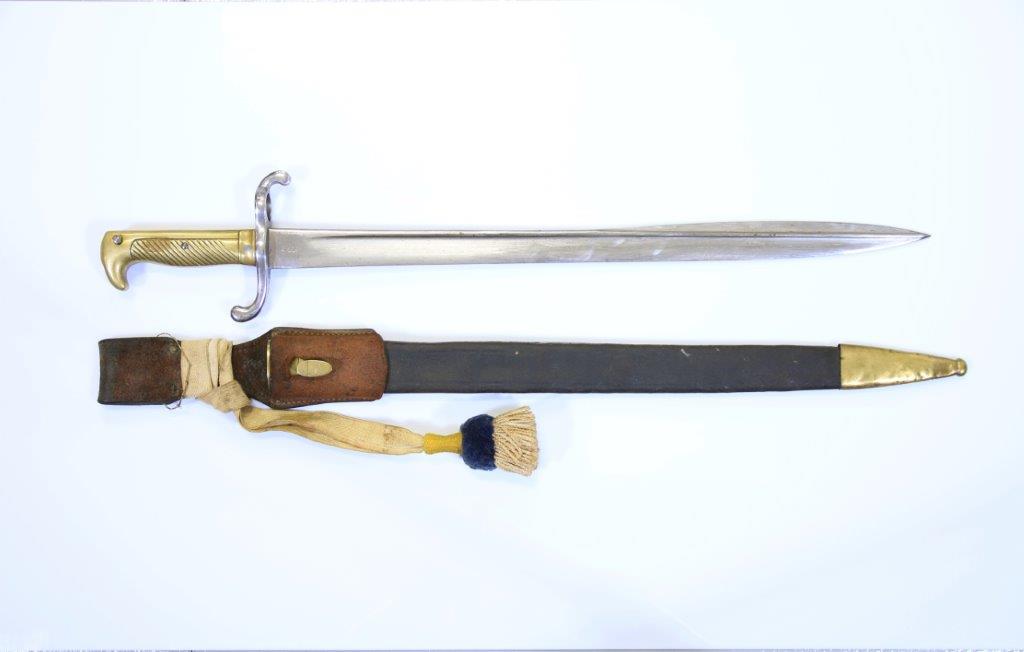 Poignée en laiton matriculée SSR72. Lame poinçonnée GWB datée 61, fourreau en cuir à deux garnitures en laiton (matricules différents), gousset avec dragonne blanche, jaune et bleue.