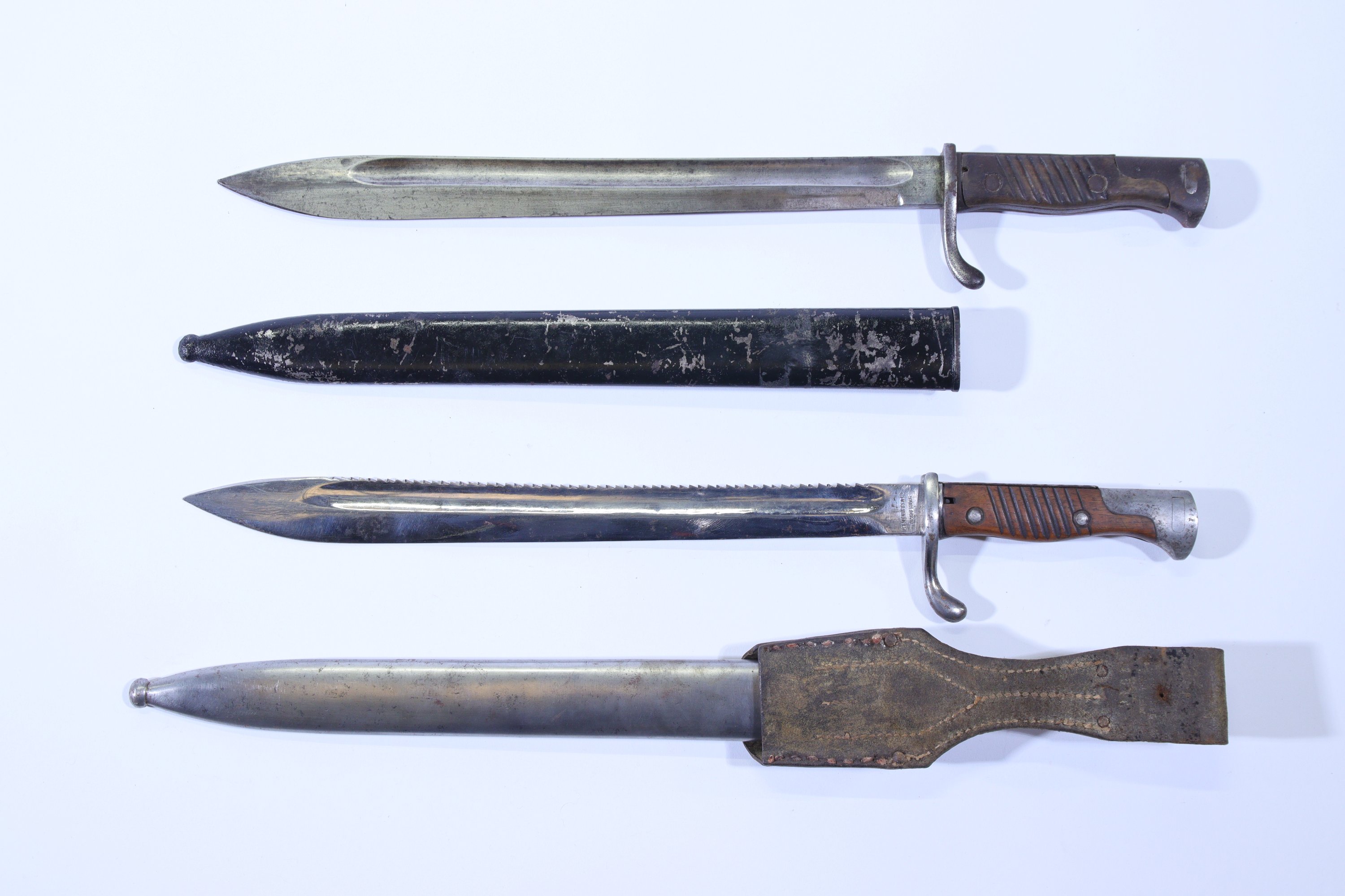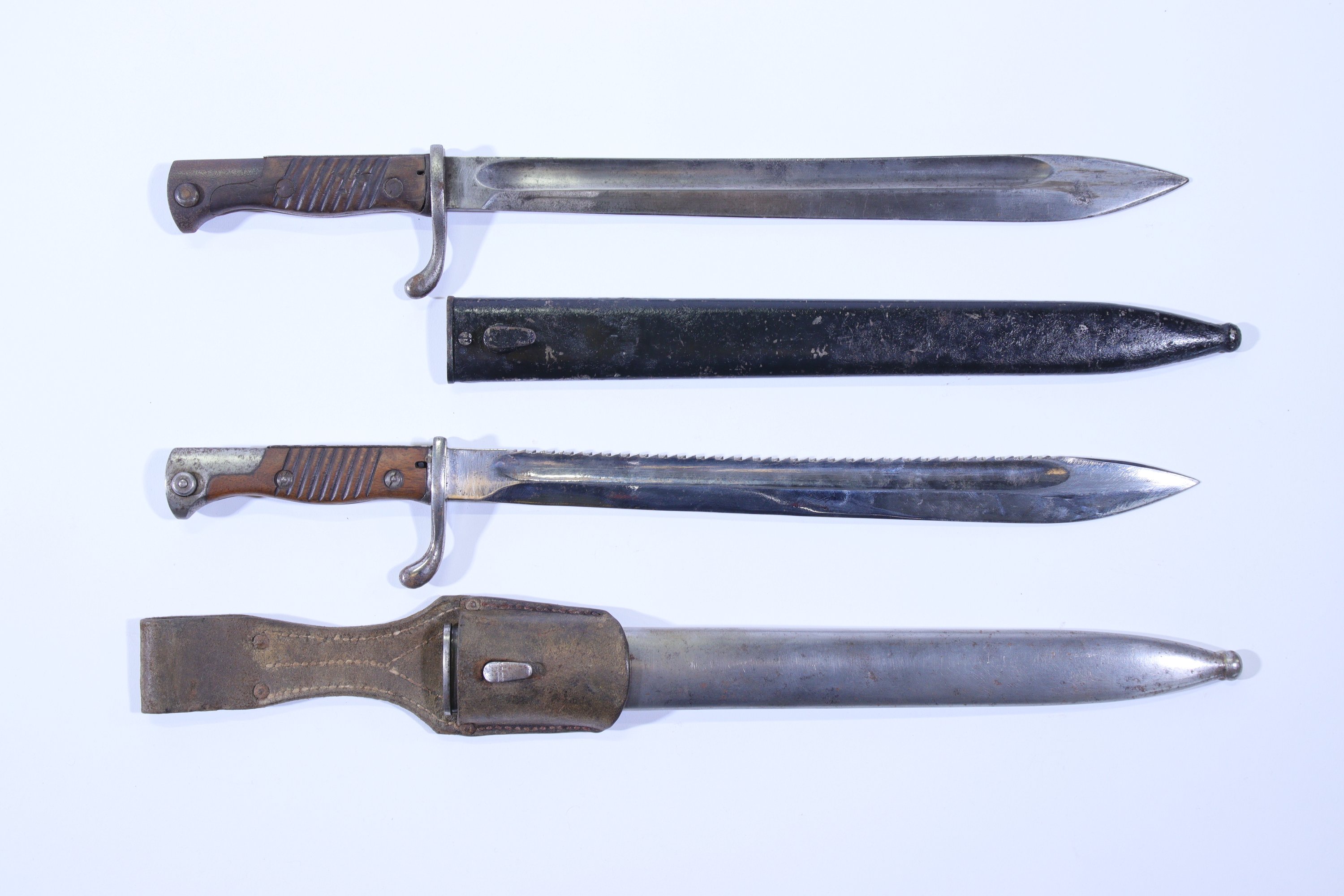 - Modèle de pionnier ou sous-officier. Lame à dos scie signée de Mundlos avec gousset en cuir.