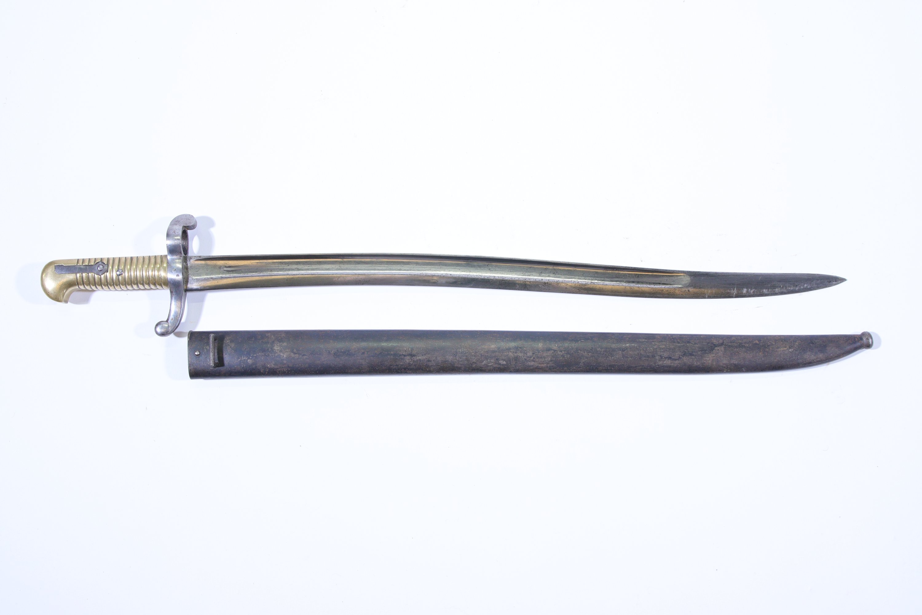 Poignée en bronze, croisière poinçonnée, bouton poussoir rond, lame de Châtellerault datée mai 1857, fourreau bronzé.