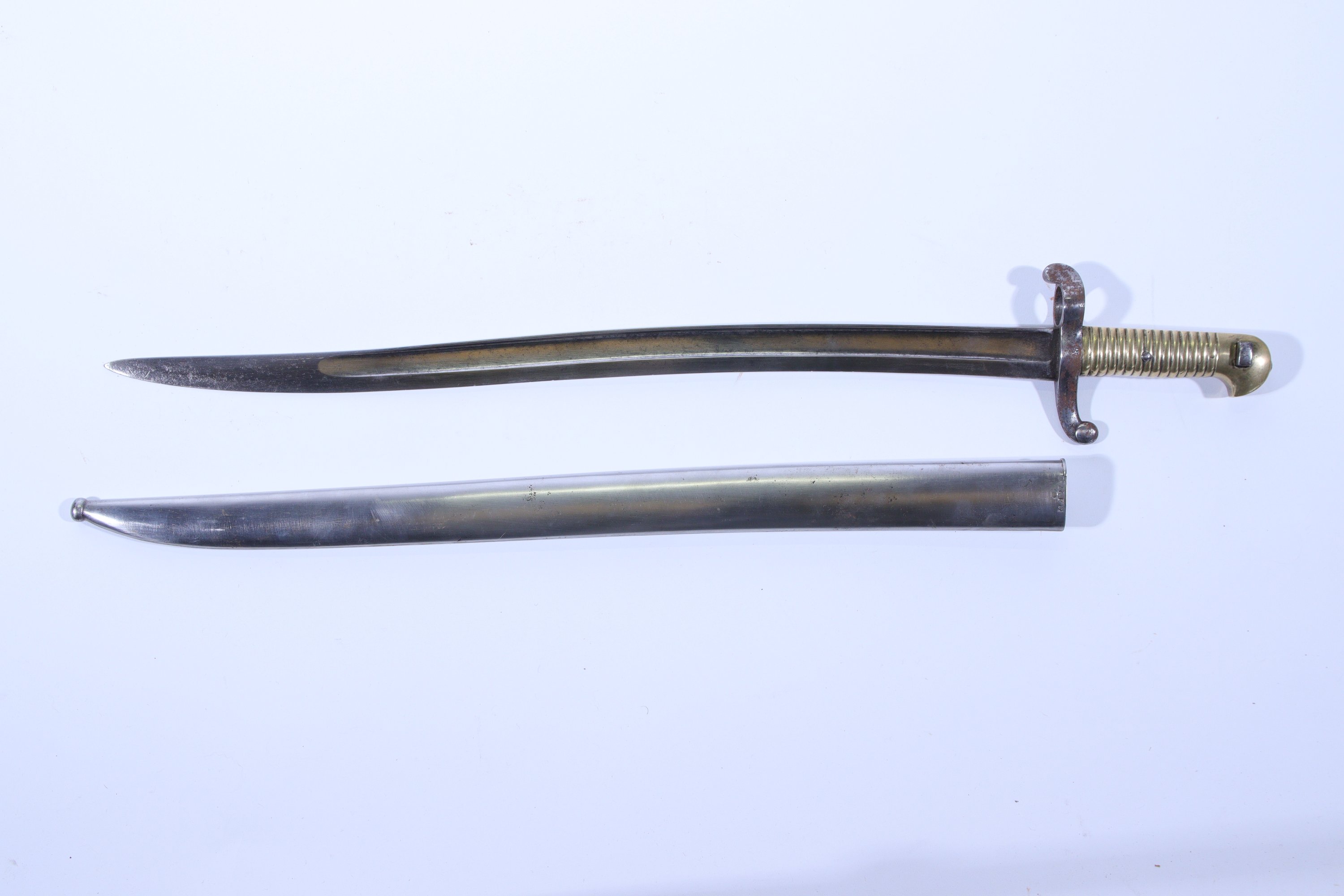 Poignée en bronze, croisière poinçonnée, bouton poussoir carré, lame de Châtellerault datée septembre 1860, fourreau en tôle de fer.