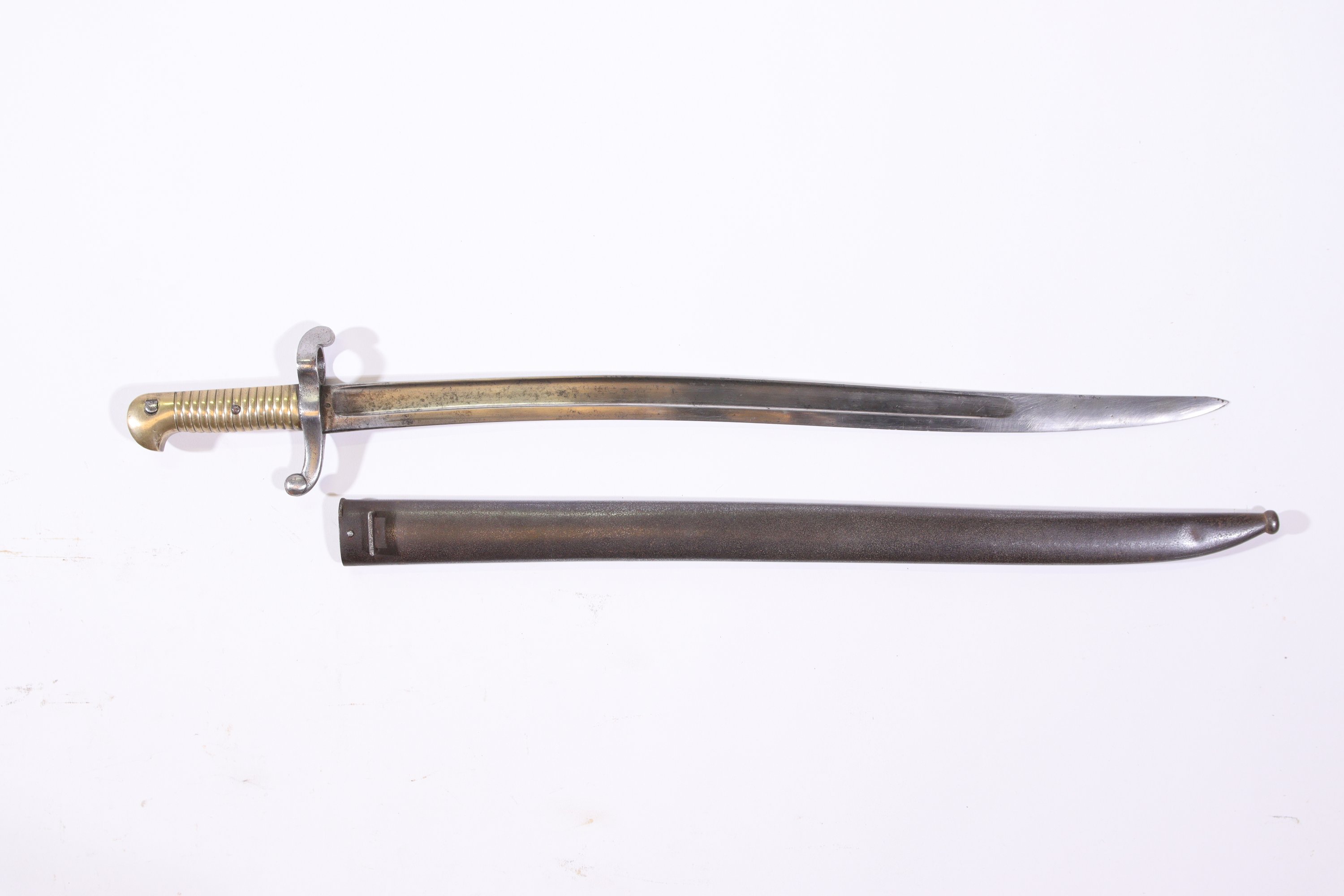Poignée en bronze, croisière poinçonnée, bouton poussoir carré, lame de Châtellerault datée mars 1865, fourreau bronzé.