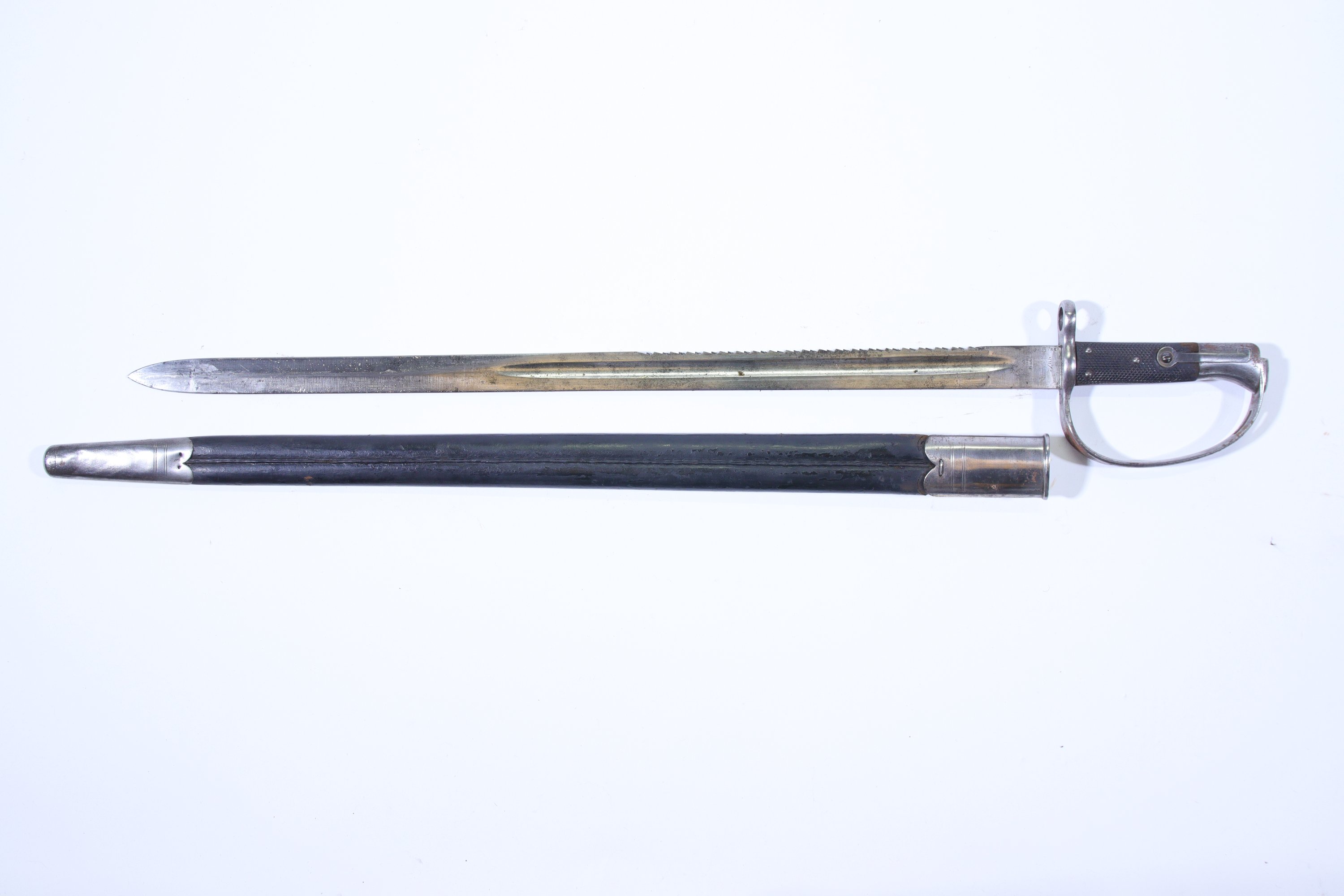 Poignée à plaquettes de caoutchouc, monture en fer lame à dos scie poinçonnée, fourreau en cuir à deux garnitures en fer.