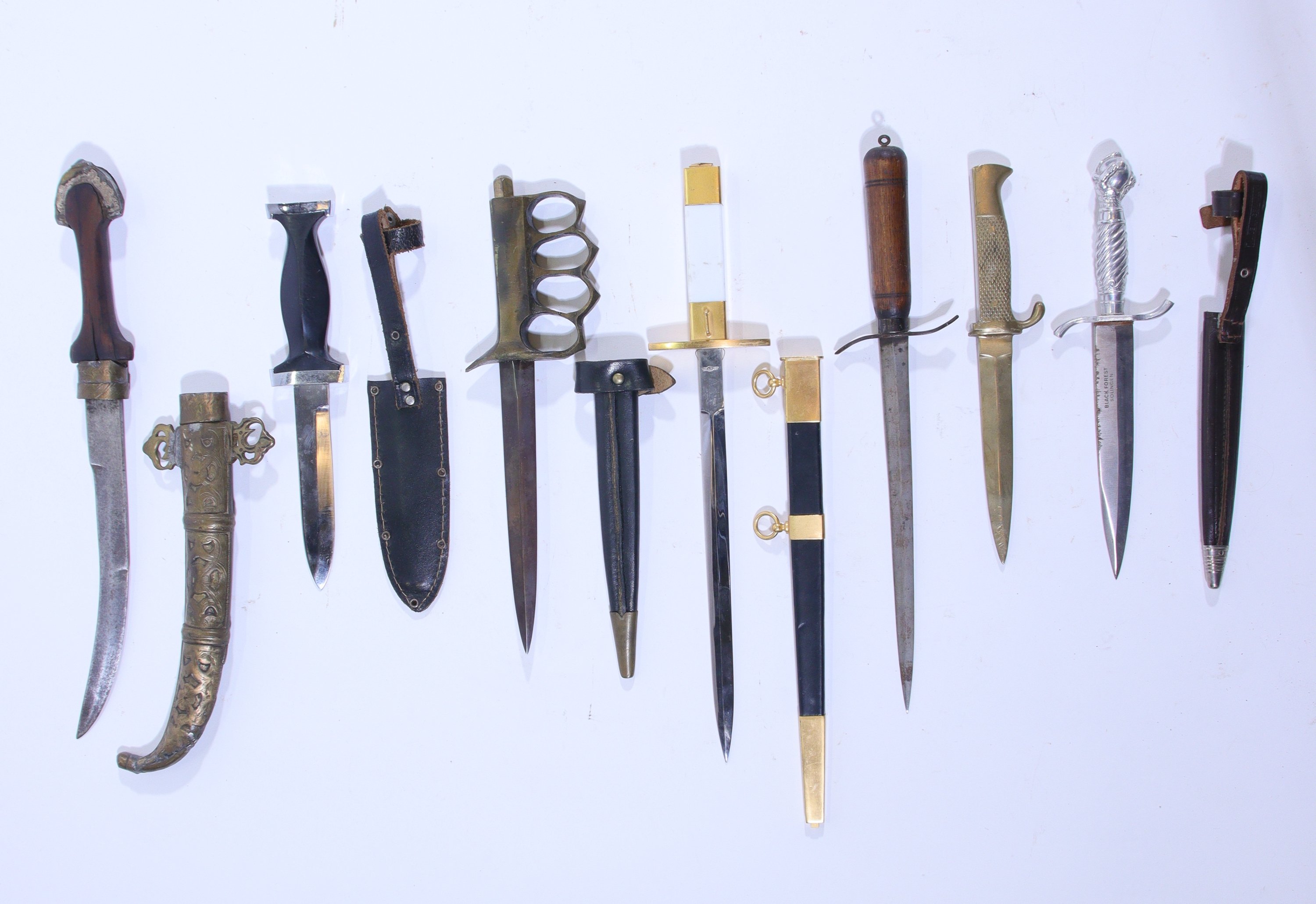 comprenant une copie de couteau de tranchée modèle 1918, quatre poignards et dagues, un poignard Koumia et une dague d’officier d’armée de l’air modèle 1934, fusée blanche et lame Ambert 91-76.