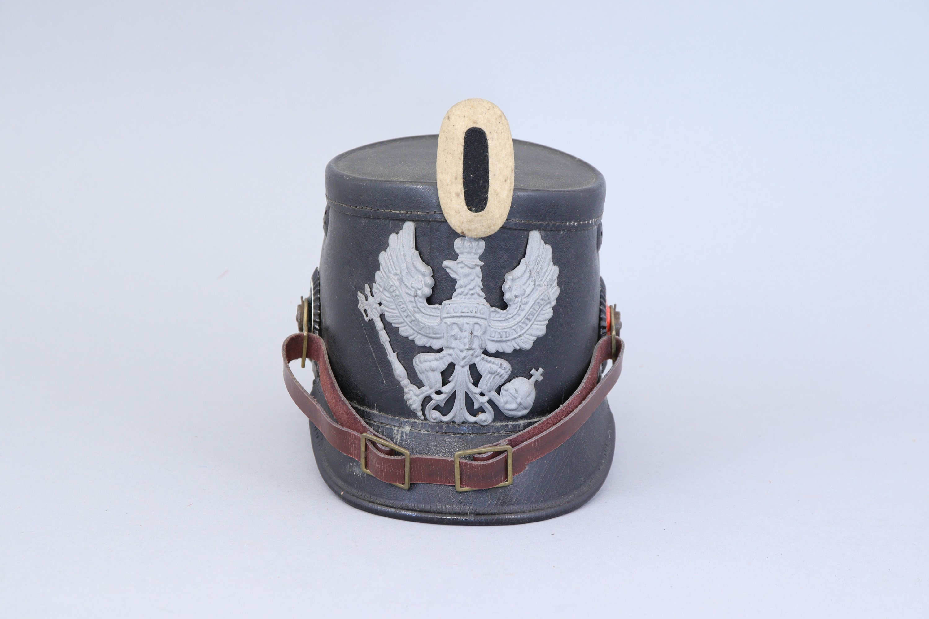 En cuir, plaque à l’aigle peinte en grise, cocardes et jugulaires postérieures.