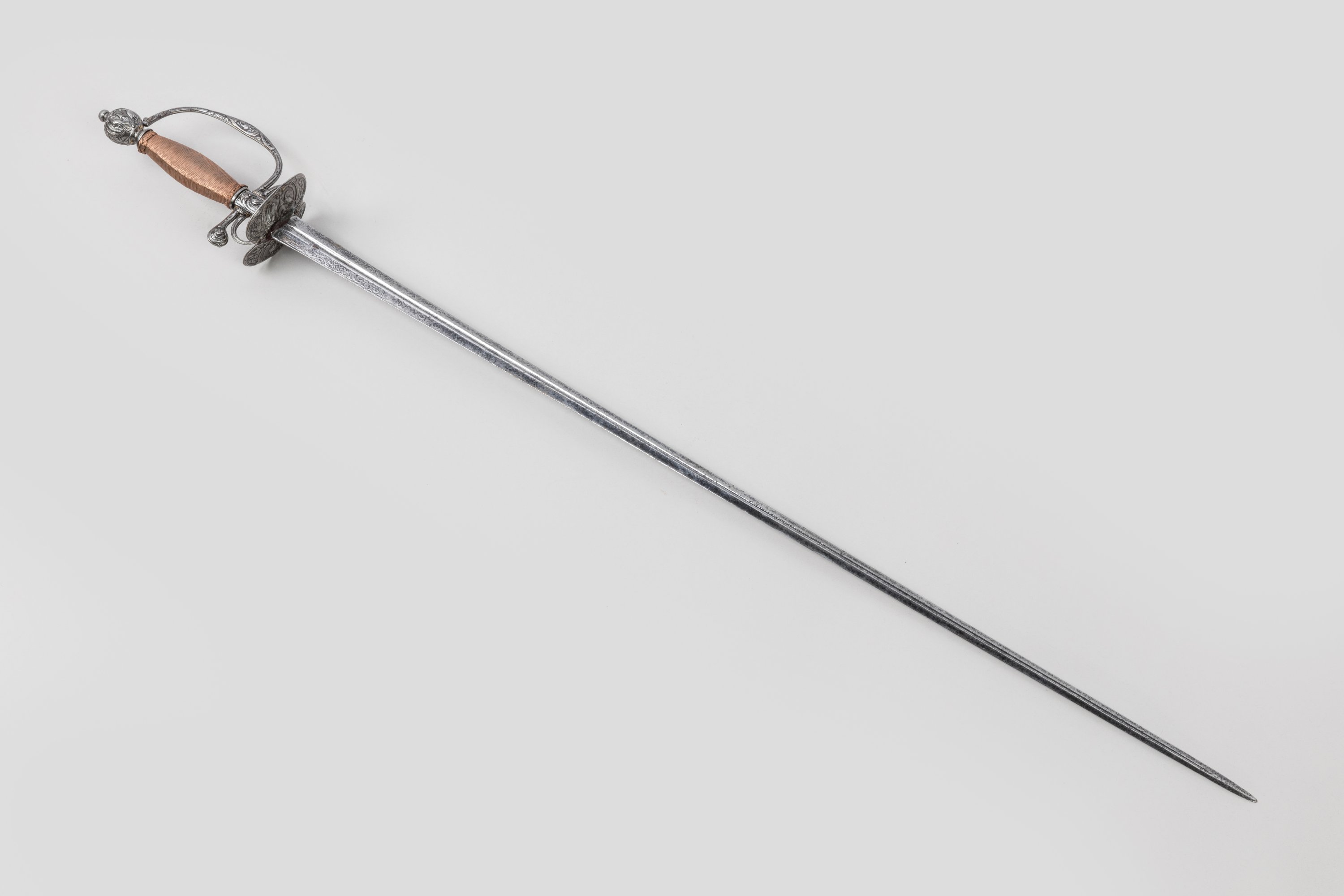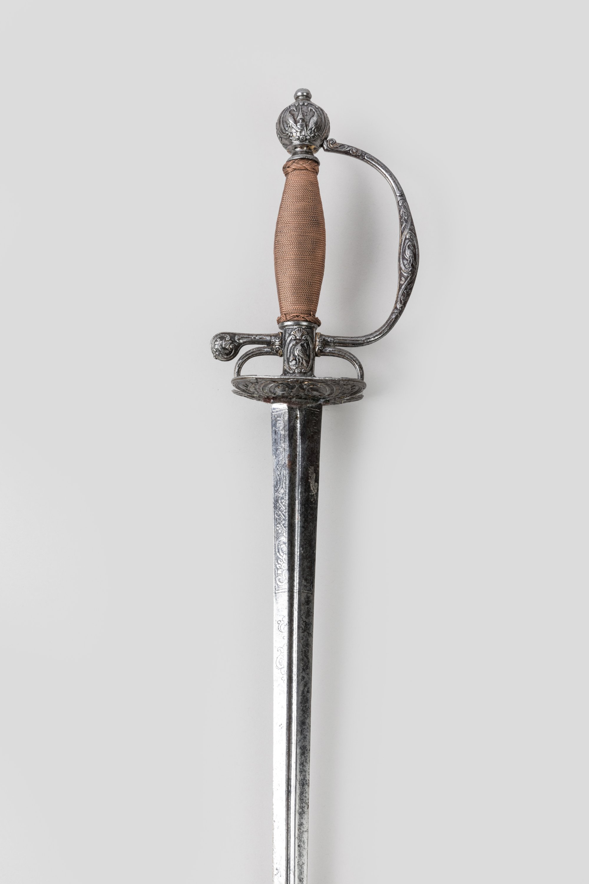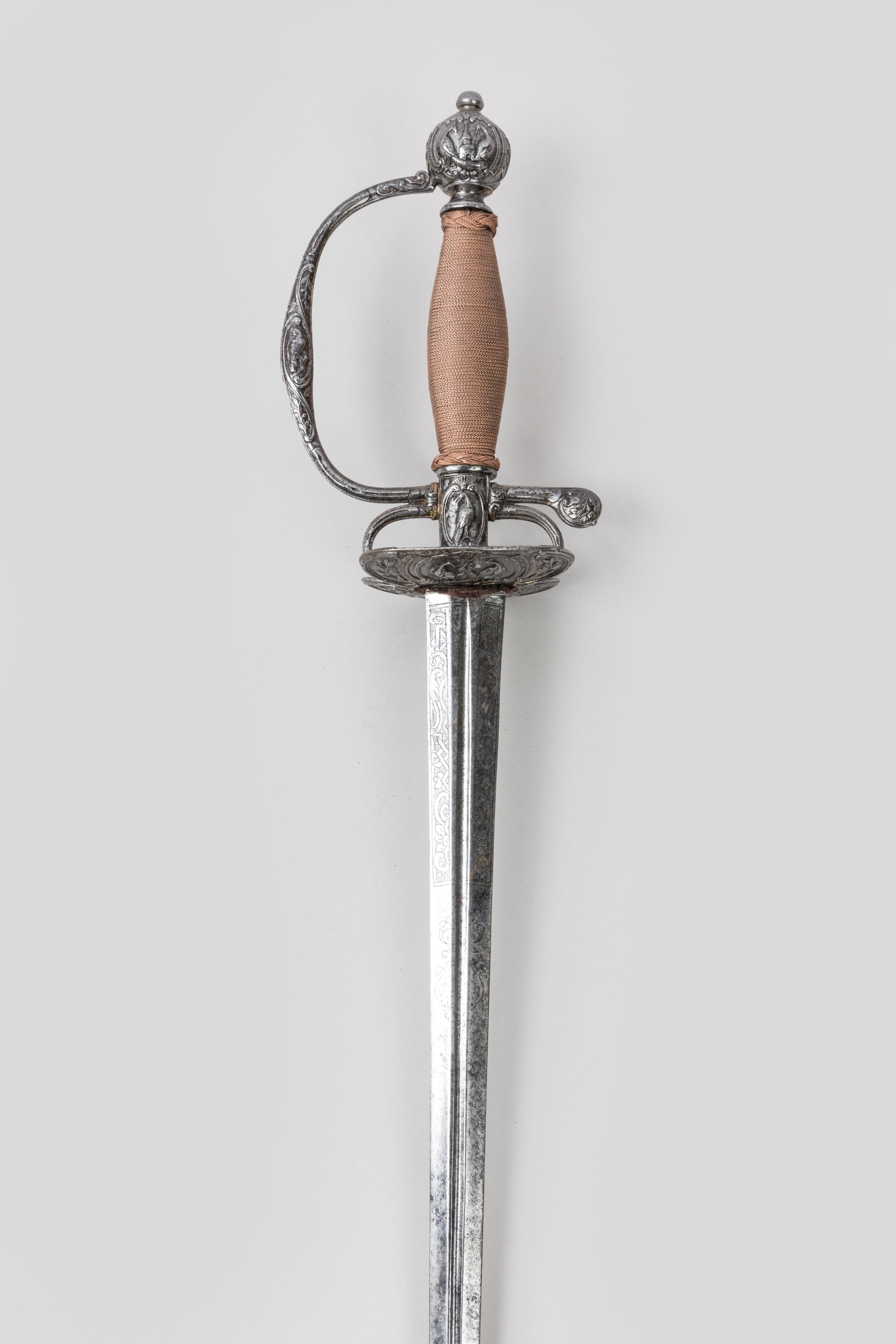 Monture en fer ciselé à décor d’oiseaux encadrant un temple. Fusée filigranée de cuivre. Garde à une branche, pas d’âne et coquille bivalve. Lame à gorge médiane, gravée au talon.